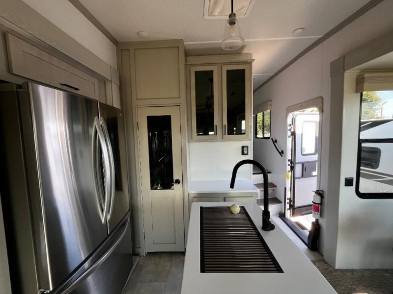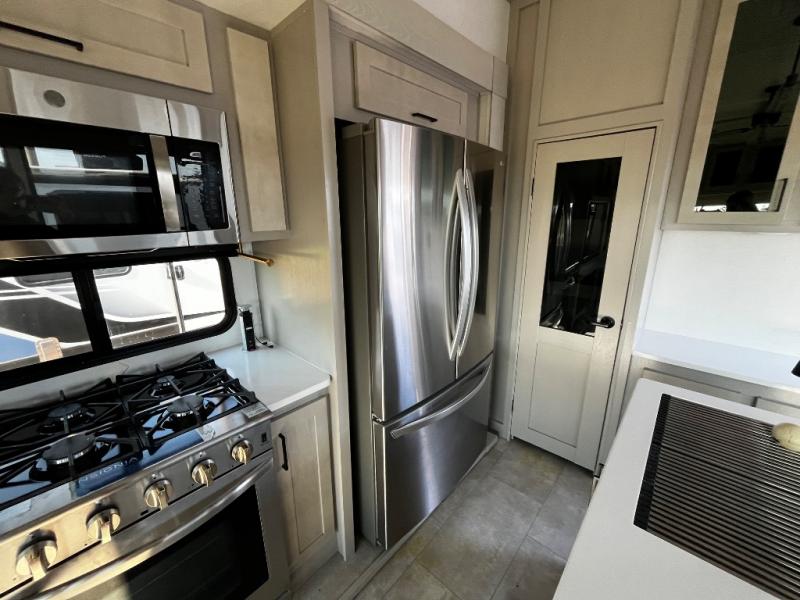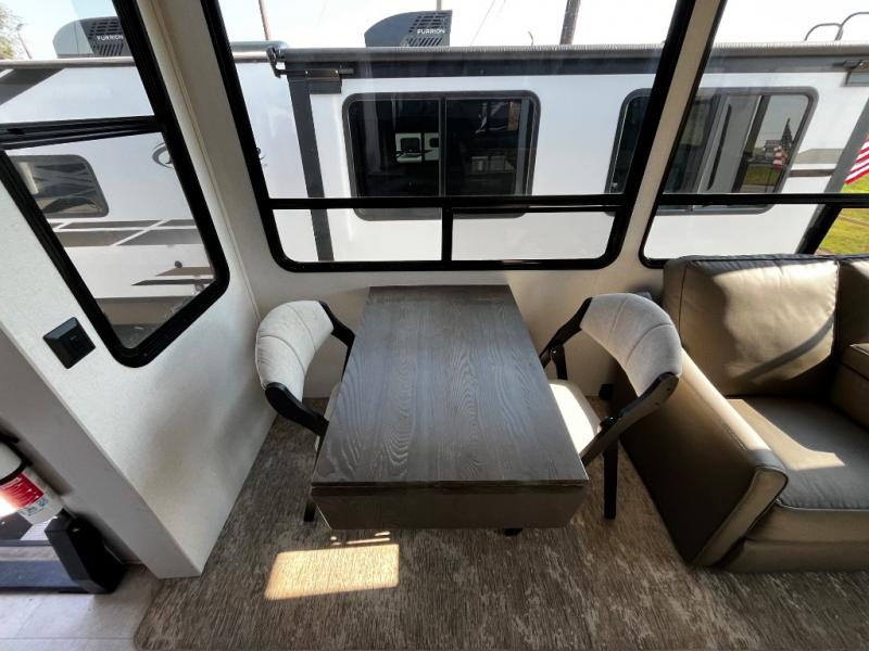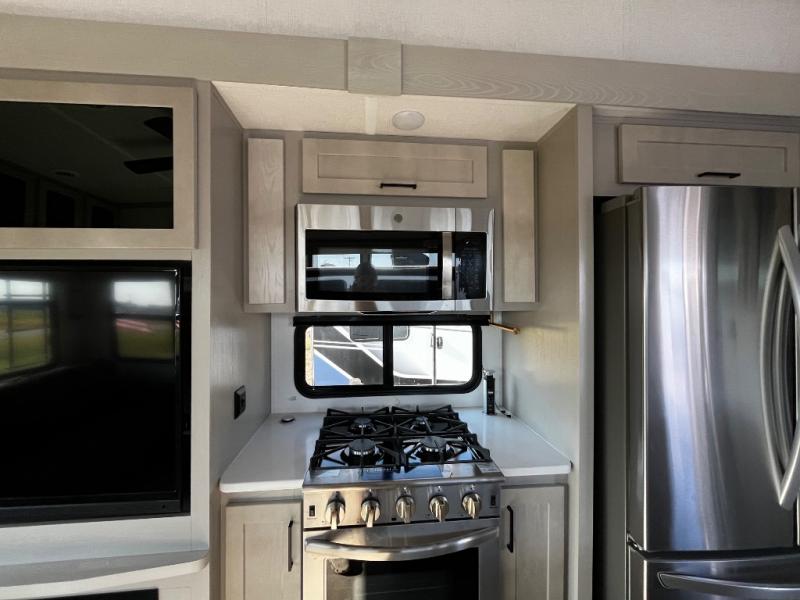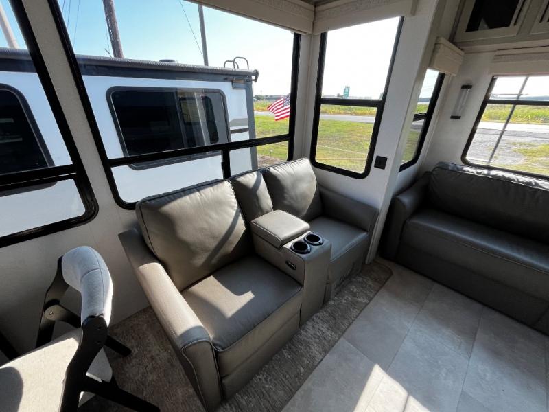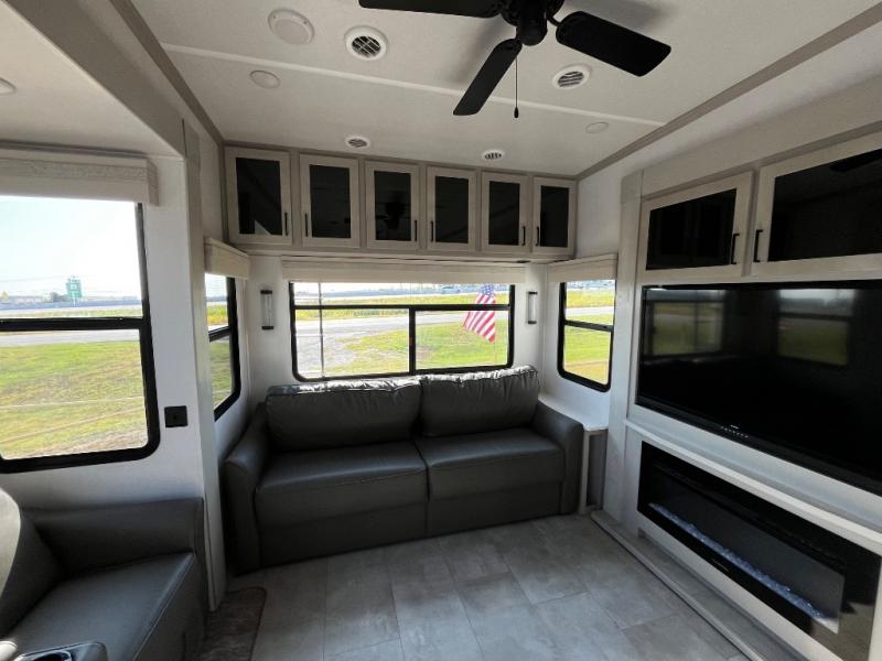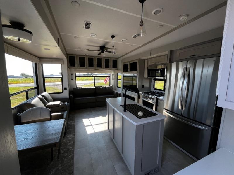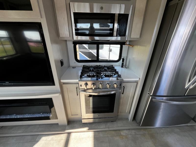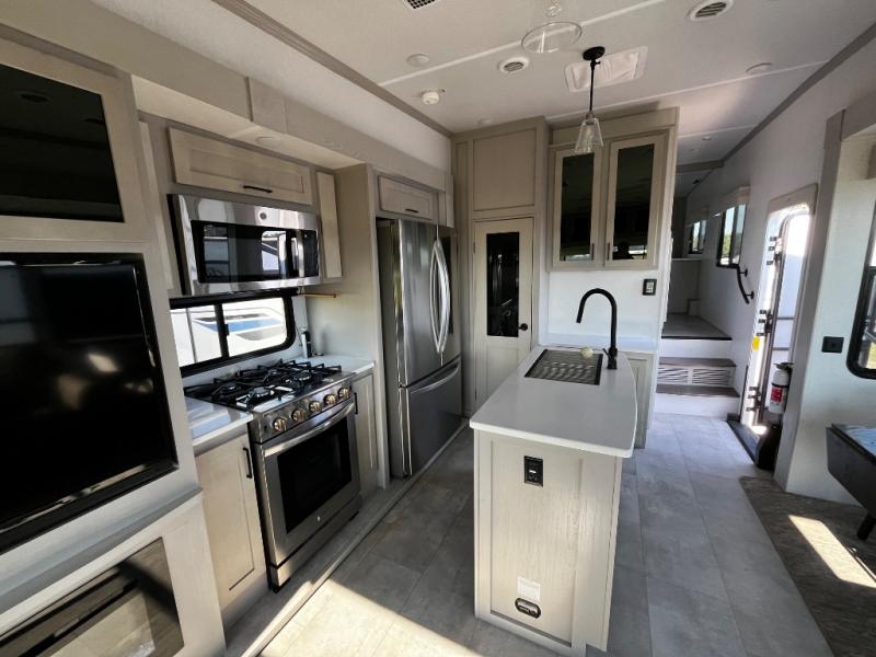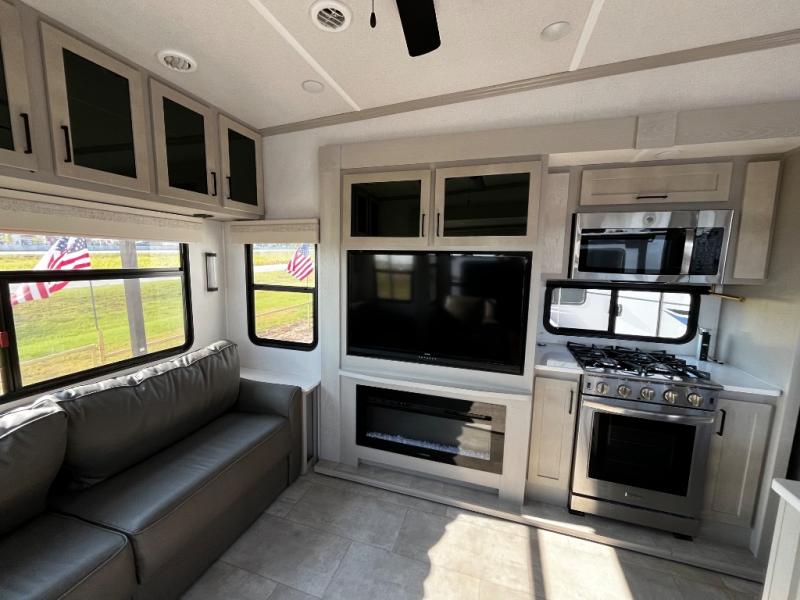 Experience a true home away from home in this fifth wheel! With a rear living area featuring an entertainment center with a fireplace and 50" TV with JBL sound system, a 88" split tri-fold sofa, and a 65" power theater seating, you can be sure to have a relaxing evening. The kitchen island makes meal prepping easier and the four burner Insignia cooktop lets you cook more at one time. Once your meal is ready, head to the table and chairs to enjoy it there then maybe play a card game or two. The full bathroom not only has a large signature spa shower with a a teak flip up seat, a linen area, and a closet, but also a dual sink vanity for two to get ready at once. You will feel right at home in the front private bedroom with the king bed slide across from the dresser with a 32" TV, and a front wardrobe with mirrored sliding doors which is also prepped to add an optional washer and dryer!
