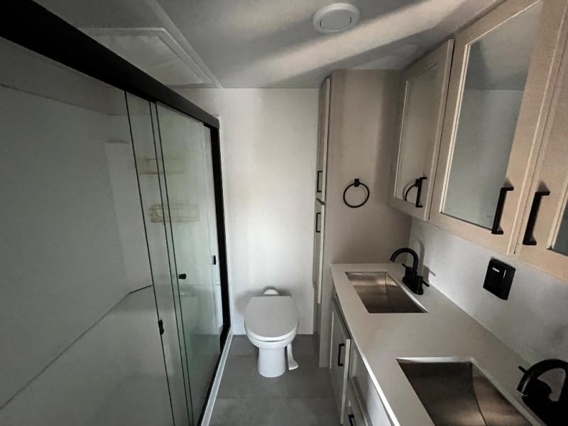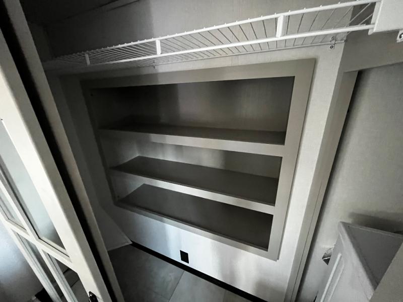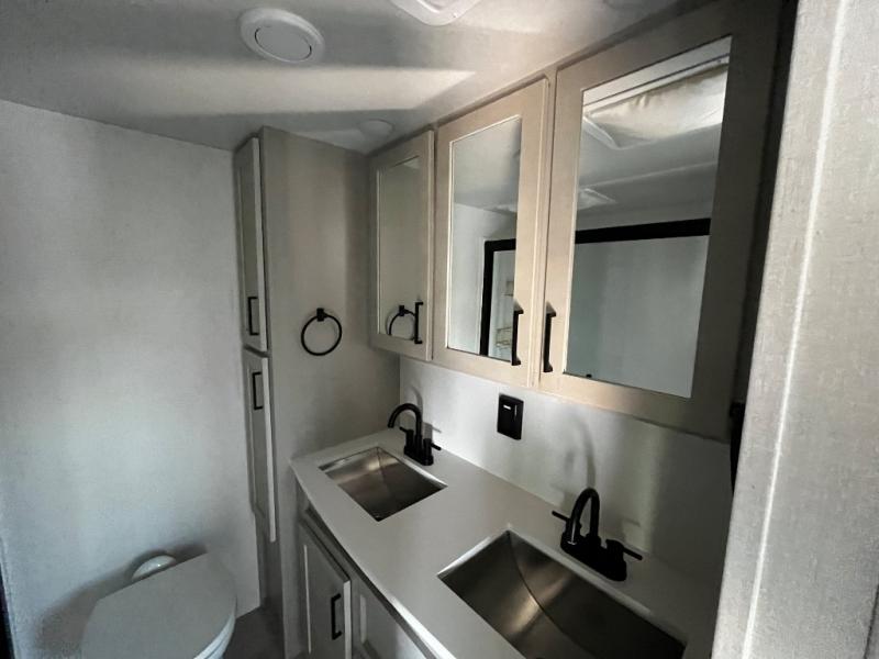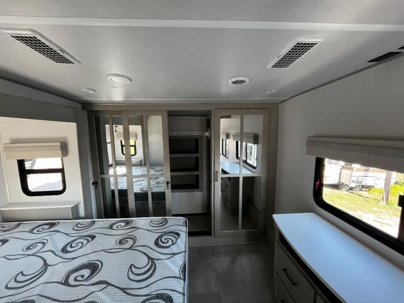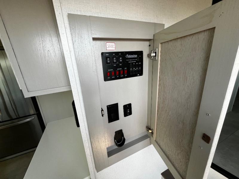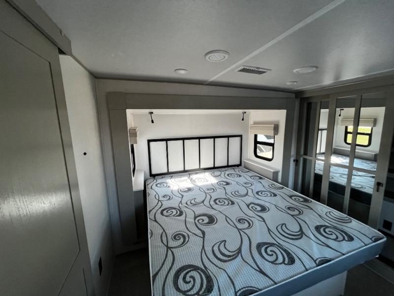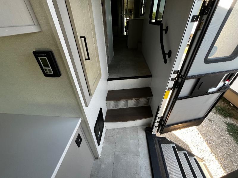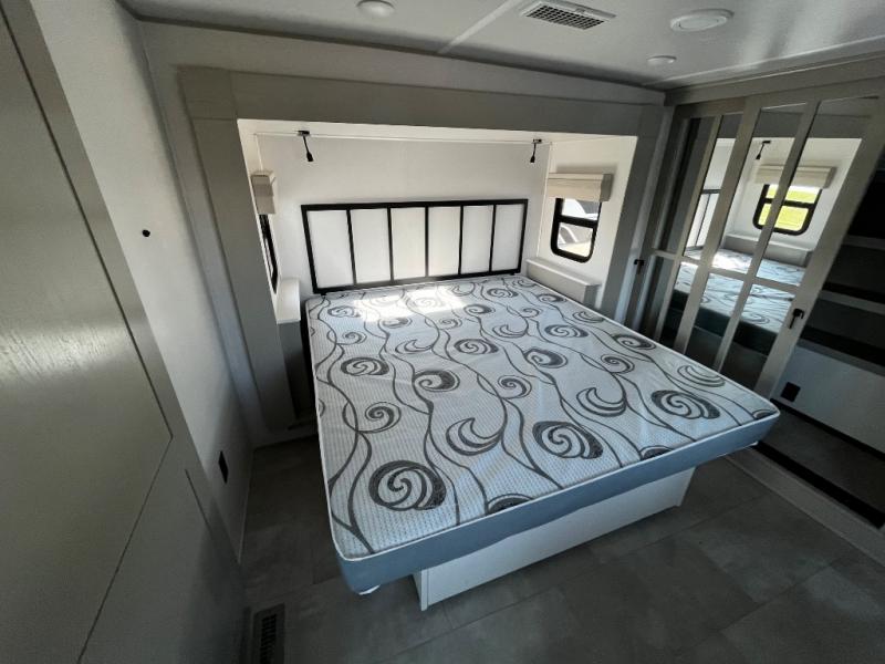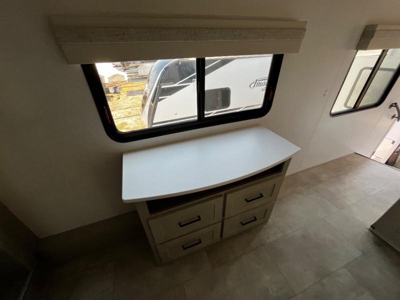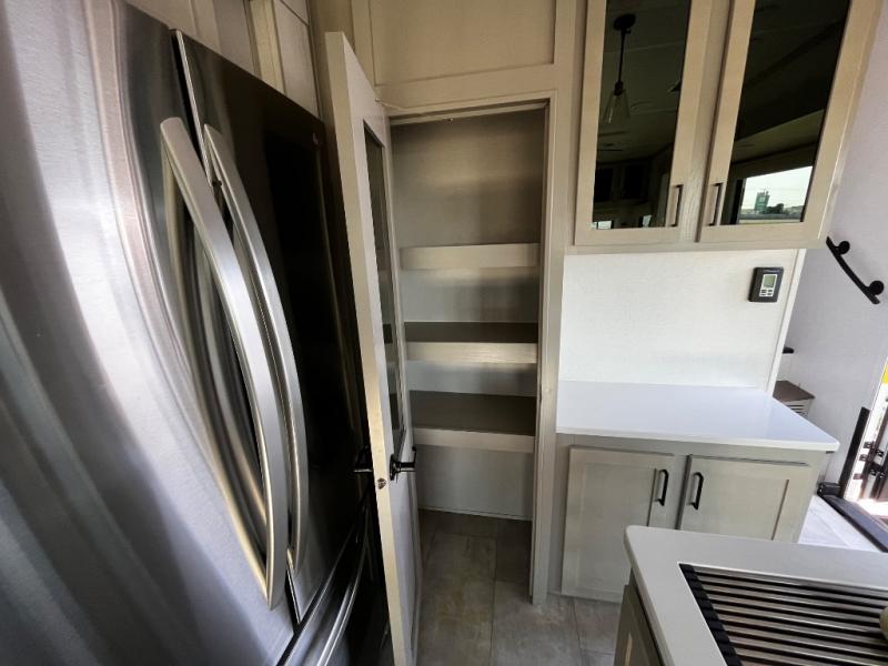 Experience a true home away from home in this fifth wheel! With a rear living area featuring an entertainment center with a fireplace and 50" TV with JBL sound system, a 88" split tri-fold sofa, and a 65" power theater seating, you can be sure to have a relaxing evening. The kitchen island makes meal prepping easier and the four burner Insignia cooktop lets you cook more at one time. Once your meal is ready, head to the table and chairs to enjoy it there then maybe play a card game or two. The full bathroom not only has a large signature spa shower with a a teak flip up seat, a linen area, and a closet, but also a dual sink vanity for two to get ready at once. You will feel right at home in the front private bedroom with the king bed slide across from the dresser with a 32" TV, and a front wardrobe with mirrored sliding doors which is also prepped to add an optional washer and dryer!