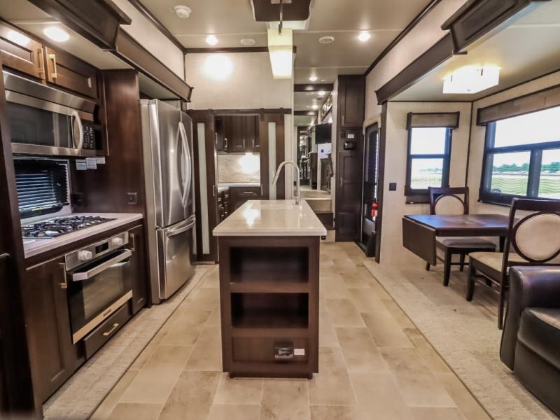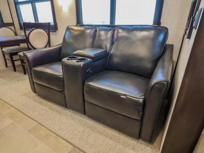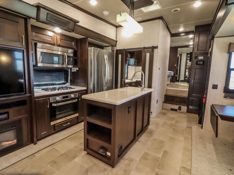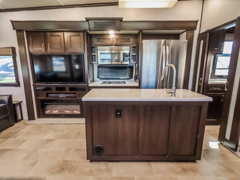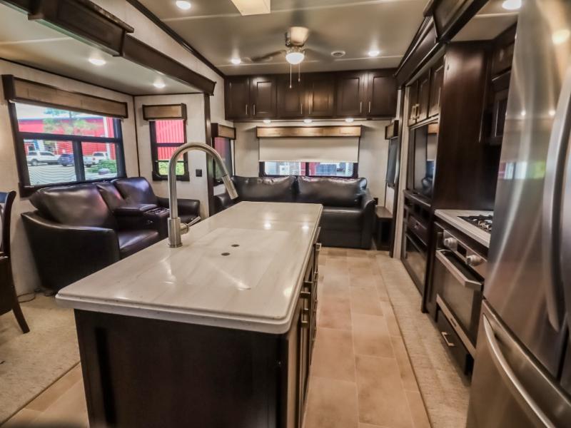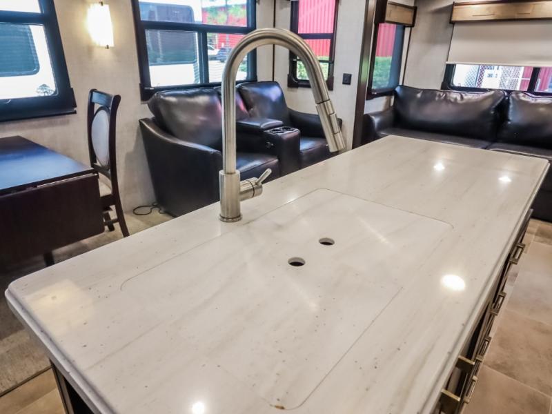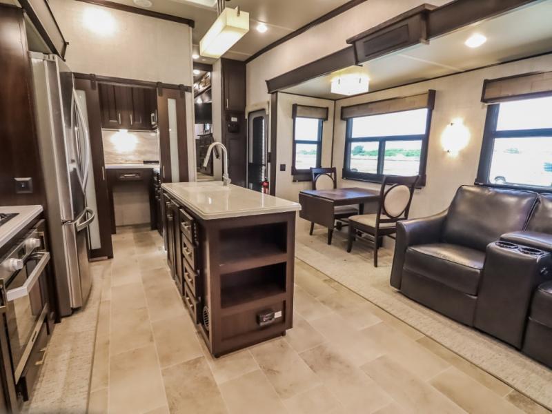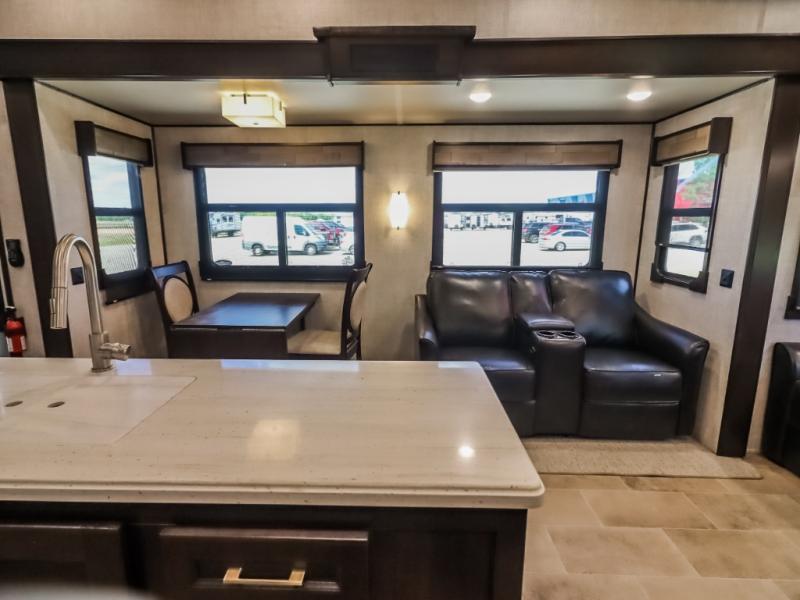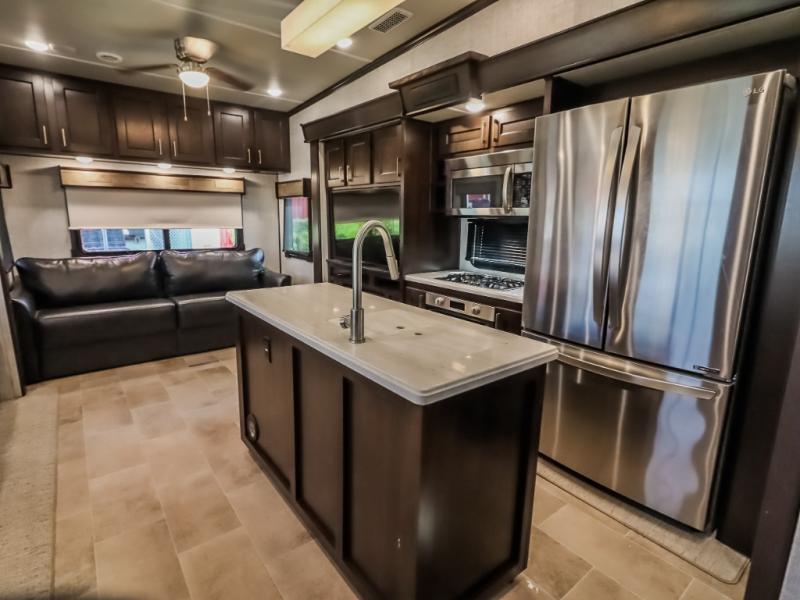 You will be the talk of the campground with this fifth wheel! Its unique butler pantry is perfect for entertaining guests with the U-shaped counter, overhead cabinets to store your drinkware, and cooler to keep your beverages cold while still leaving space in the 20 cu. ft. stainless steel refrigerator for your perishables. You can have game night indoors at the table and chairs or set up a table and chairs underneath the two power awnings. The rear living area offers a comfortable place to watch the big game too with a 88" split tri-fold sofa and 65" power theater seating directly across from the entertainment center with an electric fireplace and 50" TV with JBL sound system. Two can get ready at once in the front bathroom with the dual sink vanity and you can even add an optional washer and dryer!