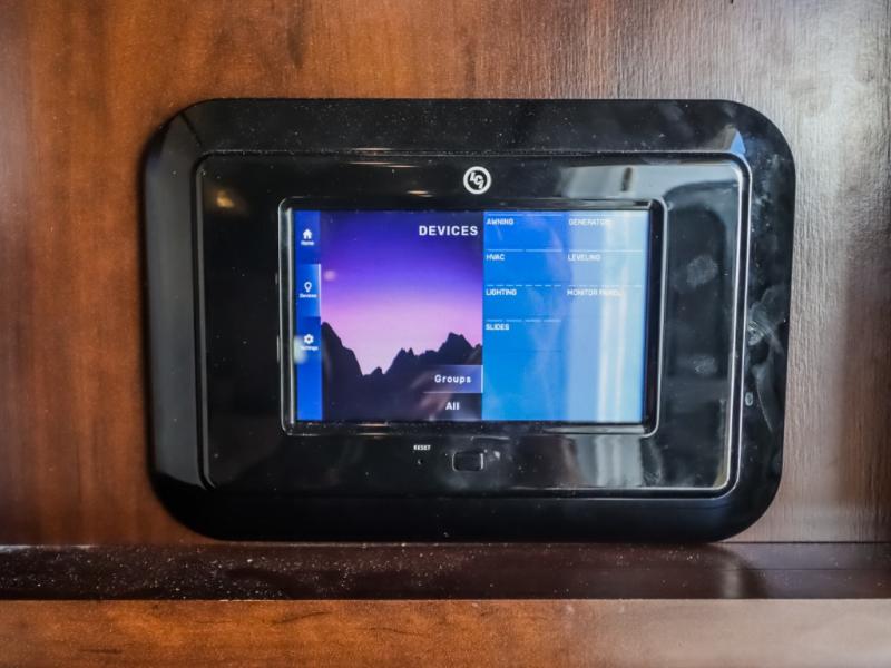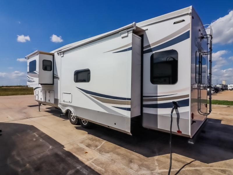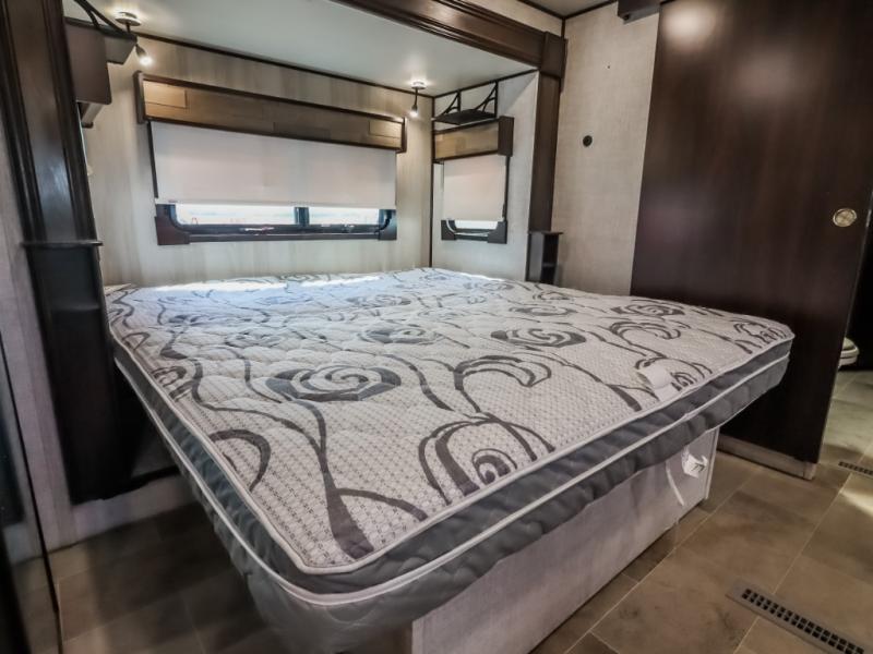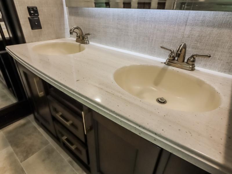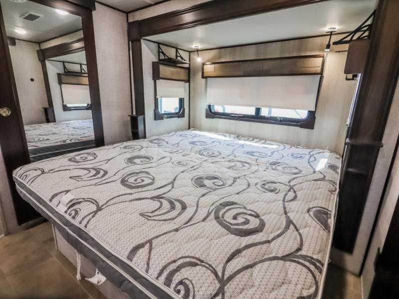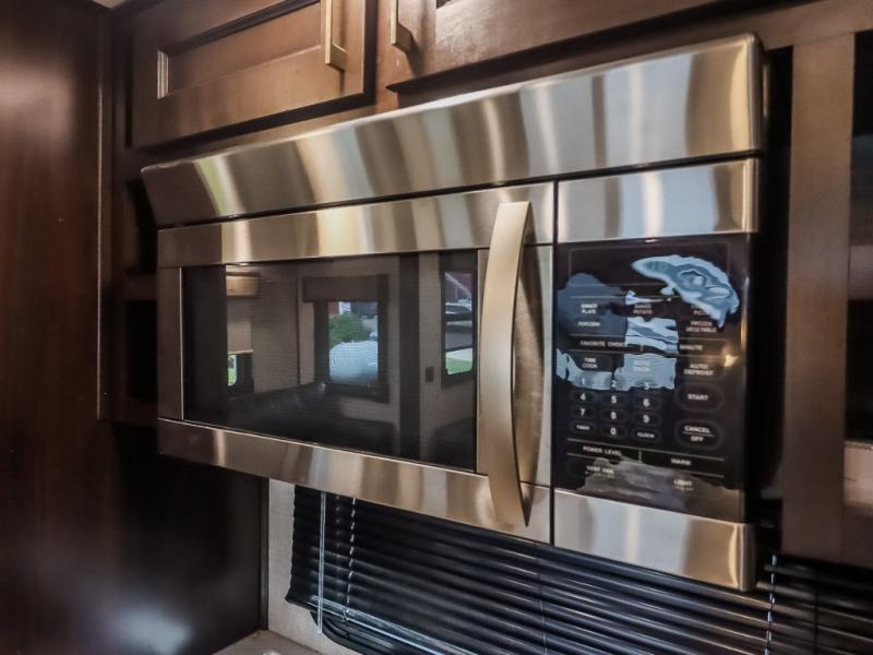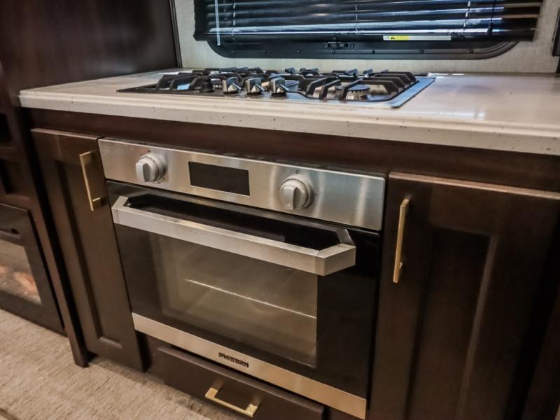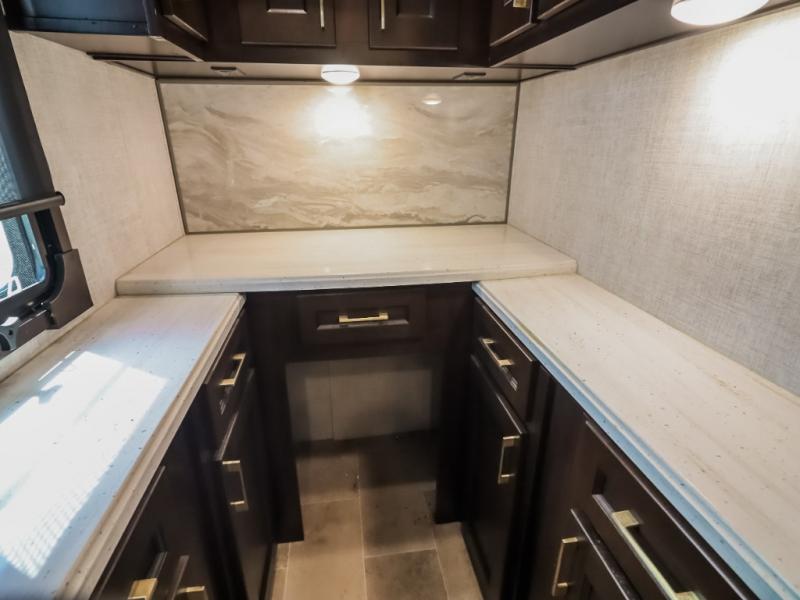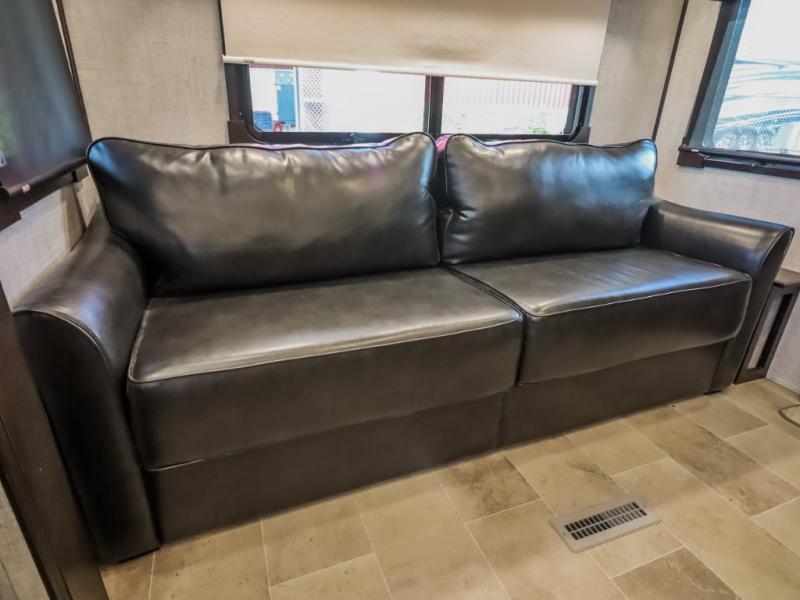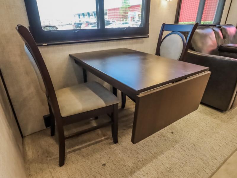 You will be the talk of the campground with this fifth wheel! Its unique butler pantry is perfect for entertaining guests with the U-shaped counter, overhead cabinets to store your drinkware, and cooler to keep your beverages cold while still leaving space in the 20 cu. ft. stainless steel refrigerator for your perishables. You can have game night indoors at the table and chairs or set up a table and chairs underneath the two power awnings. The rear living area offers a comfortable place to watch the big game too with a 88" split tri-fold sofa and 65" power theater seating directly across from the entertainment center with an electric fireplace and 50" TV with JBL sound system. Two can get ready at once in the front bathroom with the dual sink vanity and you can even add an optional washer and dryer!