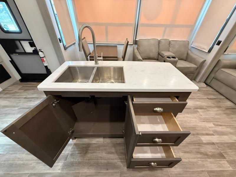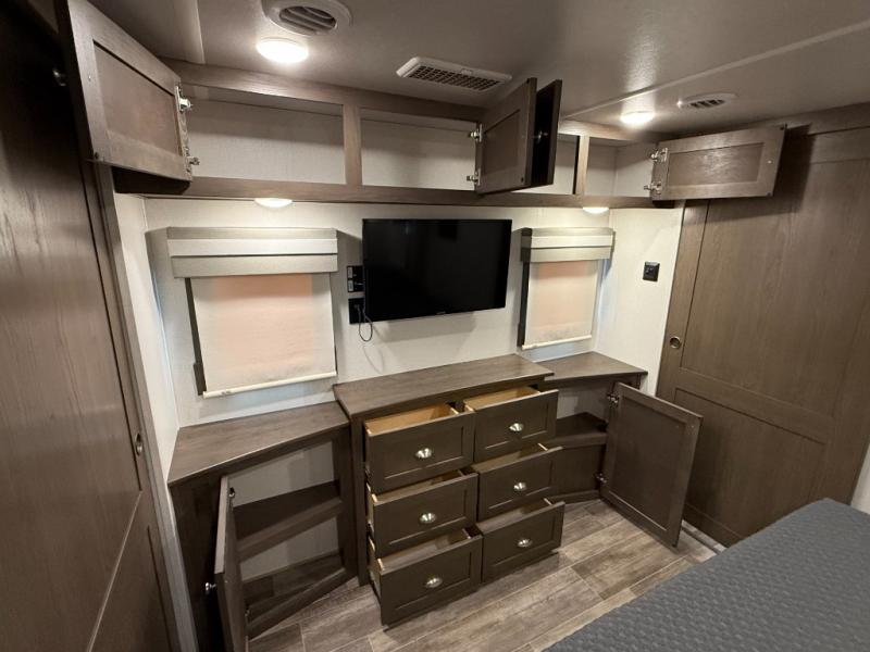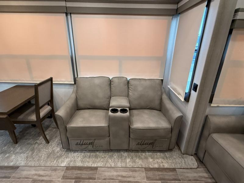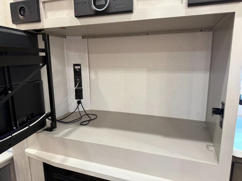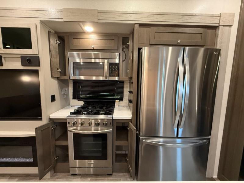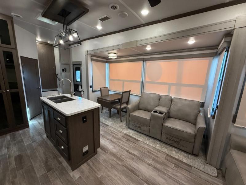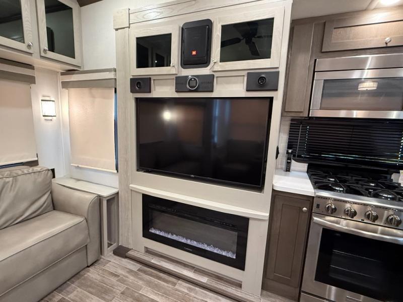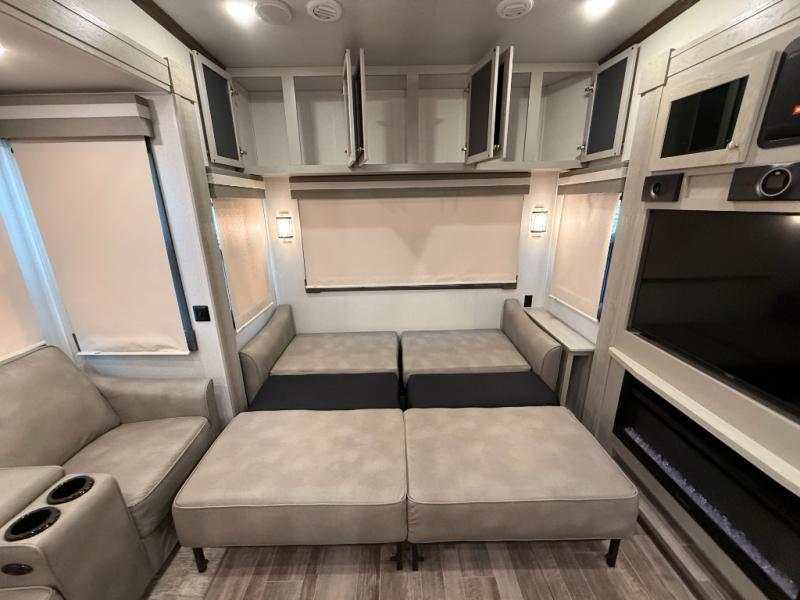 Living Area: Rear living, which gives a spacious, more lounge-like feel. Includes theater seating, big TV, fireplace in many units.