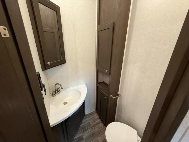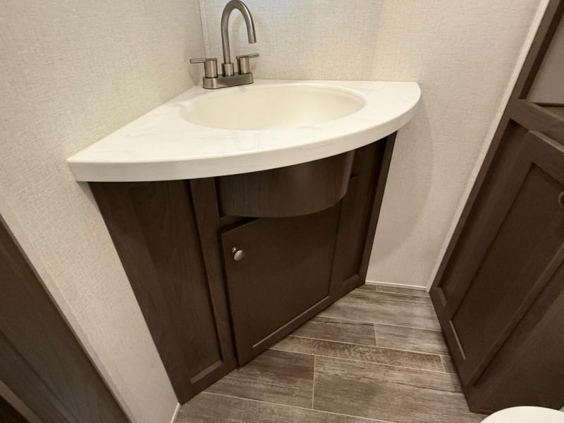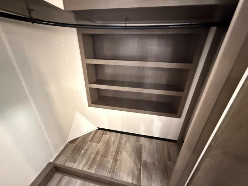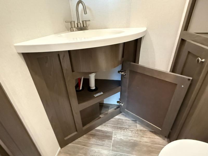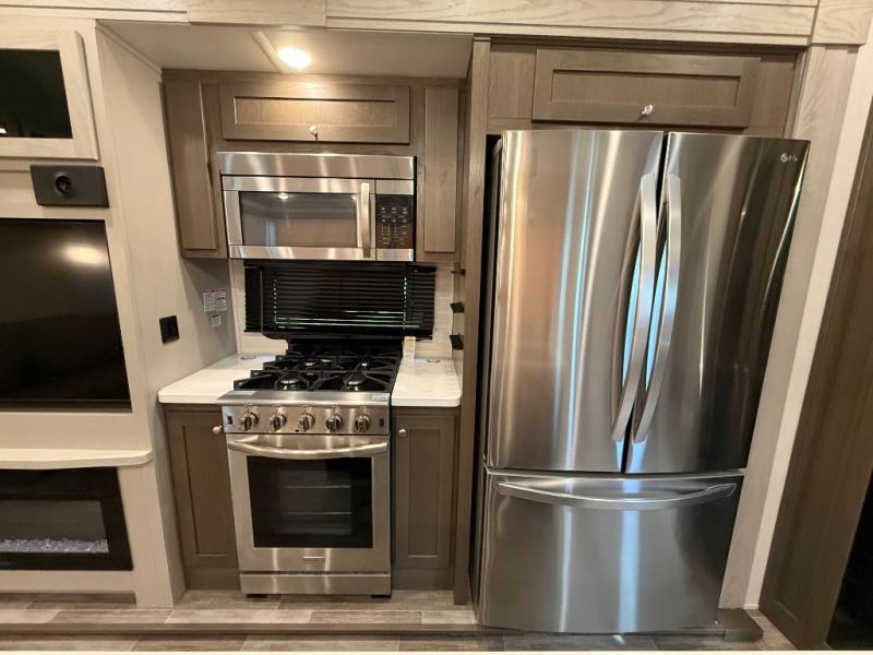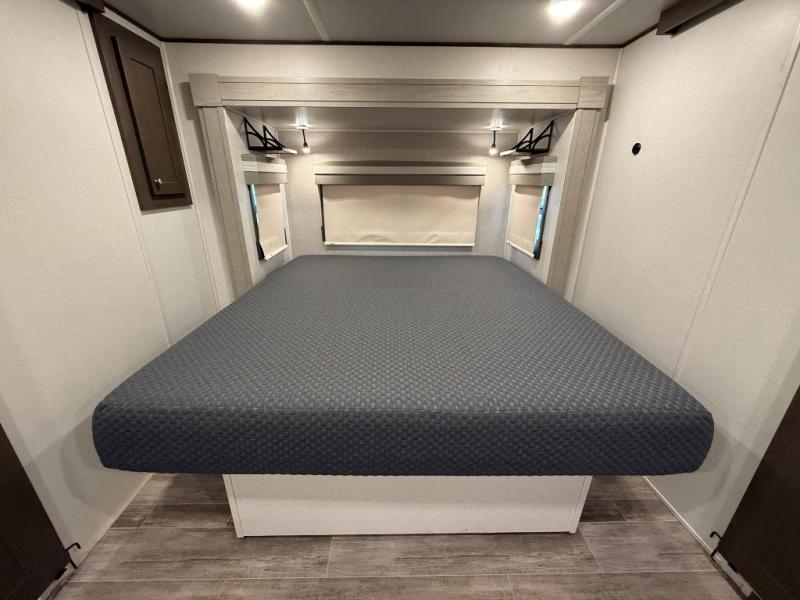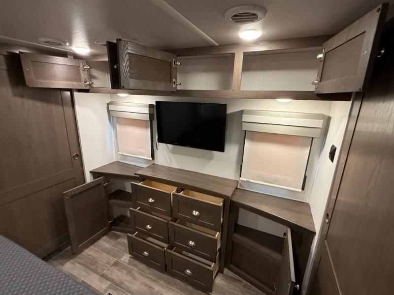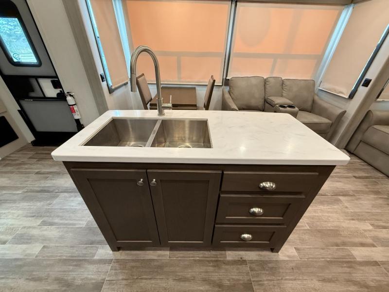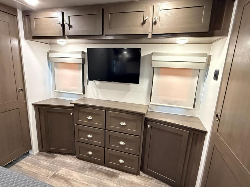 Living Area: Rear living, which gives a spacious, more lounge-like feel. Includes theater seating, big TV, fireplace in many units.