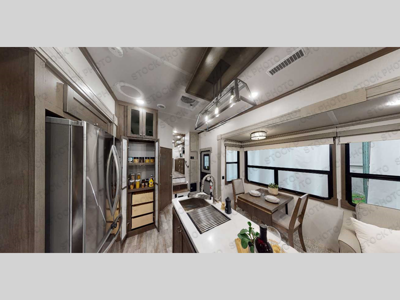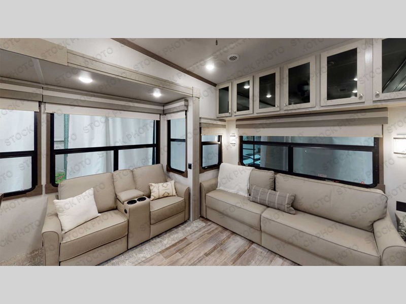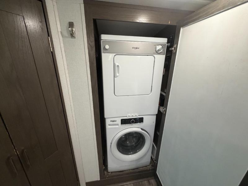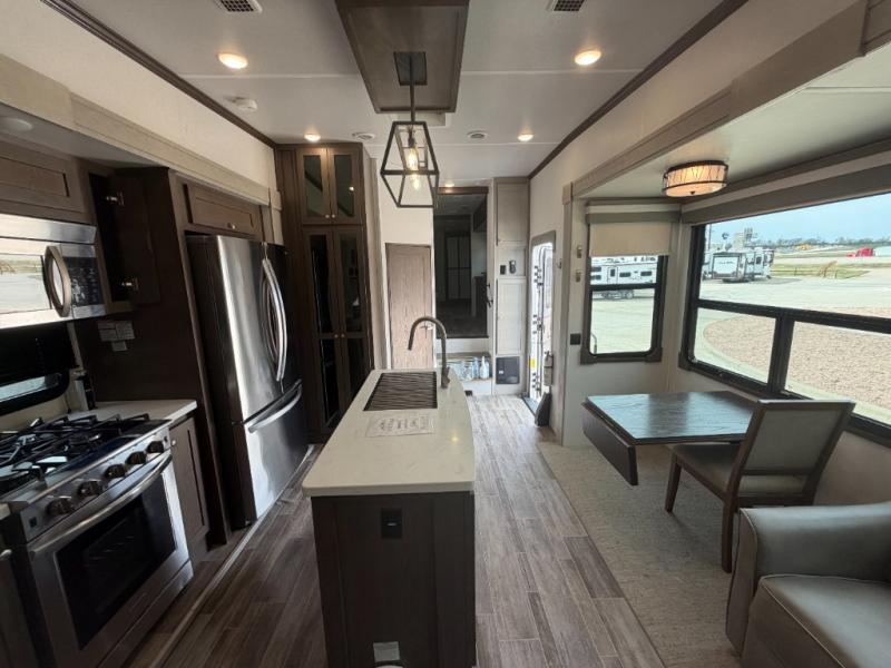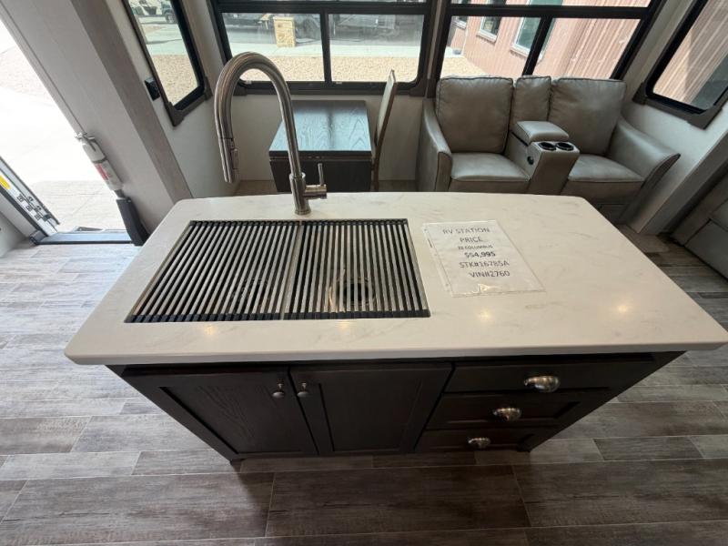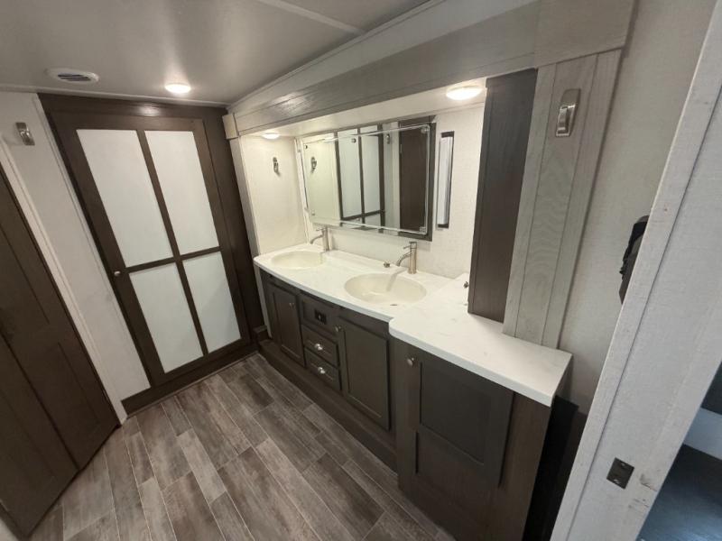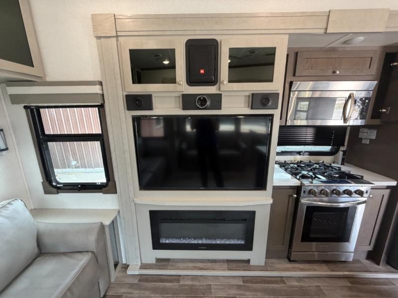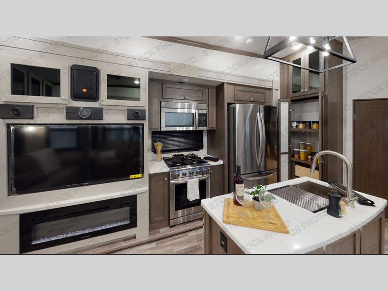 Everyone will stay clean with a bath and a half in this fifth wheel! The kitchen has a pantry big enough for everyone's favorite snacks, a four burner Insignia cooktop, and a kitchen island to prepare your best meals. You can have game night indoors at the table and chairs or set up a table and chairs underneath the two power awnings. The rear living area offers a comfortable place to watch the big game too with a 88" split tri-fold sofa and 65" power theater seating directly across from the entertainment center which has overhead cabinets with hidden storage, an electric fireplace, and a 50" TV with JBL sound system. Two can get ready at once in the front bathroom with the dual sink vanity and you can even add an optional washer and dryer!
