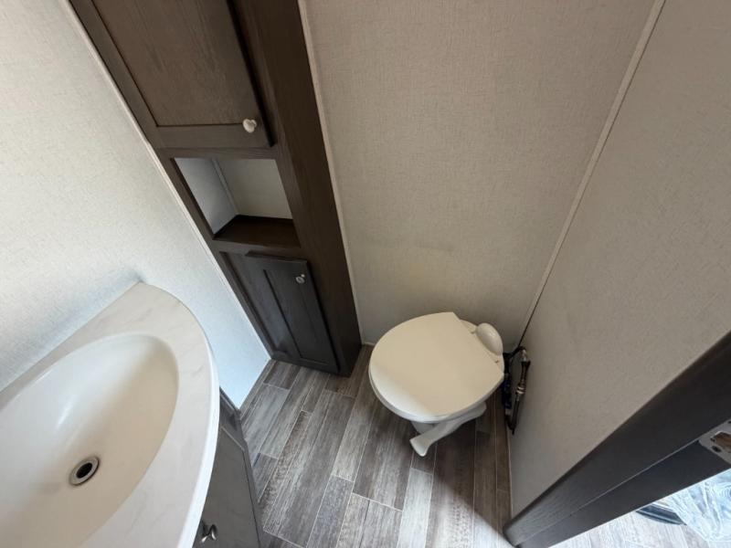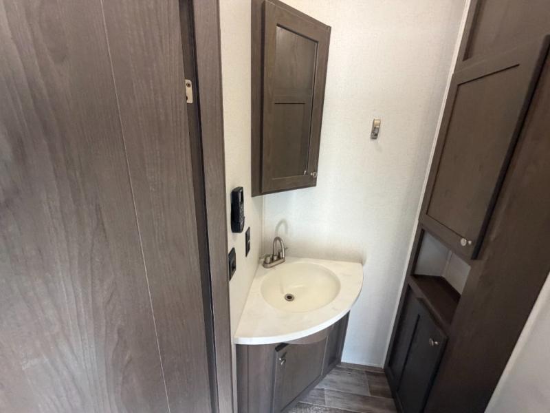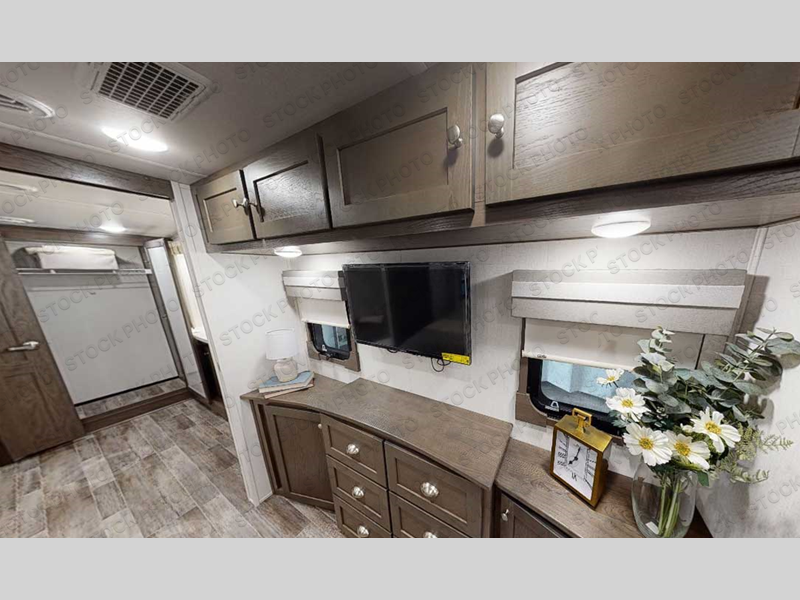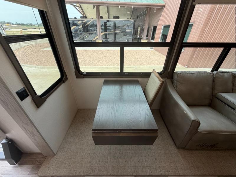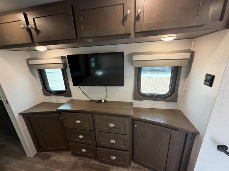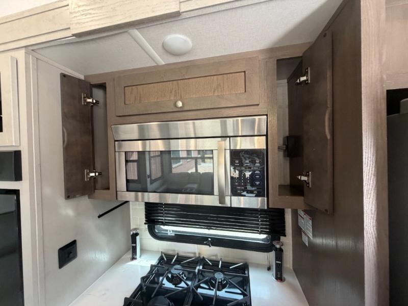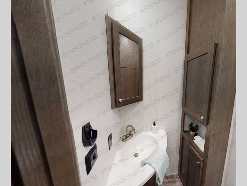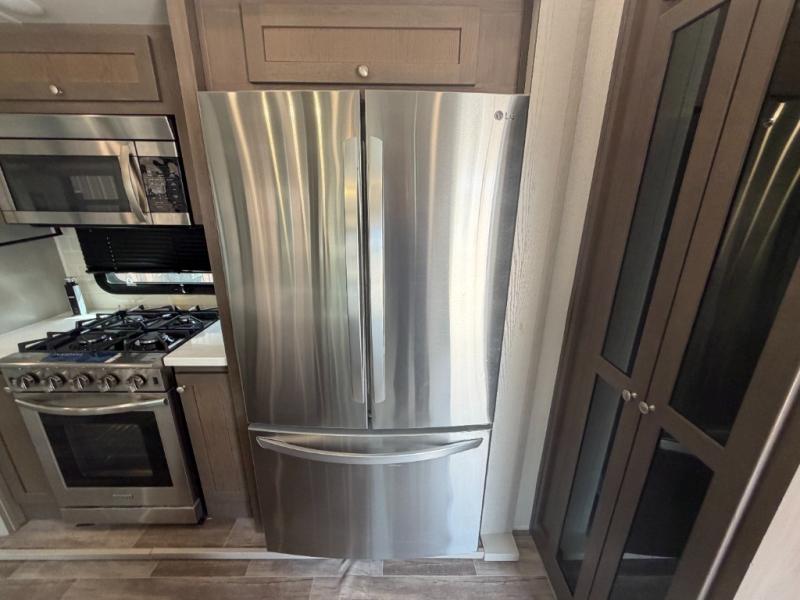 Everyone will stay clean with a bath and a half in this fifth wheel! The kitchen has a pantry big enough for everyone's favorite snacks, a four burner Insignia cooktop, and a kitchen island to prepare your best meals. You can have game night indoors at the table and chairs or set up a table and chairs underneath the two power awnings. The rear living area offers a comfortable place to watch the big game too with a 88" split tri-fold sofa and 65" power theater seating directly across from the entertainment center which has overhead cabinets with hidden storage, an electric fireplace, and a 50" TV with JBL sound system. Two can get ready at once in the front bathroom with the dual sink vanity and you can even add an optional washer and dryer!