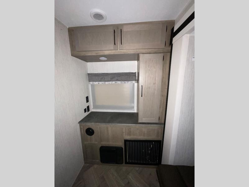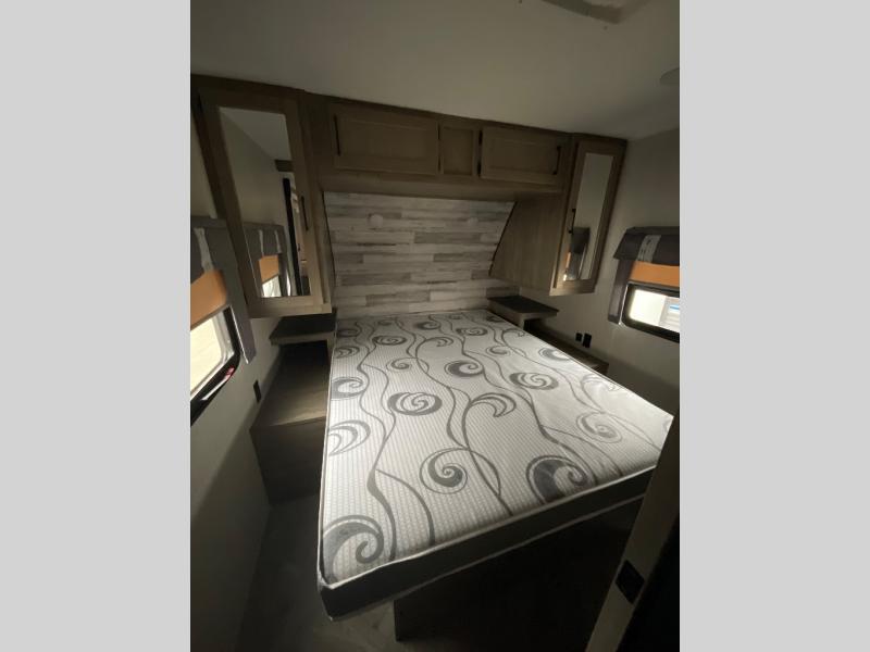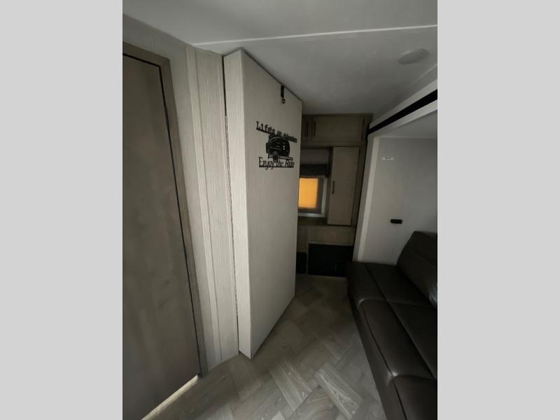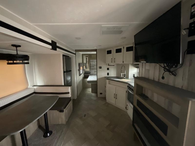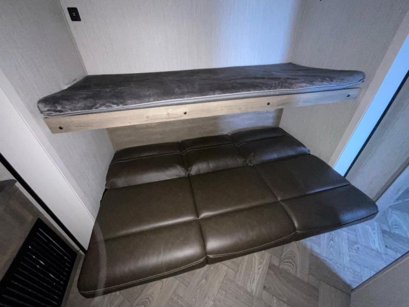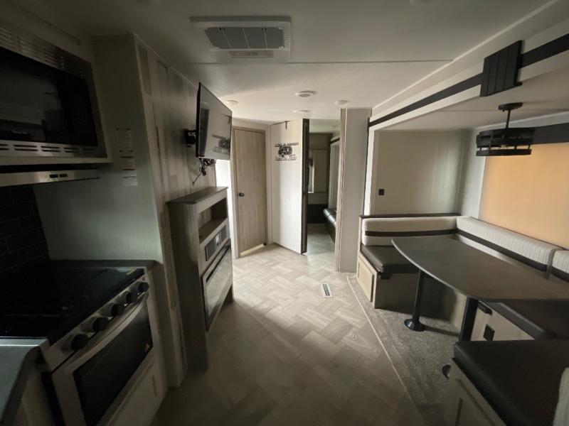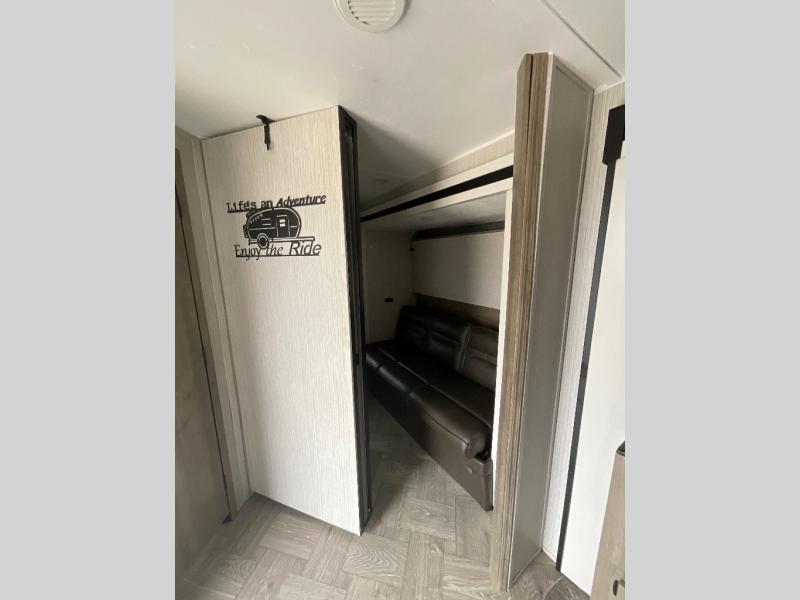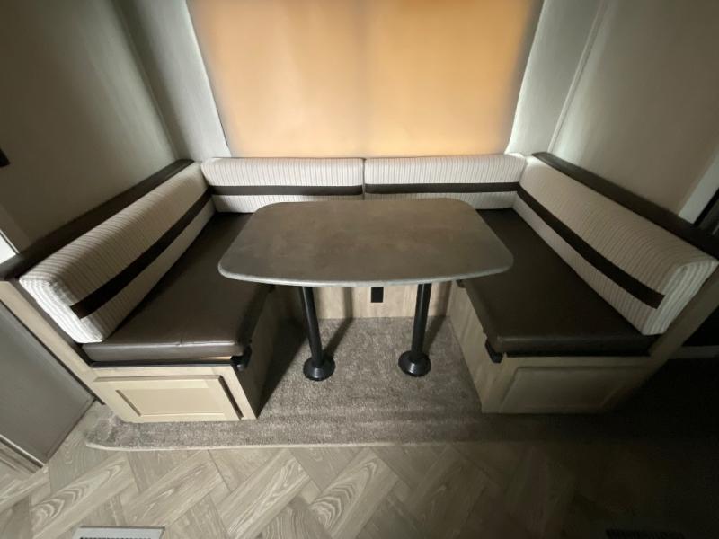 With two bedrooms in this travel trailer, everyone will have their own comfortable, private place to sleep! The rear corner bedroom has a 32" x 69" bunk above a jiffy sofa slide and an entertainment center, plus it is right next to the full bathroom with a 32" x 40" shower with a seat. The front private bedroom has a queen bed with shirt closets and nightstands on either side and a closet for your storage needs. Prepare delicious home cooked meals with the three burner cooktop and the closet/pantry behind the entertainment center offers versatility. You could even transform the U-shaped dinette into an extra sleeping space when you aren't enjoying a meal or playing a game. There is also an optional exterior micro kitchen with griddle that can be added too!