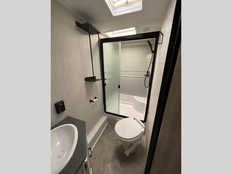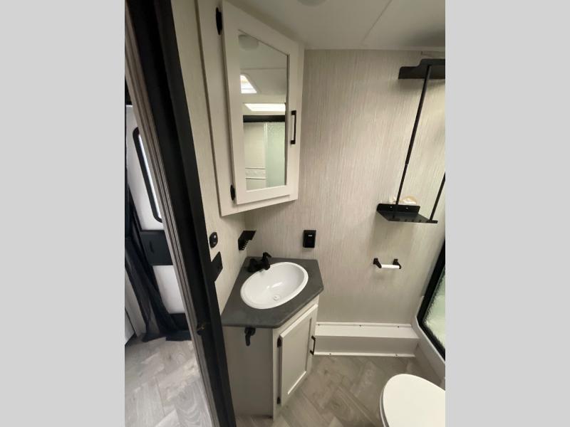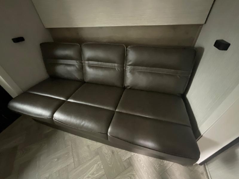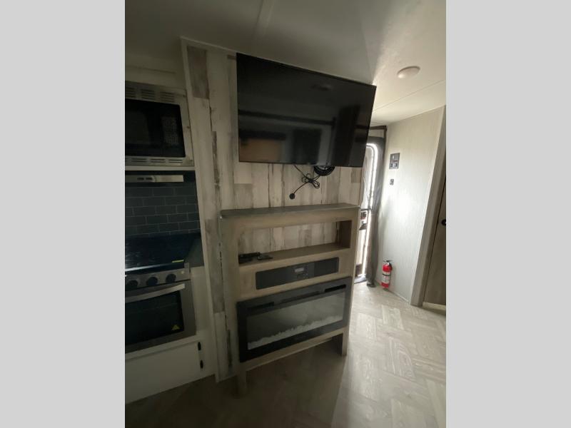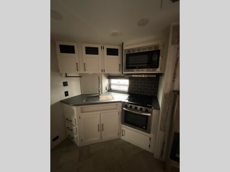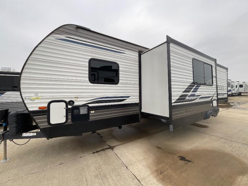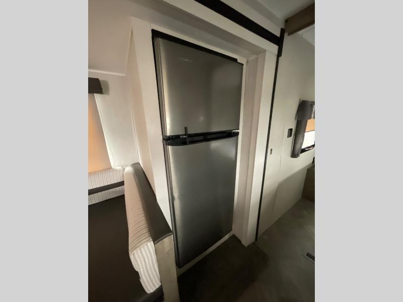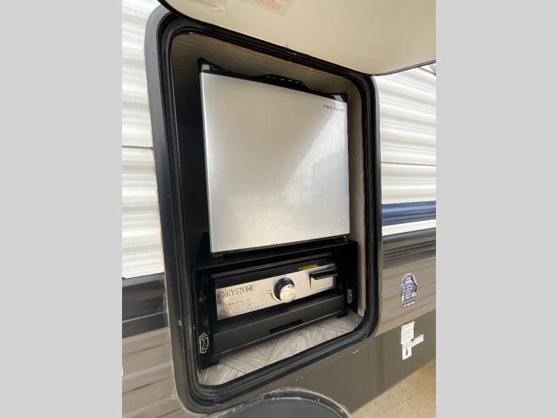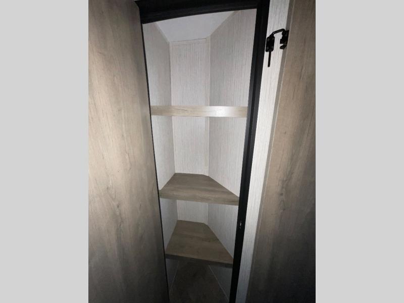 With two bedrooms in this travel trailer, everyone will have their own comfortable, private place to sleep! The rear corner bedroom has a 32" x 69" bunk above a jiffy sofa slide and an entertainment center, plus it is right next to the full bathroom with a 32" x 40" shower with a seat. The front private bedroom has a queen bed with shirt closets and nightstands on either side and a closet for your storage needs. Prepare delicious home cooked meals with the three burner cooktop and the closet/pantry behind the entertainment center offers versatility. You could even transform the U-shaped dinette into an extra sleeping space when you aren't enjoying a meal or playing a game. There is also an optional exterior micro kitchen with griddle that can be added too!