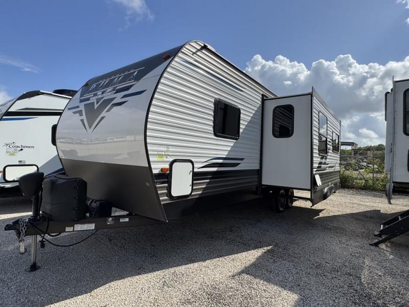 If you're looking for family-fun adventure then you need one of these Palomino Puma fifth wheels, travel trailers, or toy haulers! They are built rugged, easy to tow, and jam packed with features. The Darco wrapped underbelly will protect your units vitals through every season and the AlphaPly roofing membrane covers it. They also have super lube axles and a powder coated frame. Their luxurious interiors feature a spice rack and built-in knife rack in the kitchen, USB charging ports to keep your electronics at 100%, and high density foam mattresses for a good night's rest. The required Advantage package comes with night roller shades for privacy at night, two outside speakers to crank up the tunes while you play cornhole, and an outside shower to keep the dirt outside where it belongs, plus so much more!