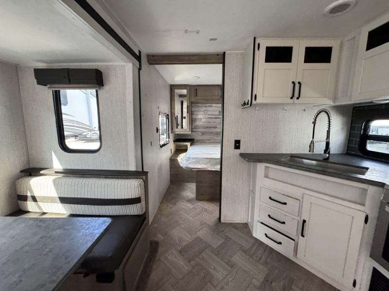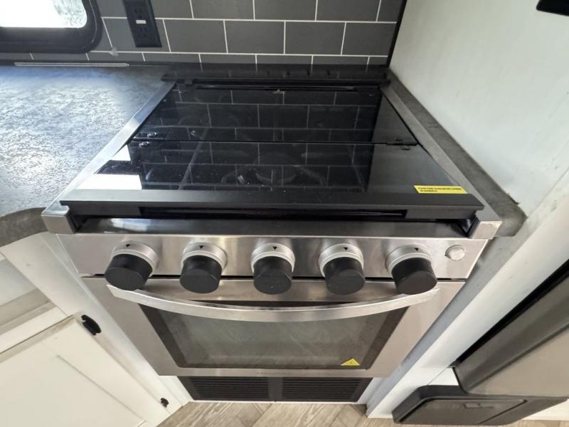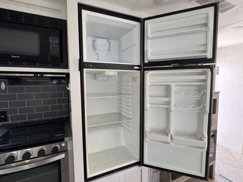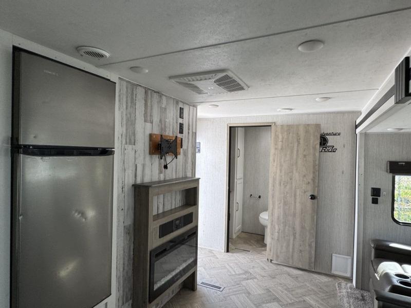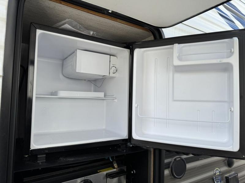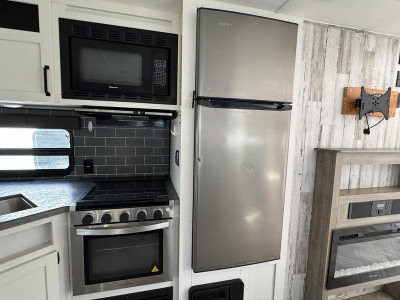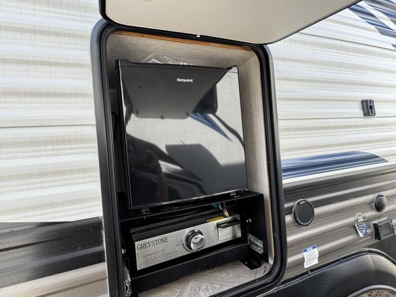 Pack your bags and hitch up this travel trailer for a great adventure! The full rear bathroom has a 32" x 40" shower with a seat and a closet for you to start each morning feeling clean and fresh. Now that you're ready for the day, grab some eggs from the 11 cu. ft. stainless steel refrigerator to fry up on the three burner cooktop and enjoy at the booth dinette. If mother nature is raining on your parade then you can relax on the sofa and watch your favorite movies with the entertainment center which has a closet/pantry behind it. You can even choose to add an optional exterior micro kitchen with griddle to enjoy breakfast outdoors!