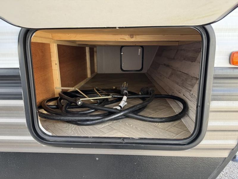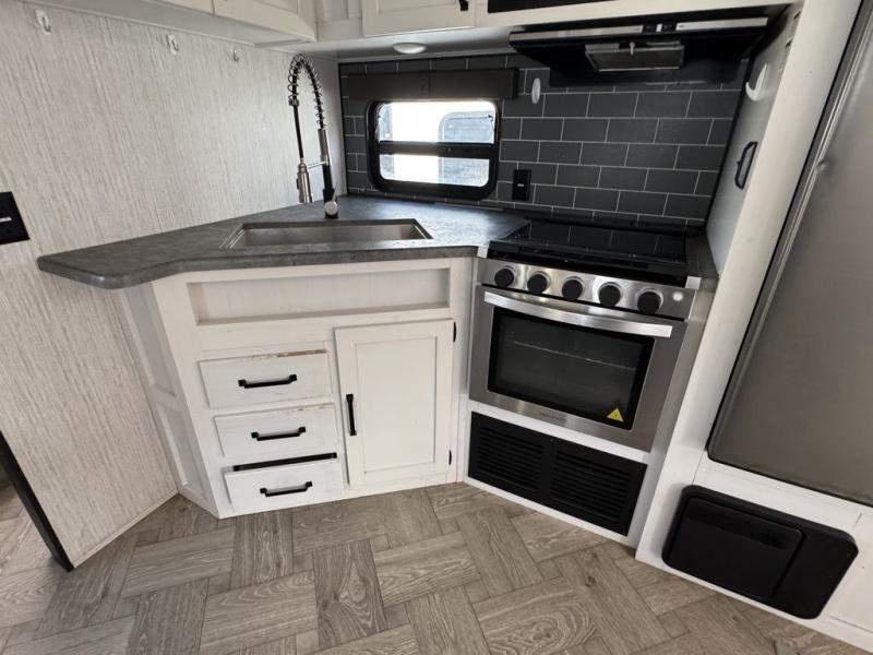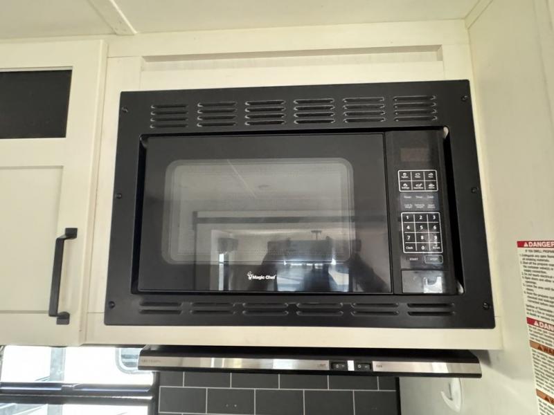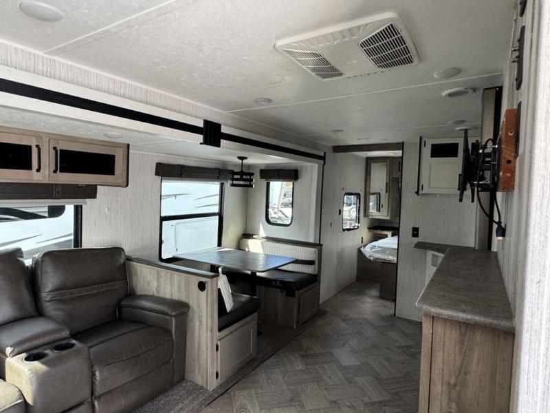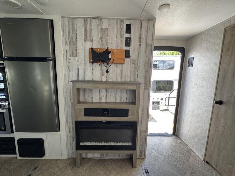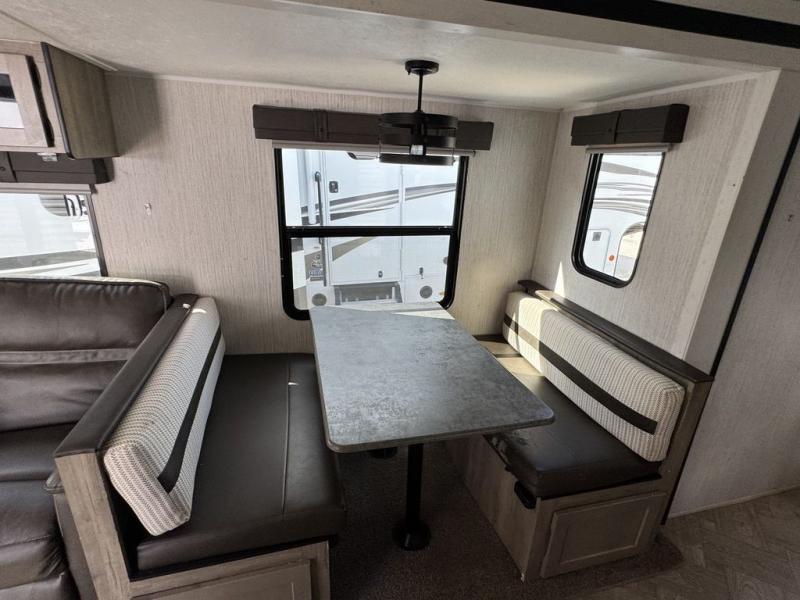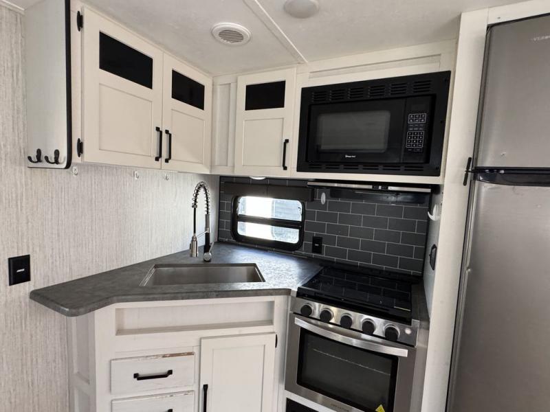 Pack your bags and hitch up this travel trailer for a great adventure! The full rear bathroom has a 32" x 40" shower with a seat and a closet for you to start each morning feeling clean and fresh. Now that you're ready for the day, grab some eggs from the 11 cu. ft. stainless steel refrigerator to fry up on the three burner cooktop and enjoy at the booth dinette. If mother nature is raining on your parade then you can relax on the sofa and watch your favorite movies with the entertainment center which has a closet/pantry behind it. You can even choose to add an optional exterior micro kitchen with griddle to enjoy breakfast outdoors!