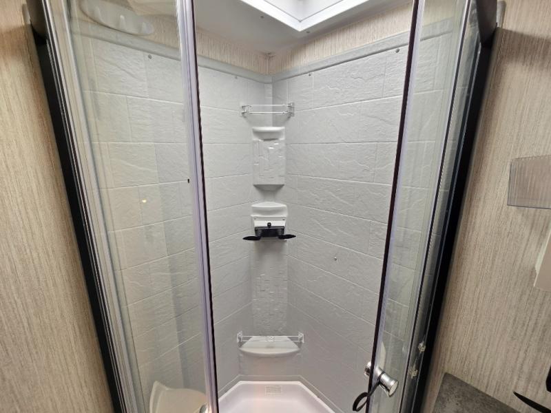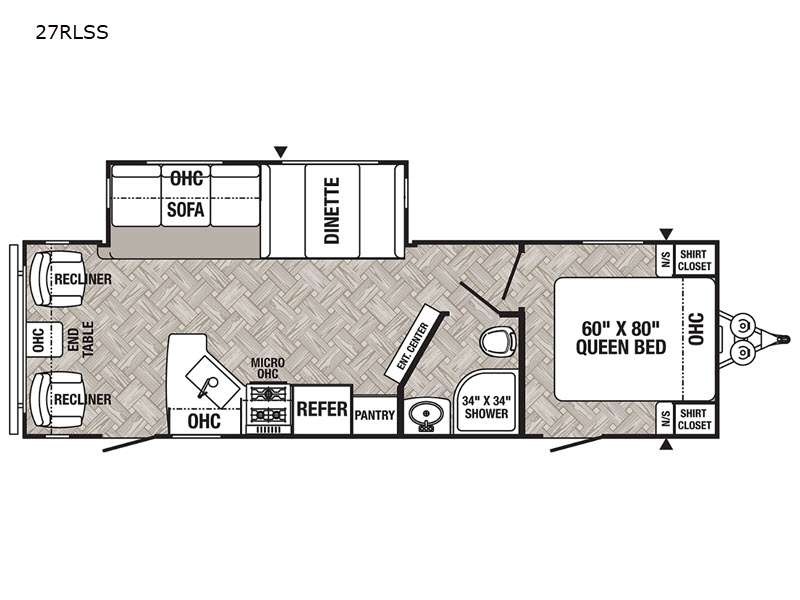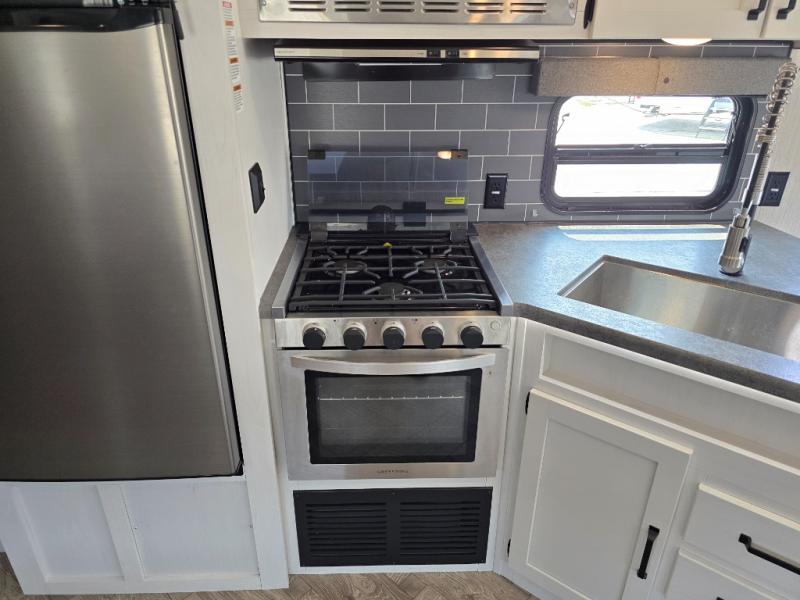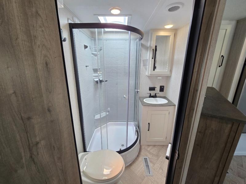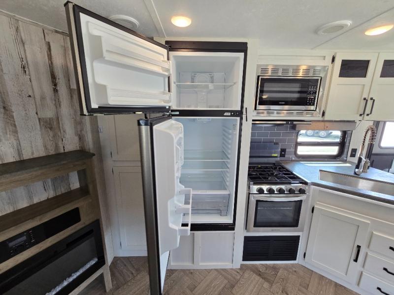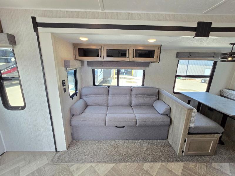 Comfort and convenience is found all throughout this travel trailer! The set of rear recliners have an end table in between to set your cup of coffee as you read the newspaper, and the sofa is a great place to take an afternoon nap. After you have prepared your best home cooked meal with the three burner cooktop and 11 cu. ft. stainless steel refrigerator, you can head to the booth dinette then play a card game or two. The full bathroom has a 34" x 34" radius shower to freshen up in before heading to the front private bedroom to enjoy a good night's rest on the queen bed which has shirt closets and nightstands on either side of it.