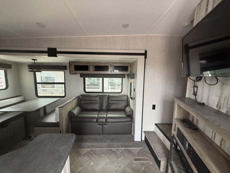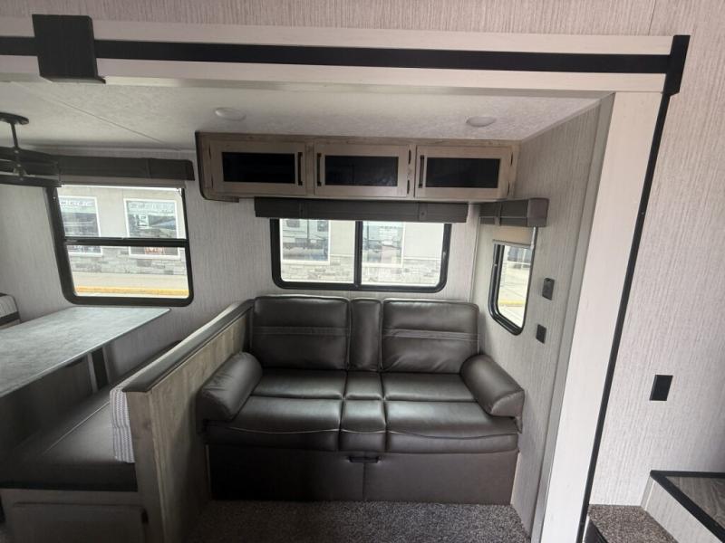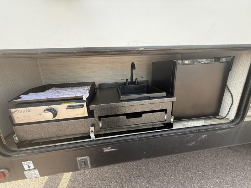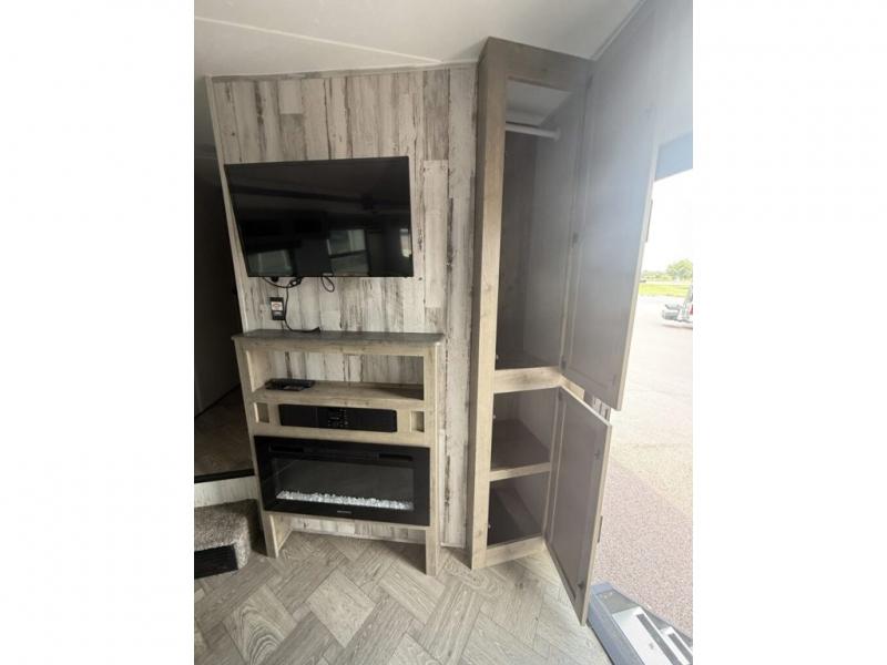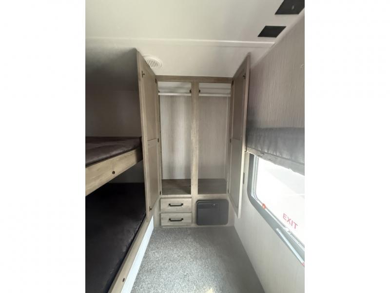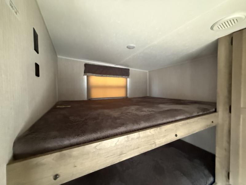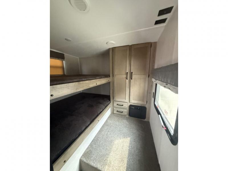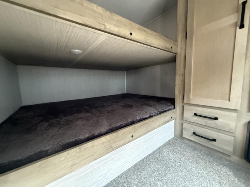 You will want to take more camping trips once you step inside this fifth wheel! The kids can sleep on the 55" x 69" double stacked double beds with storage underneath them, a wardrobe for their clothes, and a step-up platform to make it easy getting on the top bed. You can keep everyone's bellies full with a three burner cooktop and 11 cu. ft. stainless steel refrigerator, as well as with the optional exterior mini camp kitchen with griddle. Gather together at the booth dinette for your meals and game night, and relax on the sofa for movie night with the entertainment center. The full bathroom has a 32" x 40" shower with a seat and linen closet to keep your towels close.