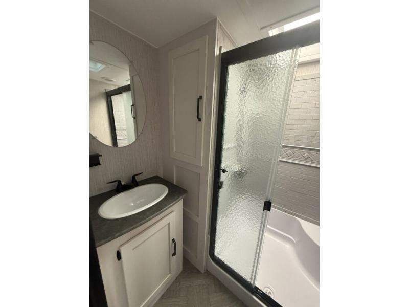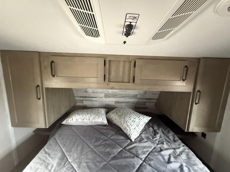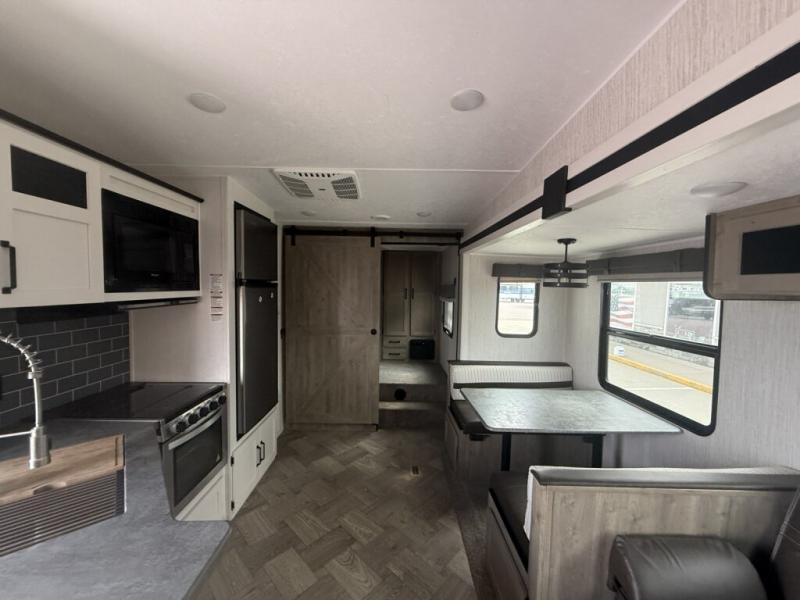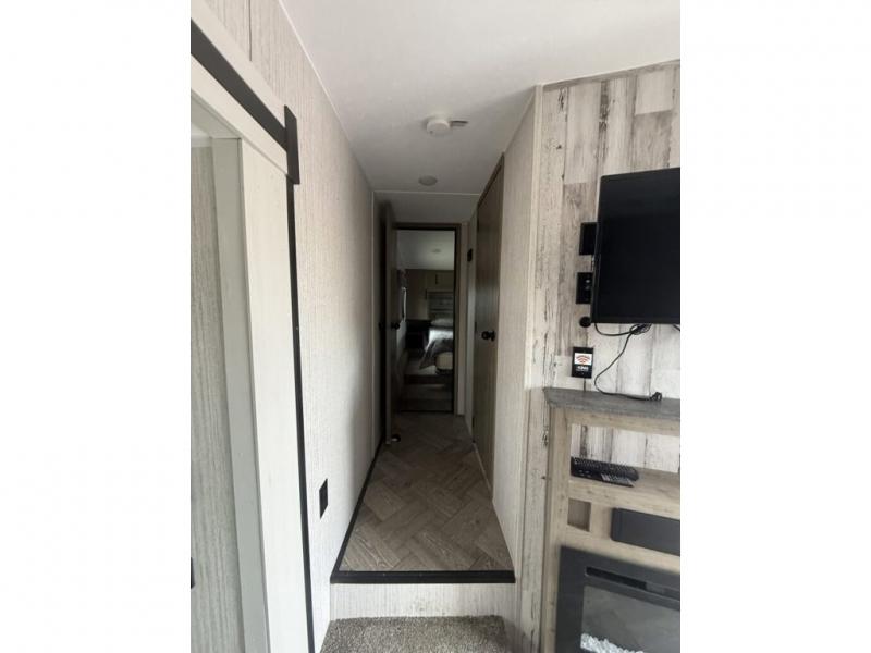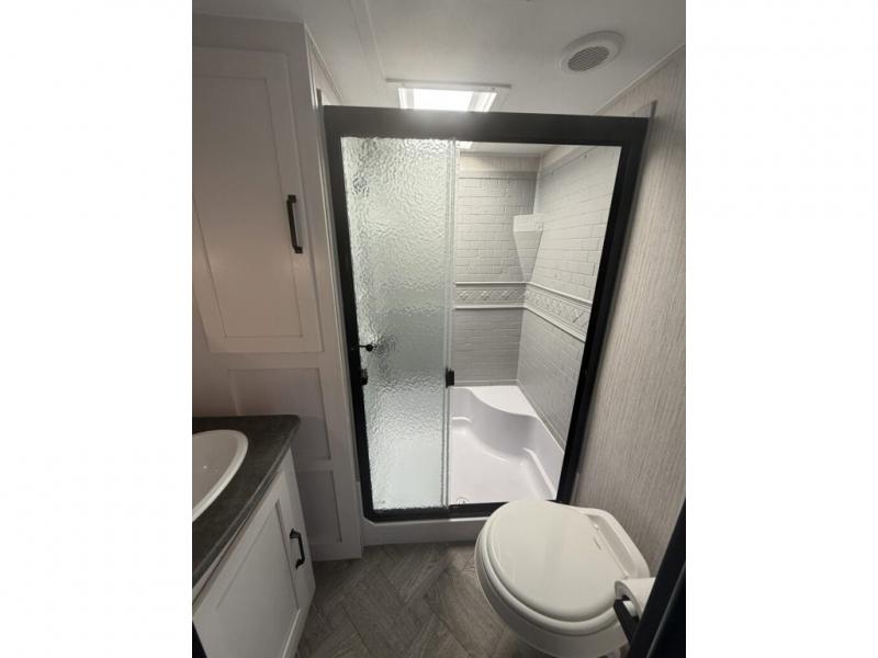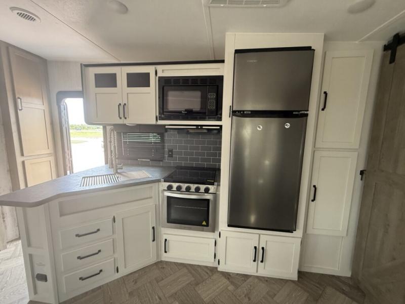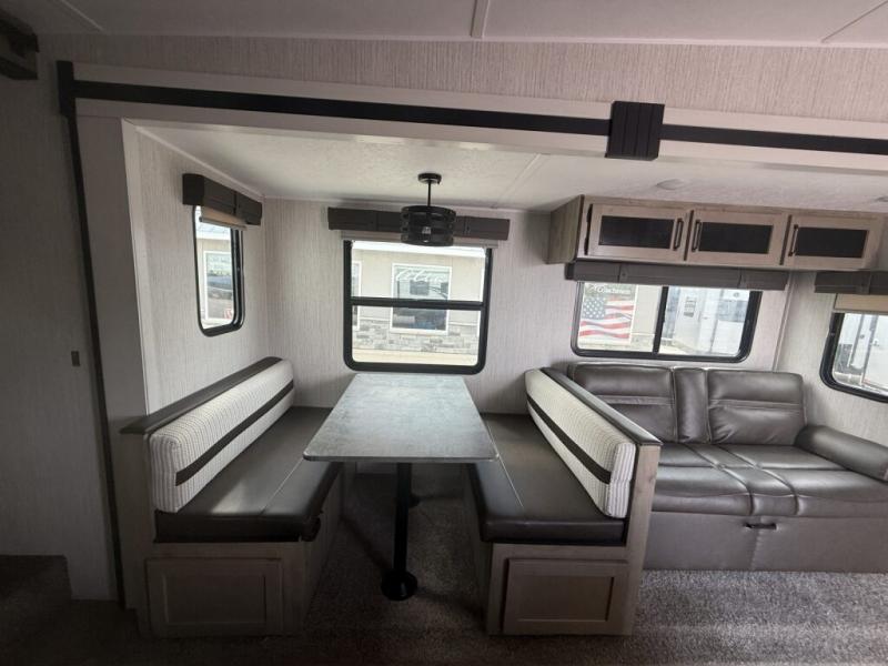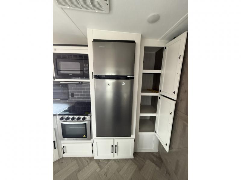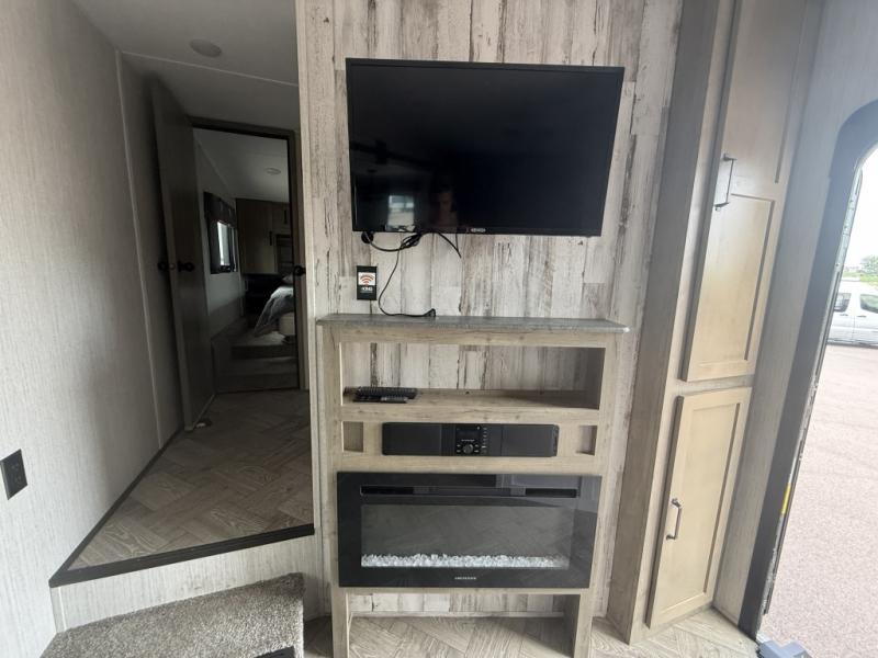 You will want to take more camping trips once you step inside this fifth wheel! The kids can sleep on the 55" x 69" double stacked double beds with storage underneath them, a wardrobe for their clothes, and a step-up platform to make it easy getting on the top bed. You can keep everyone's bellies full with a three burner cooktop and 11 cu. ft. stainless steel refrigerator, as well as with the optional exterior mini camp kitchen with griddle. Gather together at the booth dinette for your meals and game night, and relax on the sofa for movie night with the entertainment center. The full bathroom has a 32" x 40" shower with a seat and linen closet to keep your towels close.