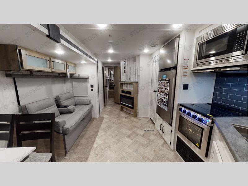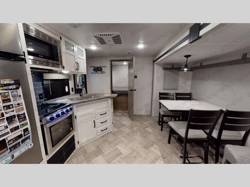 With two full bedrooms, everyone will have their own private retreat in this travel trailer! The front private bedroom has a queen bed with shirt closets and nightstands on either side of it, and the rear private bedroom has a queen bed with a shirt closet. The dual entry bathroom has a 34" x 34" radius shower for everyone to freshen up and one of the entrances leads directly outside so you can get back to having fun fast. Prepare your best home cooked meals indoors with the walk-in pantry, the three burner cooktop, and the 11 cu. ft. stainless steel refrigerator or at the optional exterior mini camp kitchen with griddle. Plus, there is a U-shaped dinette to enjoy your meals and even transform into an extra sleeping space!
