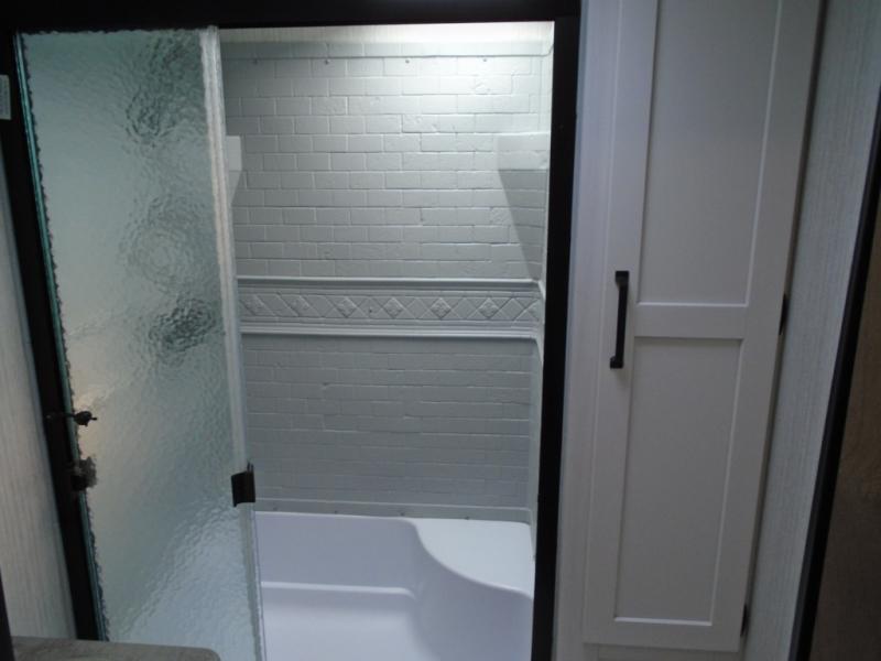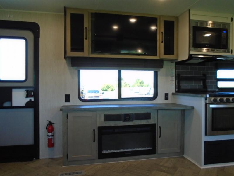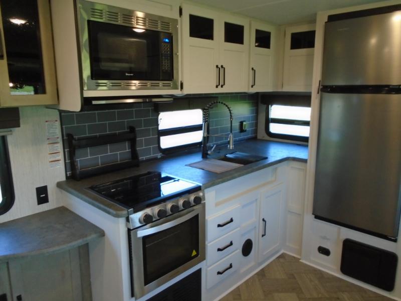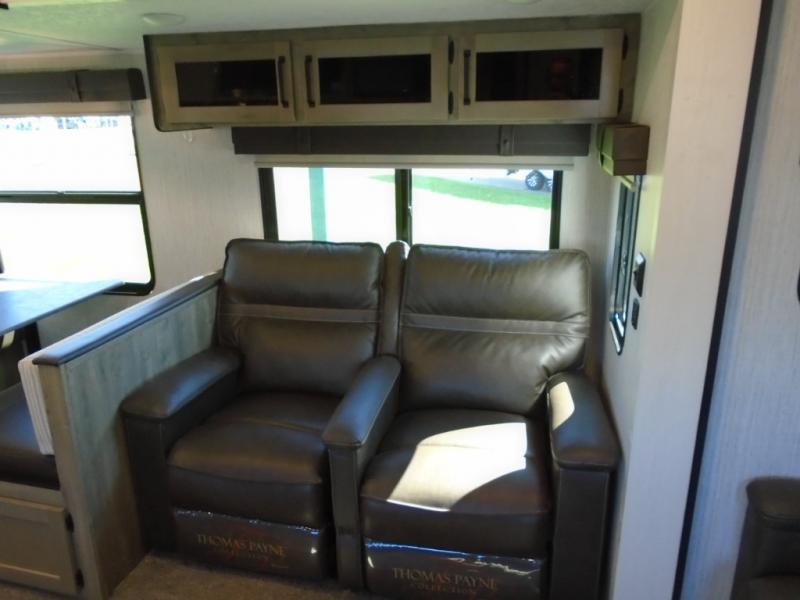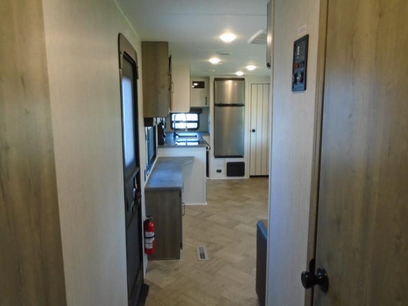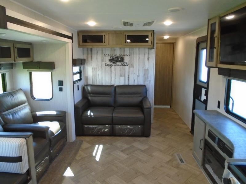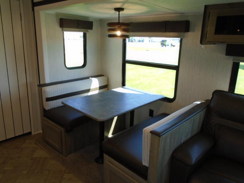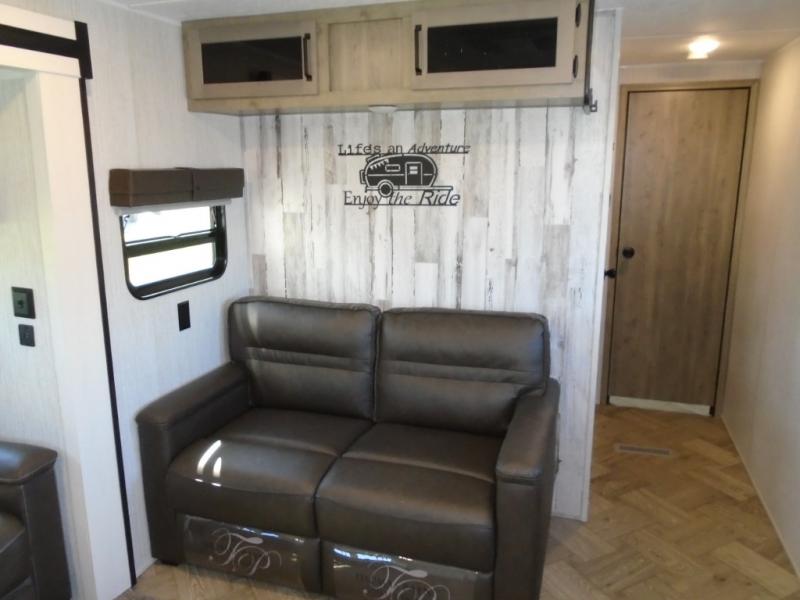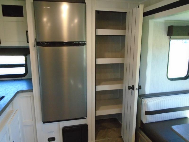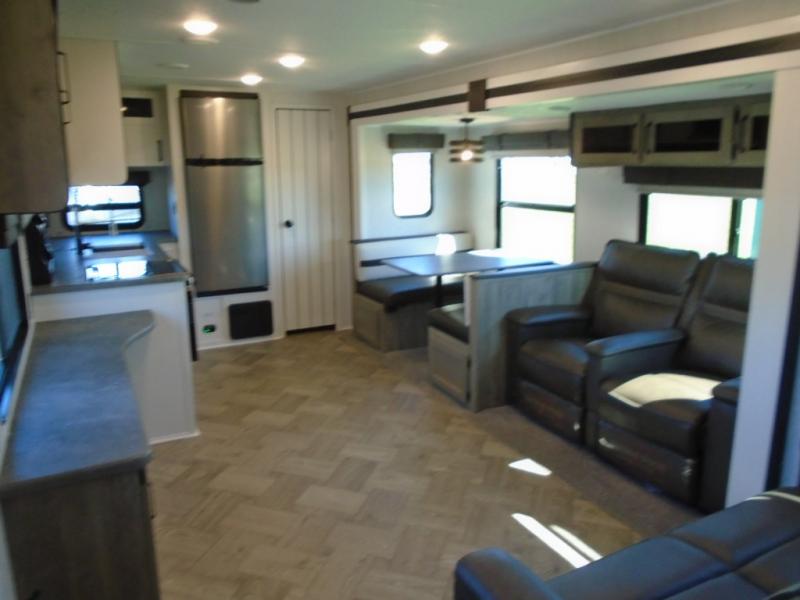 Pick your favorite camping spot and hitch this travel trailer up for a great weekend getaway! The rear kitchen has a three burner cooktop to prepare your best meals, an 11 cu. ft. stainless steel refrigerator to keep your perishables fresh, and a walk-in pantry for your canned goods and snacks for movie night. After a fun day at the beach, you can play a card game at the booth dinette, relax in either one of the two recliners and sofa, or rinse the sand out of your hair in the 32" x 40" shower with a seat in the full bathroom. There is also a front private bedroom with a queen bed to lay your head on at night, and an optional exterior micro kitchen with griddle for pancakes with a sunrise view!