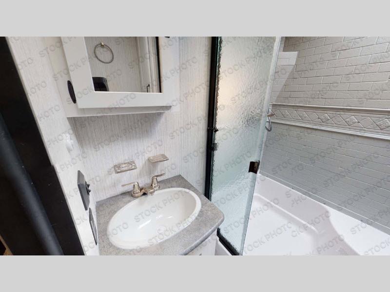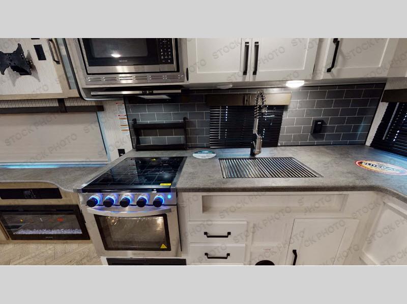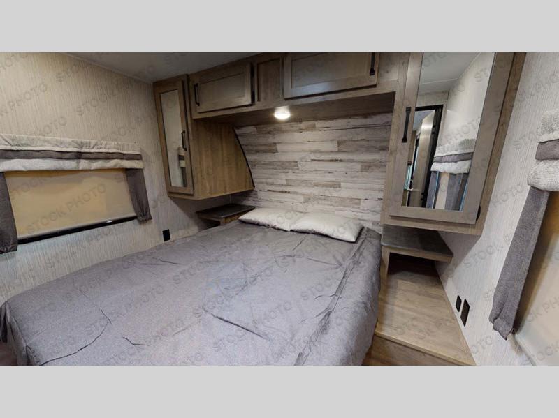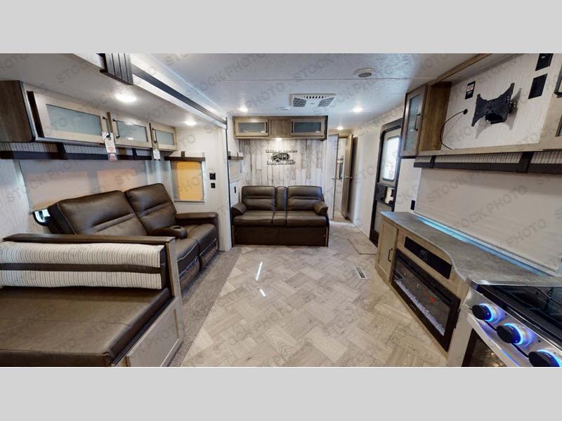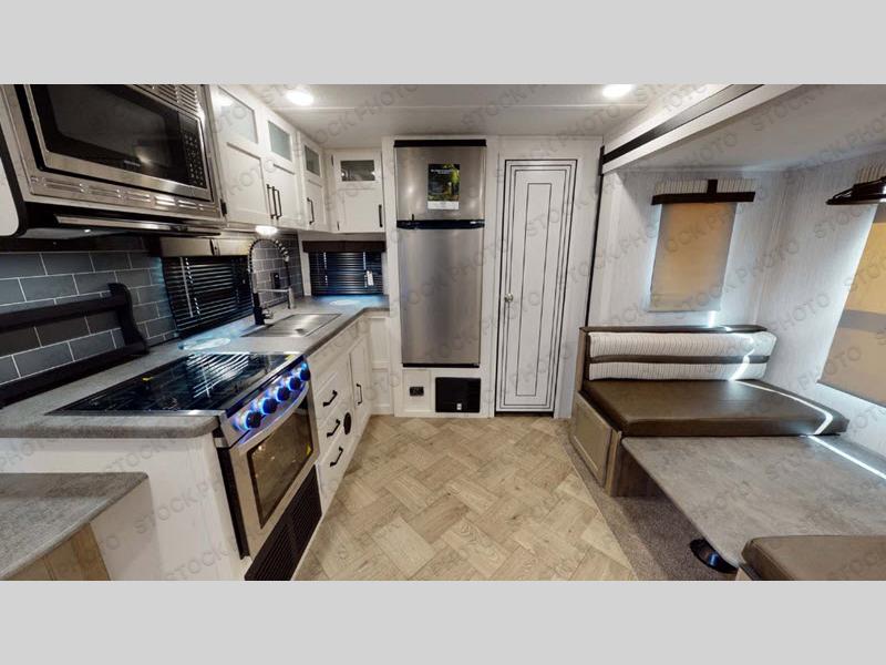 Pick your favorite camping spot and hitch this travel trailer up for a great weekend getaway! The rear kitchen has a three burner cooktop to prepare your best meals, an 11 cu. ft. stainless steel refrigerator to keep your perishables fresh, and a walk-in pantry for your canned goods and snacks for movie night. After a fun day at the beach, you can play a card game at the booth dinette, relax in either one of the two recliners and sofa, or rinse the sand out of your hair in the 32" x 40" shower with a seat in the full bathroom. There is also a front private bedroom with a queen bed to lay your head on at night, and an optional exterior micro kitchen with griddle for pancakes with a sunrise view!
