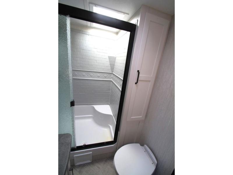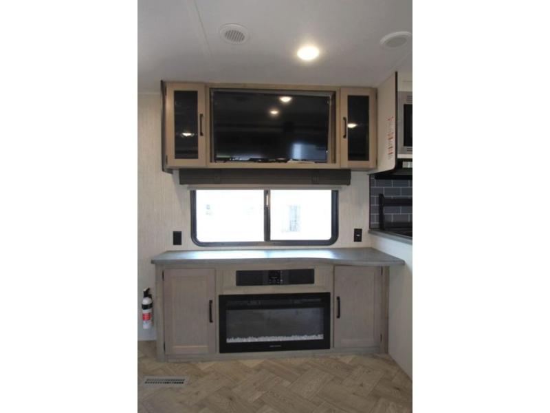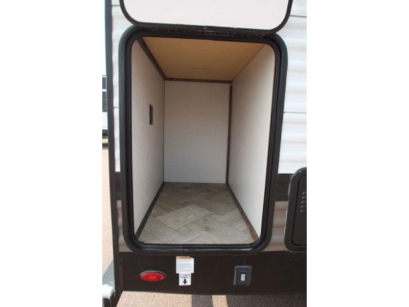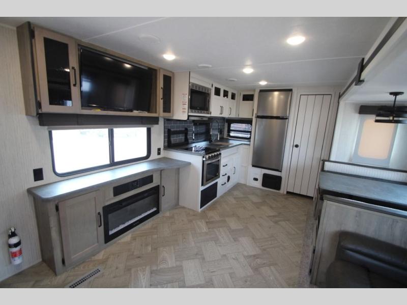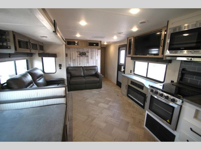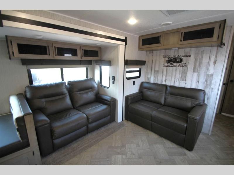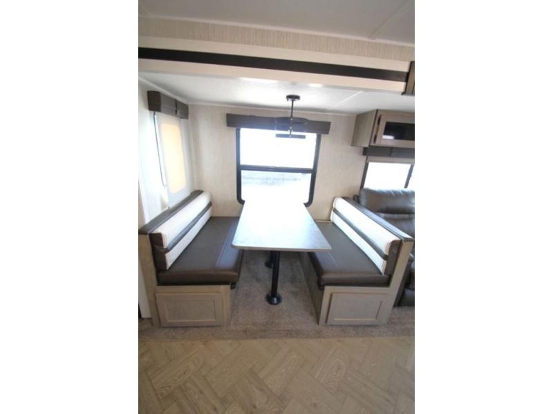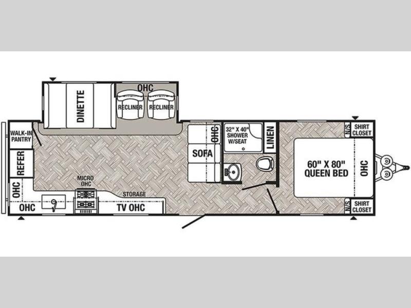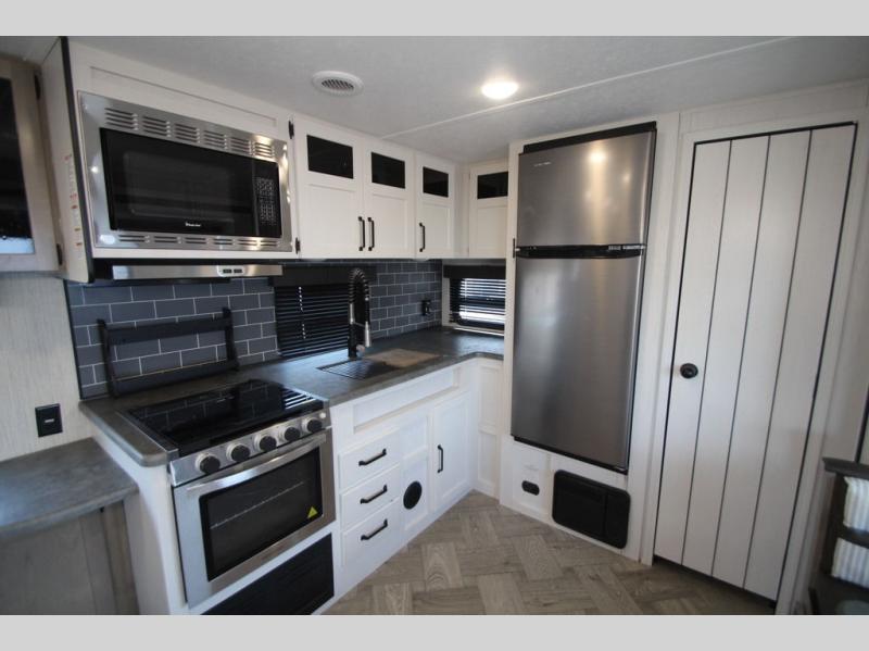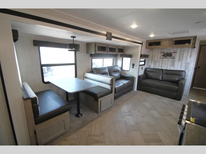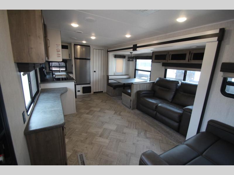 Pick your favorite camping spot and hitch this travel trailer up for a great weekend getaway! The rear kitchen has a three burner cooktop to prepare your best meals, an 11 cu. ft. stainless steel refrigerator to keep your perishables fresh, and a walk-in pantry for your canned goods and snacks for movie night. After a fun day at the beach, you can play a card game at the booth dinette, relax in either one of the two recliners and sofa, or rinse the sand out of your hair in the 32" x 40" shower with a seat in the full bathroom. There is also a front private bedroom with a queen bed to lay your head on at night, and an optional exterior micro kitchen with griddle for pancakes with a sunrise view!