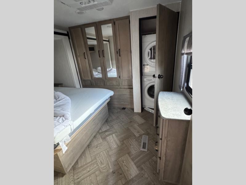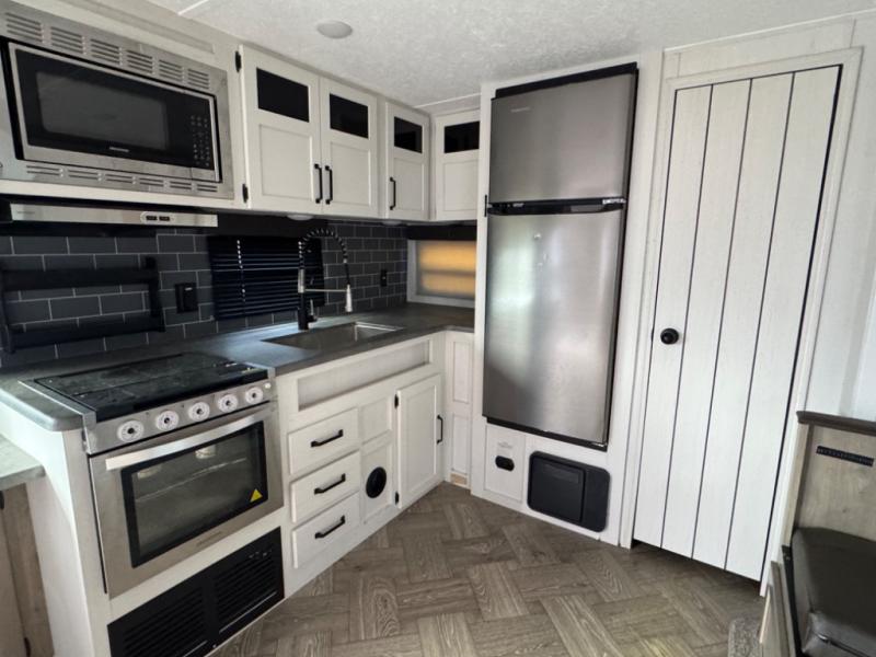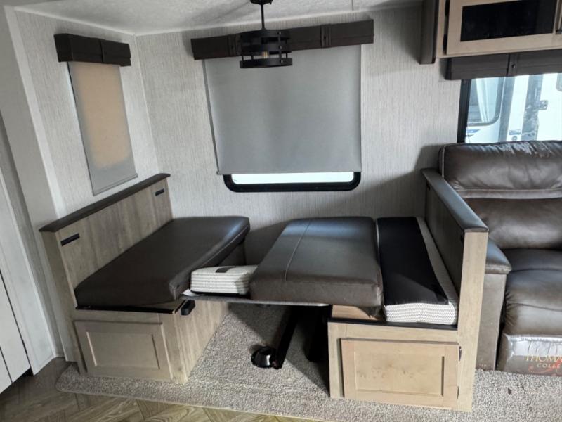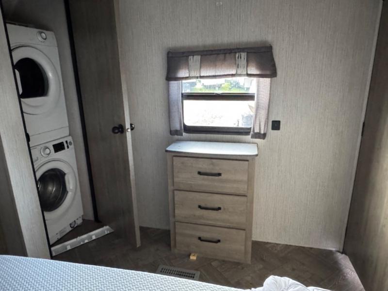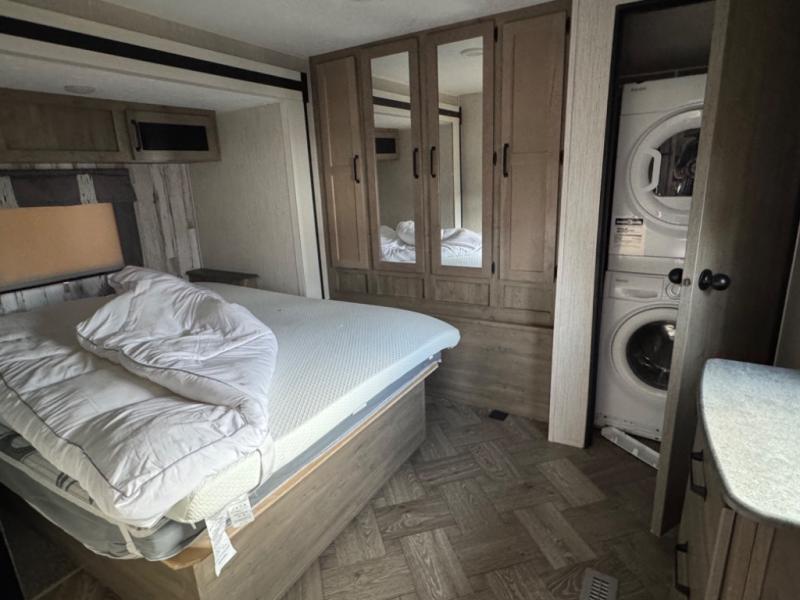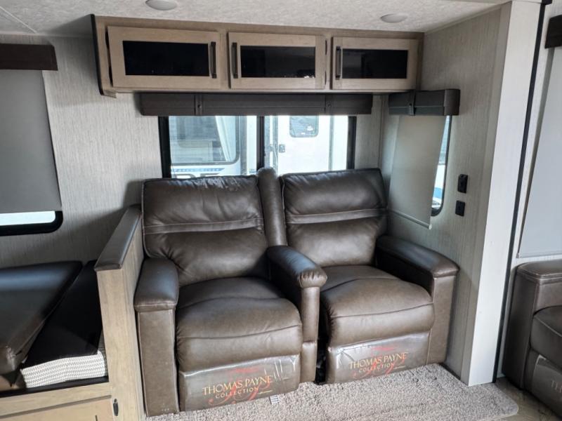 You won't want to camp any other way once you step inside this travel trailer! The rear kitchen has a three burner cooktop to prepare your best meals, an 11 cu. ft. stainless steel refrigerator to keep your perishables fresh, and a walk-in pantry for your canned goods and snacks for movie night. After a fun day at the beach, you can play a card game at the booth dinette, relax in either one of the two recliners and sofa, or rinse the sand out of your hair in the 32" x 40" shower with a seat in the full bathroom. There is also a front private bedroom with a queen bed slide across from a dresser and a front closet with another closet next to it that is prepped to add an optional washer and dryer. You might also want to add the optional exterior micro kitchen with griddle for dinners outdoors!
