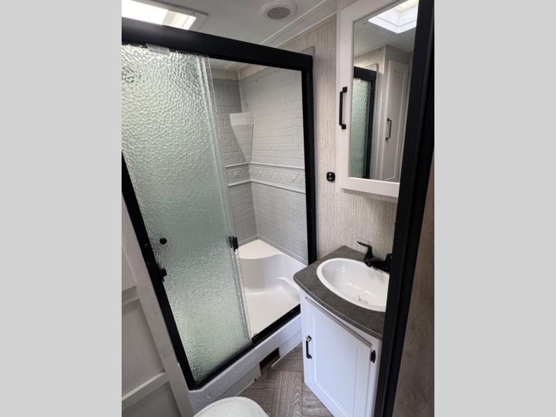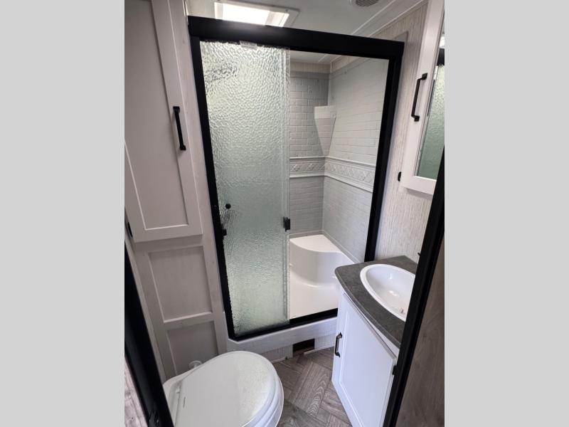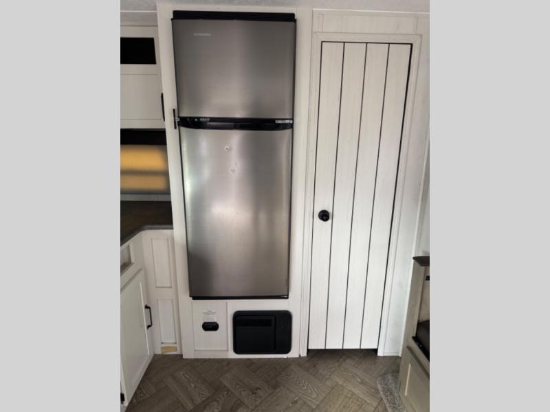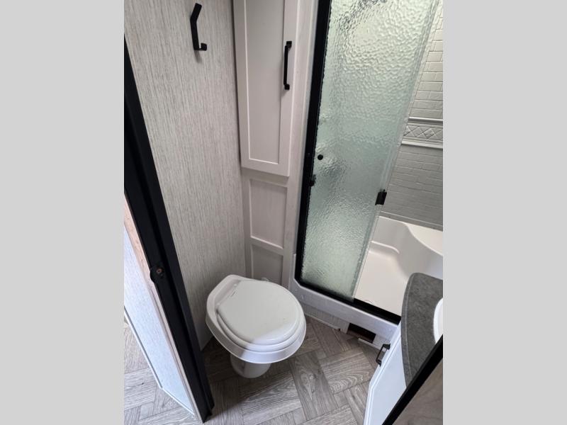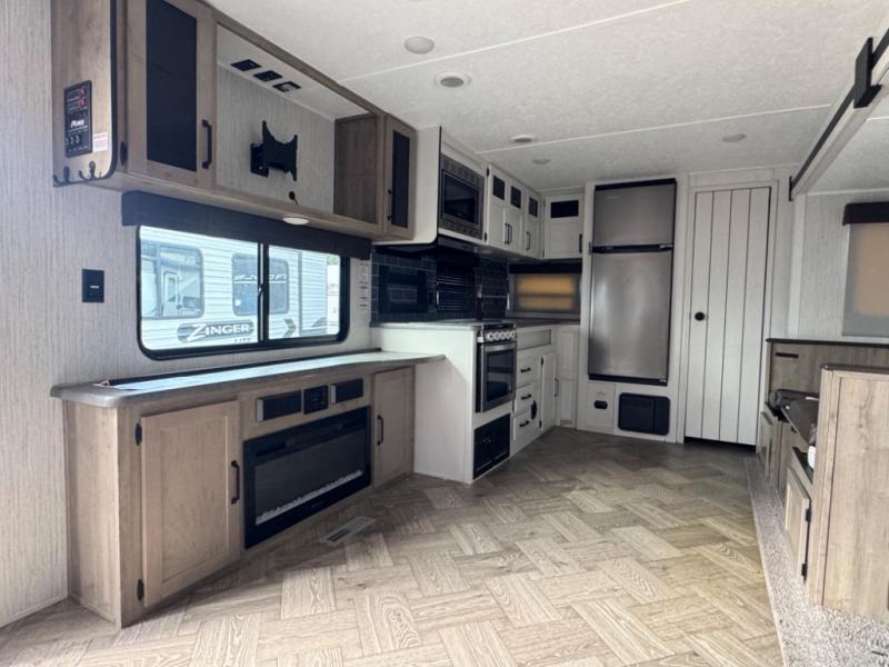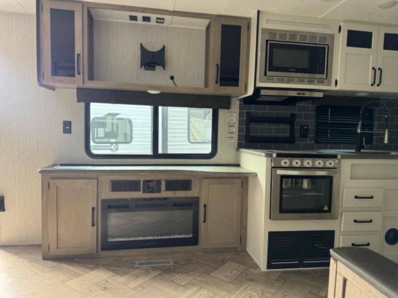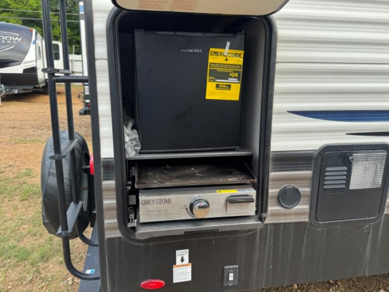 You won't want to camp any other way once you step inside this travel trailer! The rear kitchen has a three burner cooktop to prepare your best meals, an 11 cu. ft. stainless steel refrigerator to keep your perishables fresh, and a walk-in pantry for your canned goods and snacks for movie night. After a fun day at the beach, you can play a card game at the booth dinette, relax in either one of the two recliners and sofa, or rinse the sand out of your hair in the 32" x 40" shower with a seat in the full bathroom. There is also a front private bedroom with a queen bed slide across from a dresser and a front closet with another closet next to it that is prepped to add an optional washer and dryer. You might also want to add the optional exterior micro kitchen with griddle for dinners outdoors!