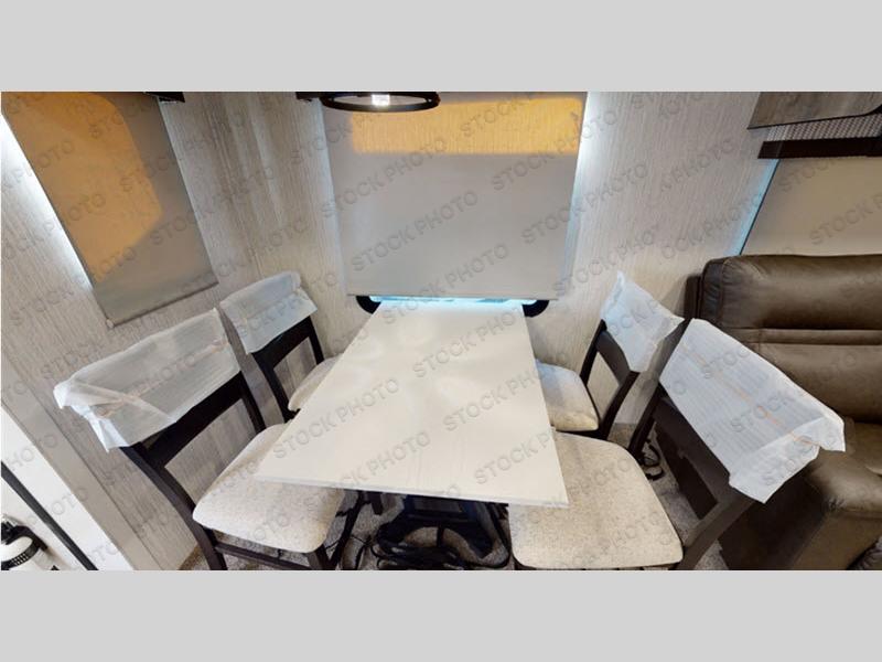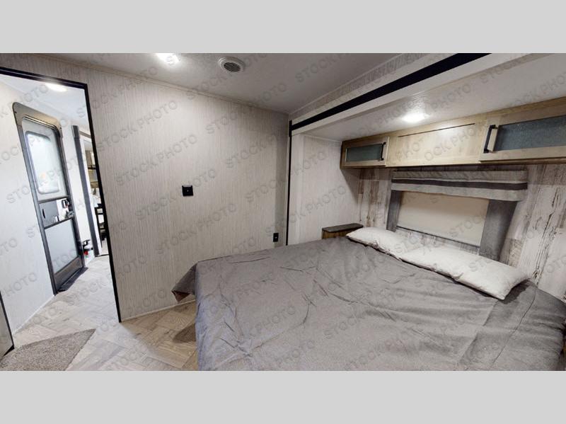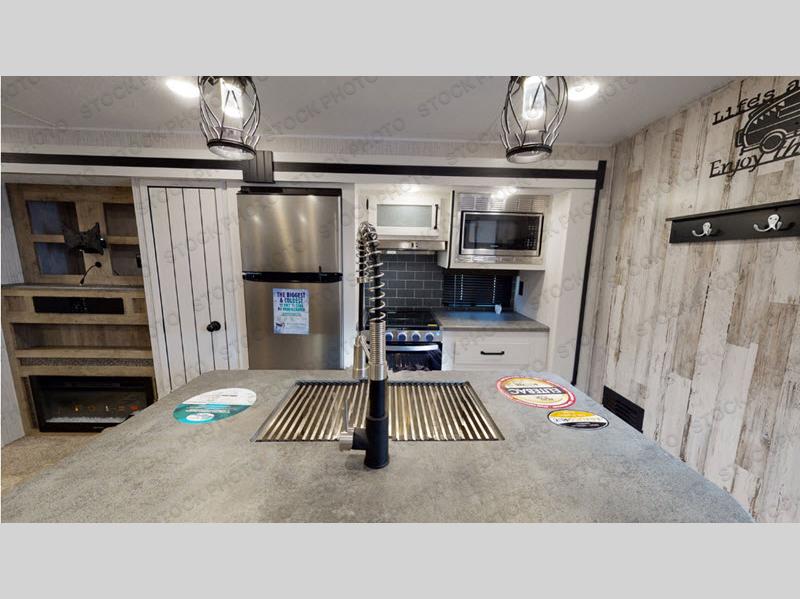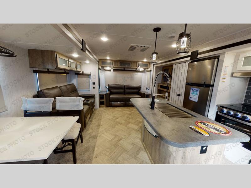 You're going to feel right at home in this travel trailer! The front private bedroom has a queen bed slide for a good night's rest, a dresser and front closet for your clothes, and another closet that is prepped to add an optional washer and dryer. Freshen up each morning in the full bathroom with the 32" x 40" shower with a seat and then head to the kitchen to fry up some eggs on the three burner cooktop. You will also appreciate having a kitchen island for easier meal prep and a walk-in pantry to easily see your canned goods and snacks. The booth dinette offers a comfortable place to dine, play, and even sleep once converted. What better way to wind down your nights than to relax on either the rear sofa or in one of the two recliners across from the entertainment center with the option to add a fireplace!