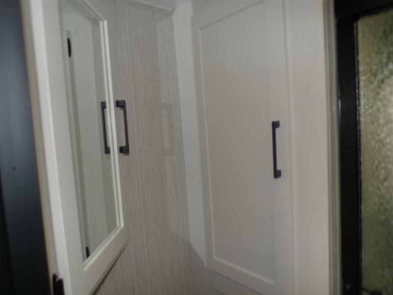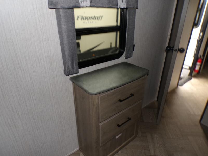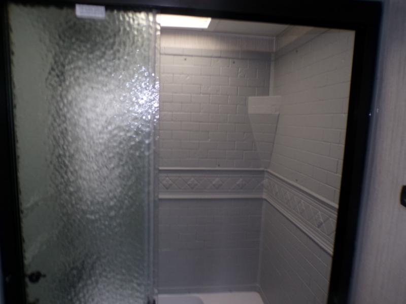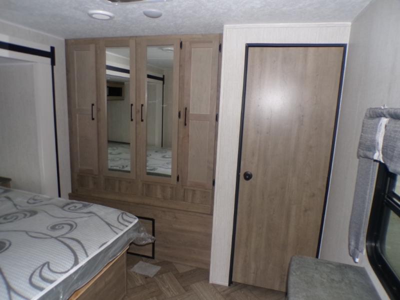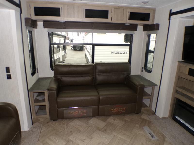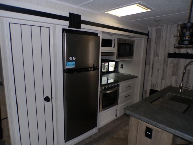 You're going to feel right at home in this travel trailer! The front private bedroom has a queen bed slide for a good night's rest, a dresser and front closet for your clothes, and another closet that is prepped to add an optional washer and dryer. Freshen up each morning in the full bathroom with the 32" x 40" shower with a seat and then head to the kitchen to fry up some eggs on the three burner cooktop. You will also appreciate having a kitchen island for easier meal prep and a walk-in pantry to easily see your canned goods and snacks. The booth dinette offers a comfortable place to dine, play, and even sleep once converted. What better way to wind down your nights than to relax on either the rear sofa or in one of the two recliners across from the entertainment center with the option to add a fireplace!