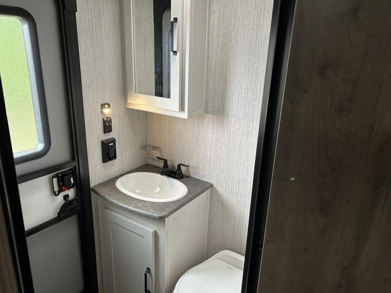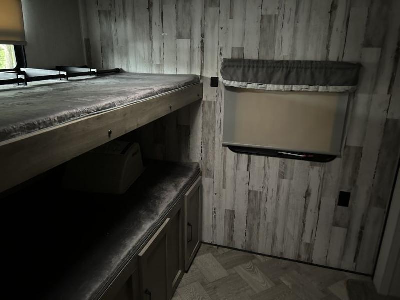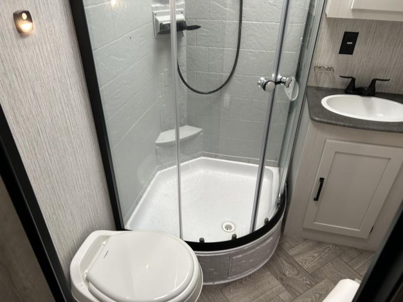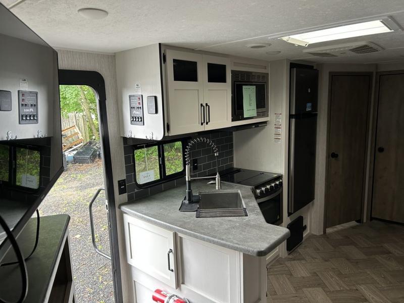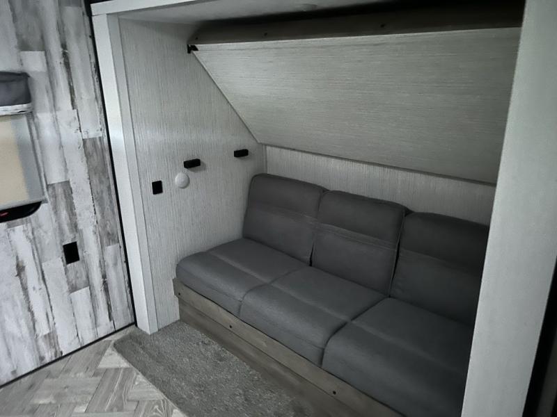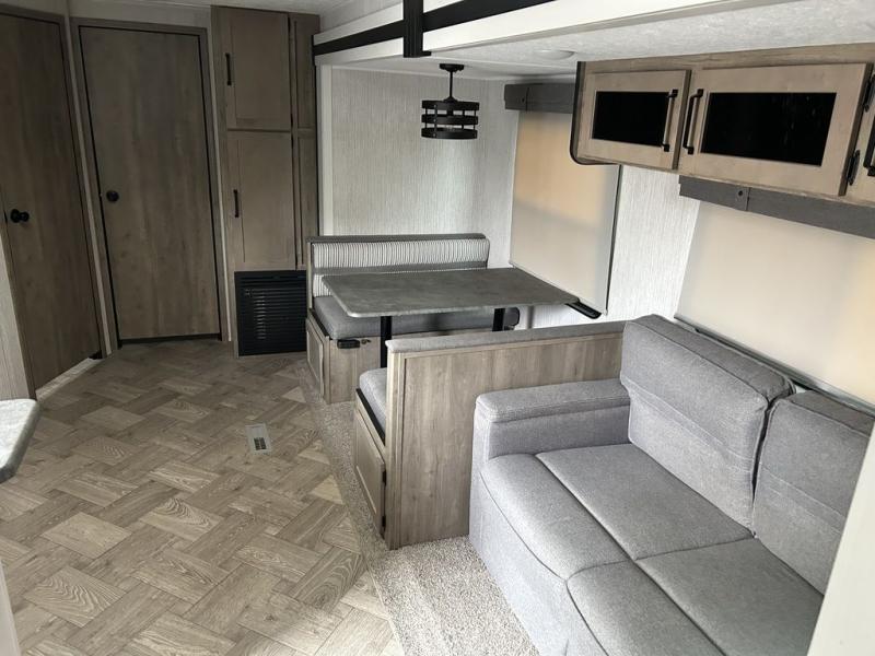 With dual entry doors and a bath and a half, you will have the ultimate in convenience with this travel trailer! For even more convenience, you can add the optional exterior mini camp kitchen with griddle and the optional washer and dryer to the prepped closet in the front private bedroom. The bedroom also has a front closet to keep your clothes looking their best and a queen bed slide for you to sleep your best. Everyone can freshen up in the full bathroom with the 34" x 34" radius shower and fill their bellies with scrambled eggs cooked on the three burner cooktop. Enjoy your meals, play games, and even sleep at the booth dinette or relax on the sofa while watching a movie with the entertainment center.