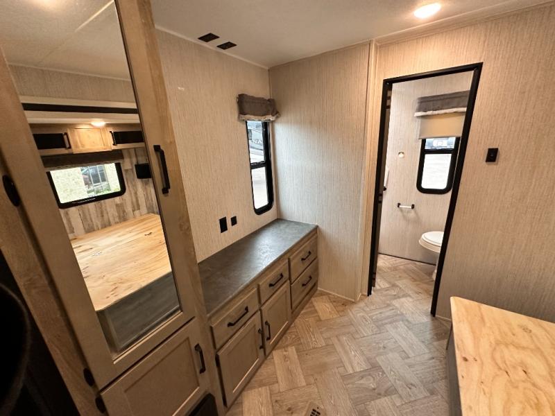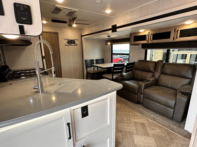 With any Puma Destination trailer by Palomino, you will enjoy the interior 84" height, the kitchen's decorative backsplash, the high-rise faucet with sprayer and undermount stainless steel sink, the ball bearing drawer guides, plus the divided silverware drawer will keep everything in its place. The Puma construction offers longer lasting better built trailers with an AlphaPly roofing membrane, plus you will find rain gutters with large downspouts, an ABS automotive style fender skirt, a Darco wrapped underbelly, as well as each has been prepped for solar and WiFi.