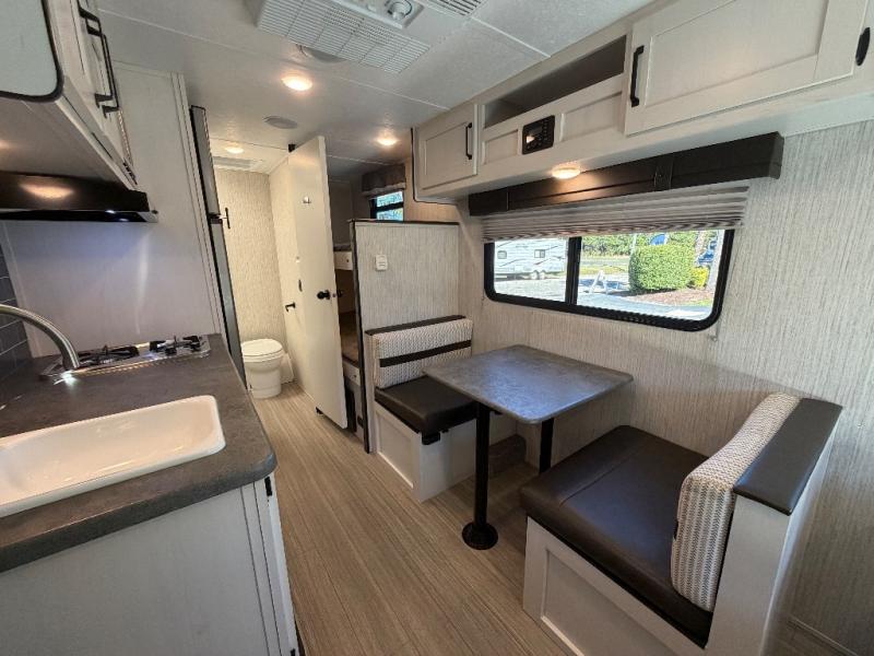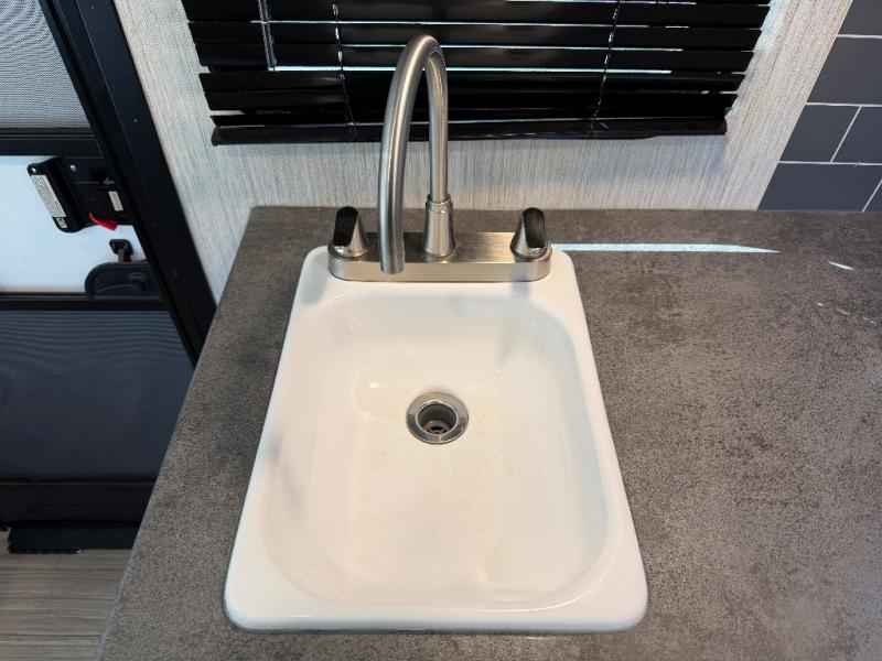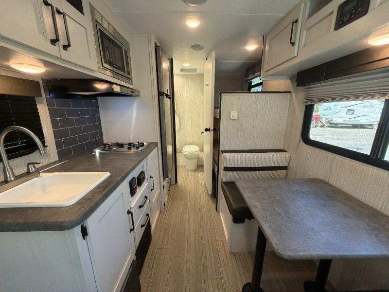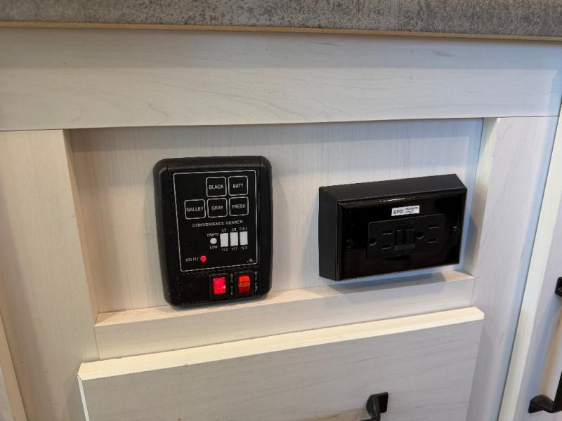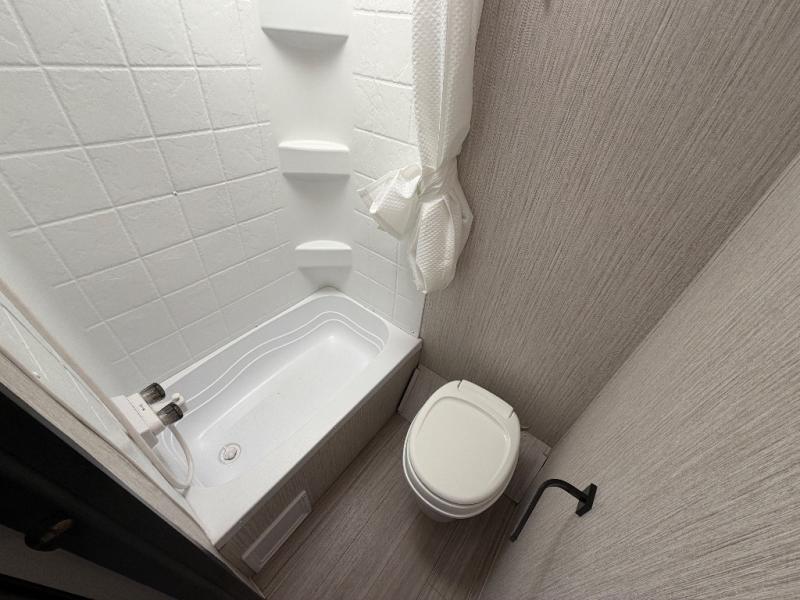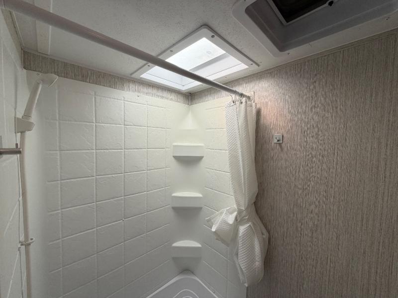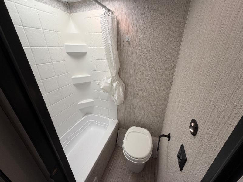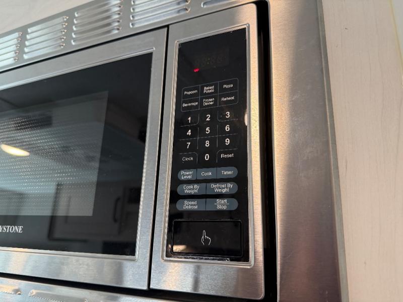 Meal prep is easy with a two-burner cooktop, stainless steel microwave, and residential refrigerator to store leftovers. The private toilet and tub/shower next to the bunks provide convenience for the whole family and keep everyone clean and comfortable.