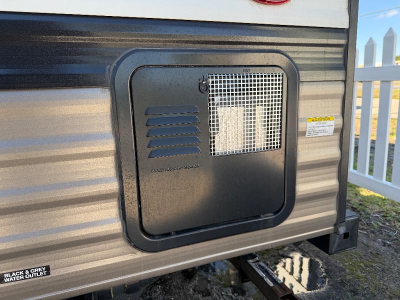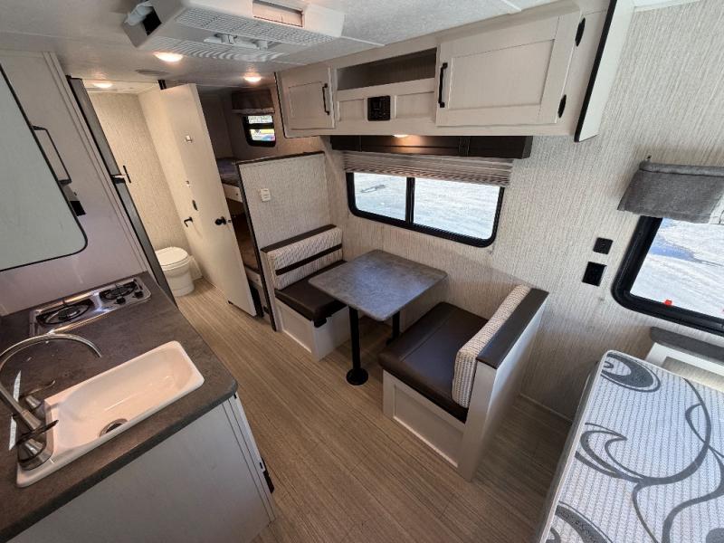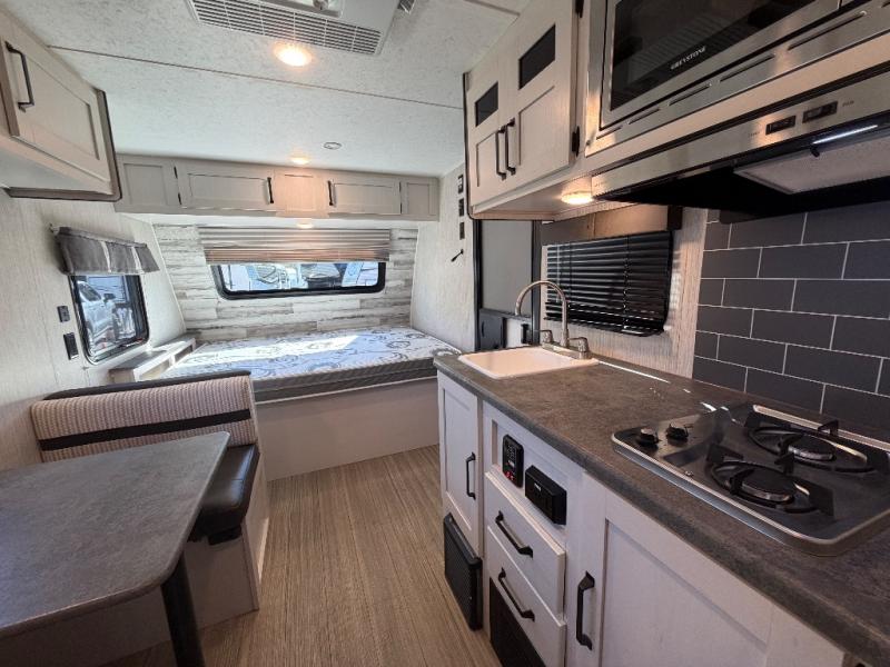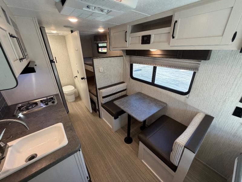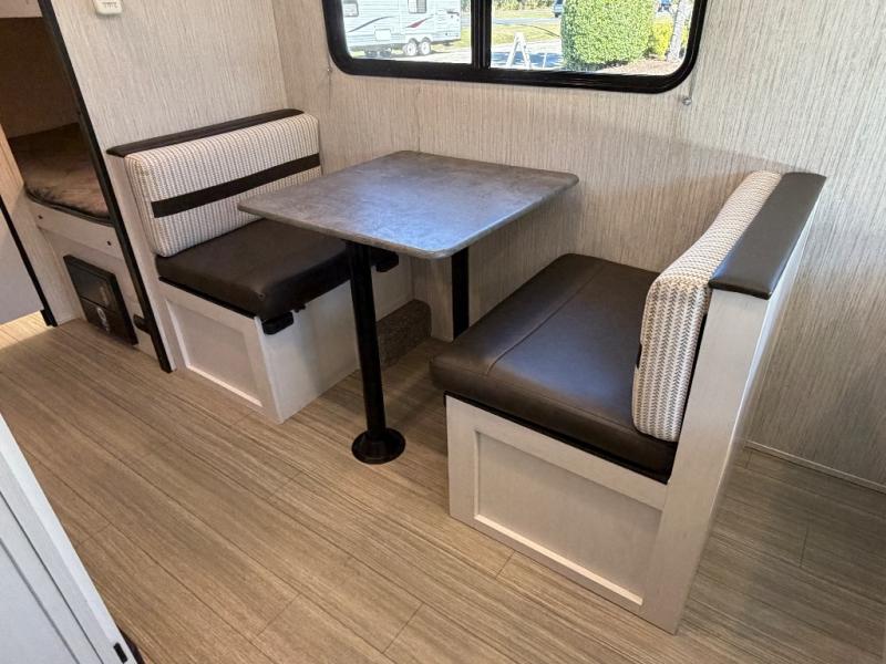 This 16BHX Puma Ultra Lite trailer offers comfortable sleeping for the whole family with rear bunks and a front RV queen bed. The booth dinette provides a cozy indoor dining space, while the 12' electric awning and exterior seating make outdoor meals and relaxation a breeze.