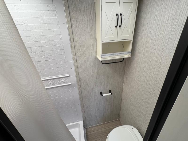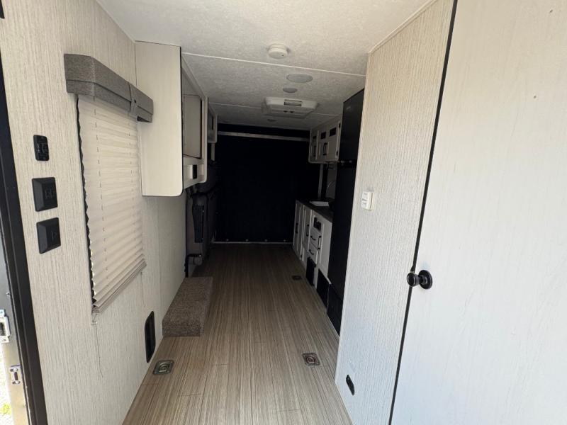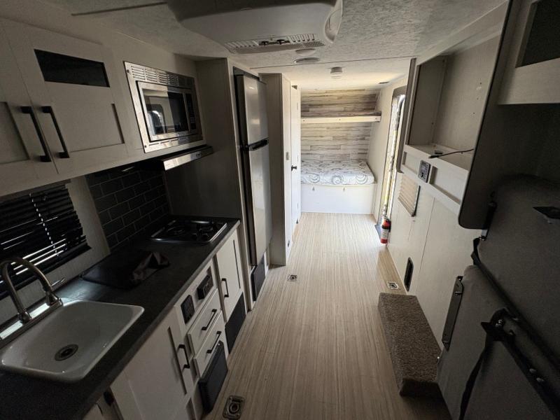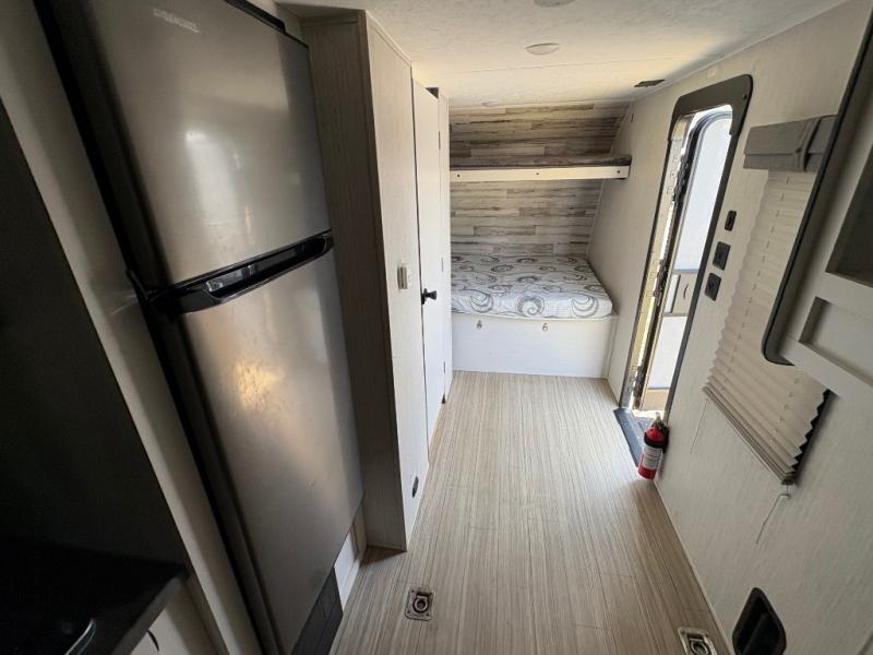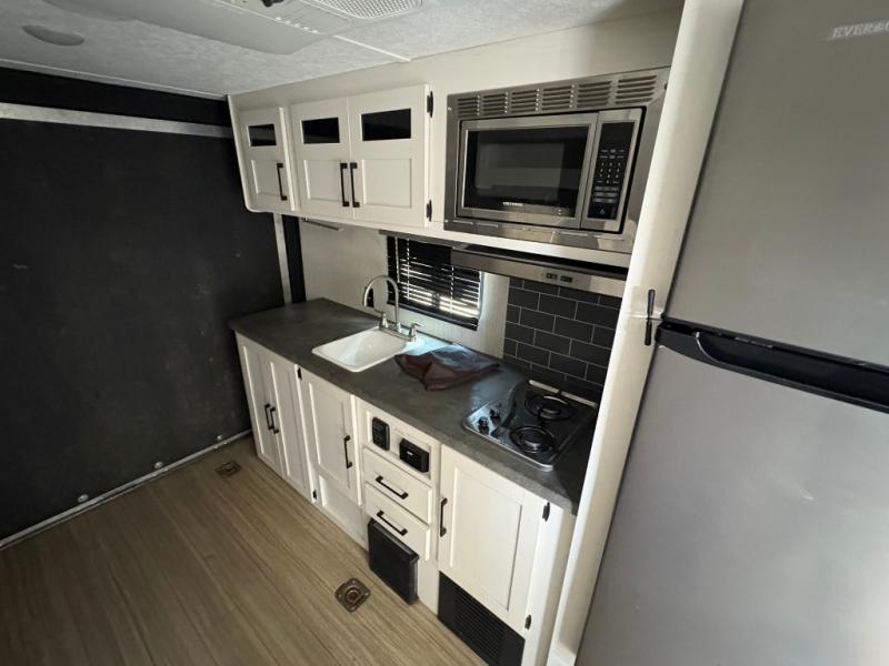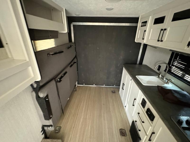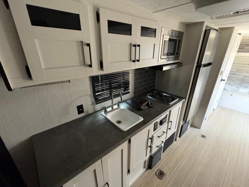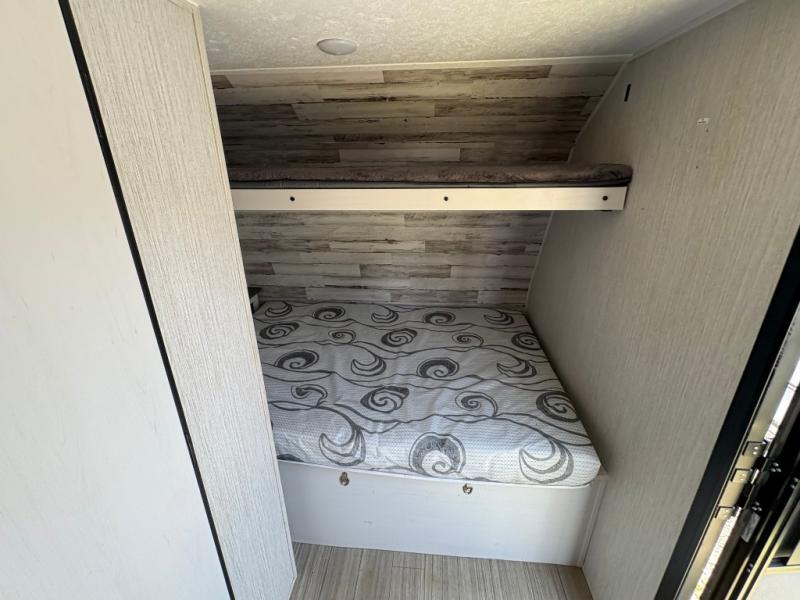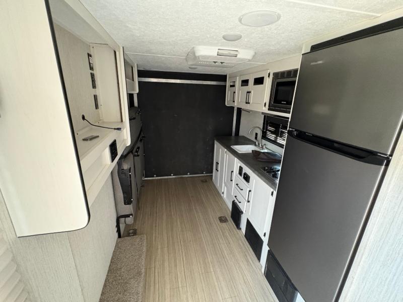 Ramp up the fun in this travel trailer toy hauler! You can easily load your toy(s) in the 14'9" of cargo space with different widths depending how much space you need. After unloading, this area will become your living and kitchen combined space. There is a two-burner cooktop, a residential refrigerator, and counter space for the cook plus you can relax on the rollover sleeper sofa on the opposite side until someone needs this for their sleeping arrangements. The bathroom includes a toilet and shower to clean off the dirt from the ride, and the front offers a queen bed with bunk above.