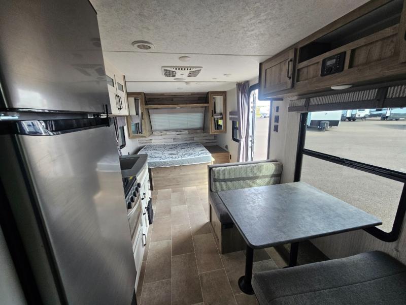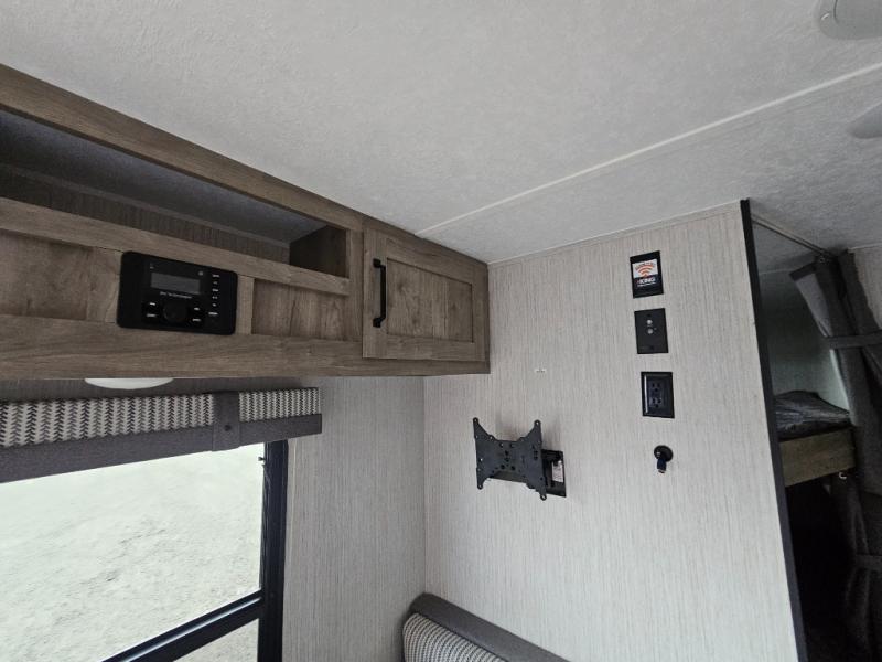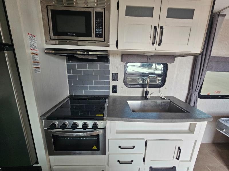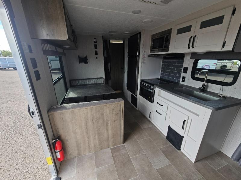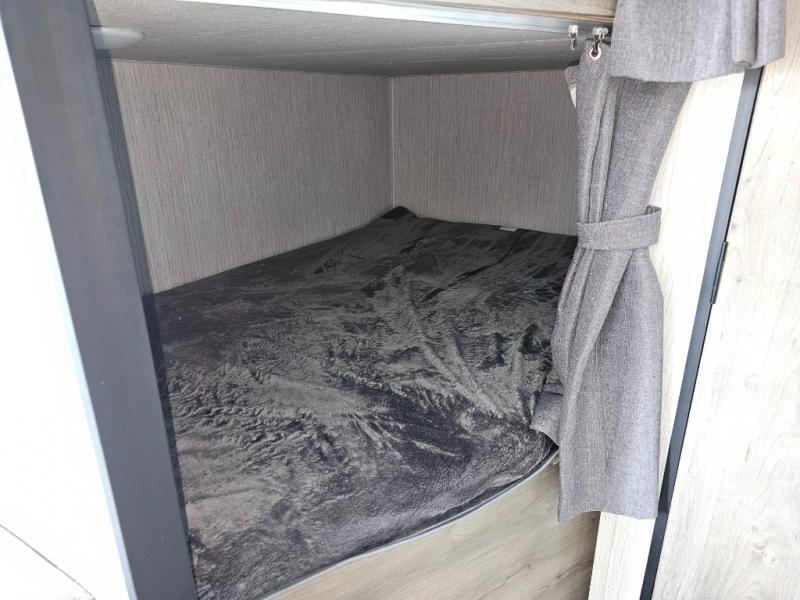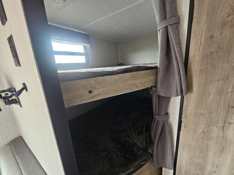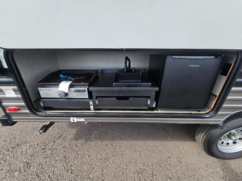 Pack your bags and load up the kiddos for a fun weekend camping trip in this travel trailer! You will enjoy a good night's rest on the front 60" x 74" RV queen bed with shirt closets on either side to hang your clothes, and the kids will sleep good on the 48" x 76" double stacked double bunk beds with storage underneath and a curtain to draw at night. The booth dinette can even transform into an extra sleeping space when you aren't using it for dining or playing games. Speaking of meals, you can prepare your best ones and cook them on the three burner cooktop or add the optional outside mini camp kitchen with a griddle, a mini fridge, and a sink with a drawer for your cooking utensils!