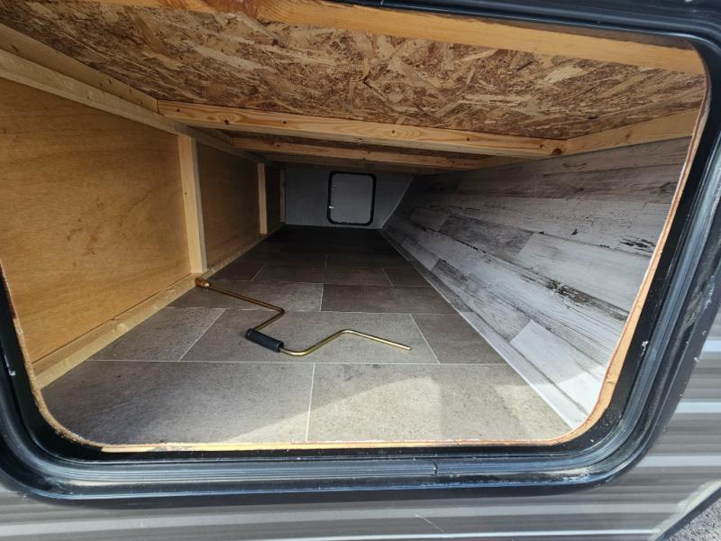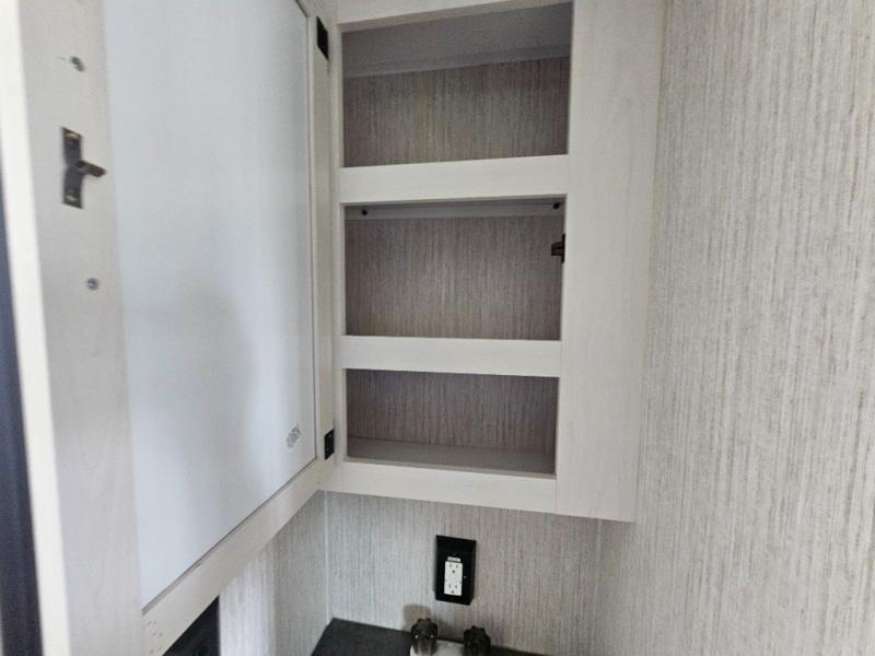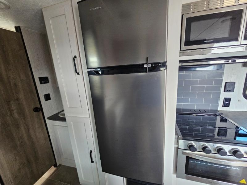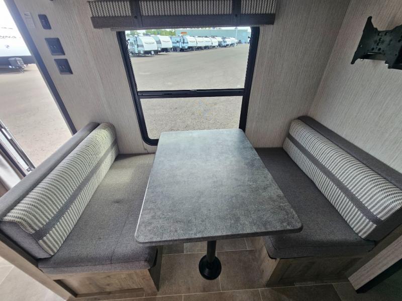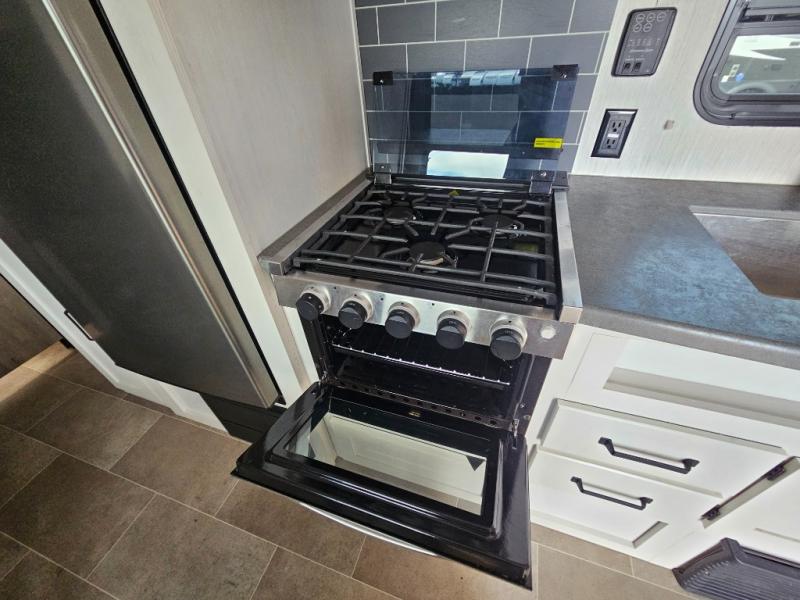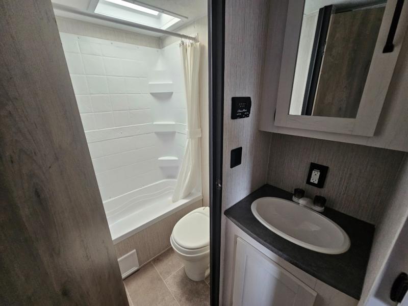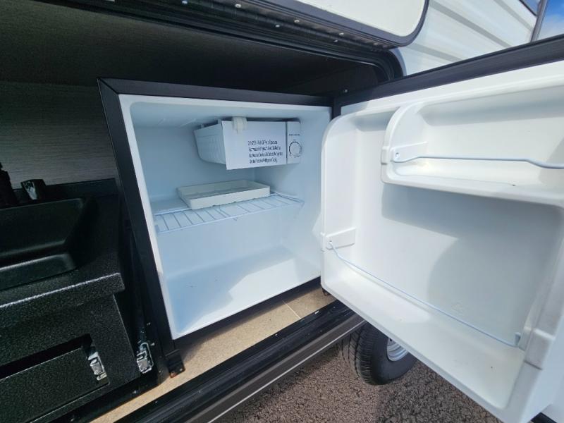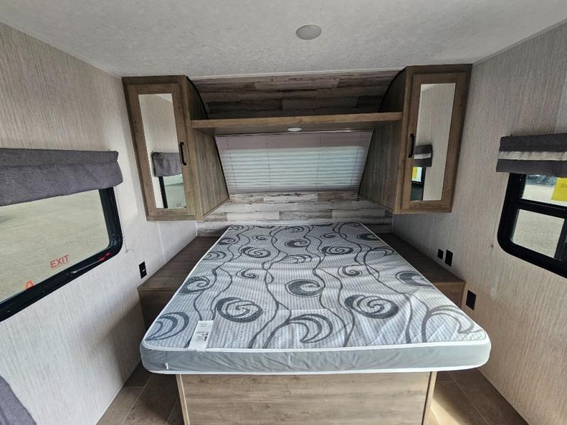 Pack your bags and load up the kiddos for a fun weekend camping trip in this travel trailer! You will enjoy a good night's rest on the front 60" x 74" RV queen bed with shirt closets on either side to hang your clothes, and the kids will sleep good on the 48" x 76" double stacked double bunk beds with storage underneath and a curtain to draw at night. The booth dinette can even transform into an extra sleeping space when you aren't using it for dining or playing games. Speaking of meals, you can prepare your best ones and cook them on the three burner cooktop or add the optional outside mini camp kitchen with a griddle, a mini fridge, and a sink with a drawer for your cooking utensils!