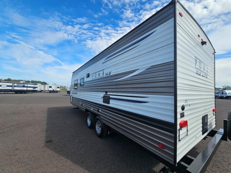 Each one of these Palomino Puma XLE Lite travel trailers and travel trailer toy haulers come with a popular selection of user-friendly amenities! Their sturdy construction consists of a solid I-beam powder coated frame, super lube axles, a Darco wrapped underbelly, and an AlphaPly roofing membrane, plus a smooth, radius front metal with diamond plate to protect your unit on the road. The tinted safety glass windows come with night shades for added privacy. The beautiful interiors have Beauflor linoleum, satin nickel hardware, a decorative kitchen backsplash, and a spice rack to make seasoning your foods easier. With a 13,500 BTU A/C unit, you will stay cool even on the hottest summer days. Come find the perfect model for you today!