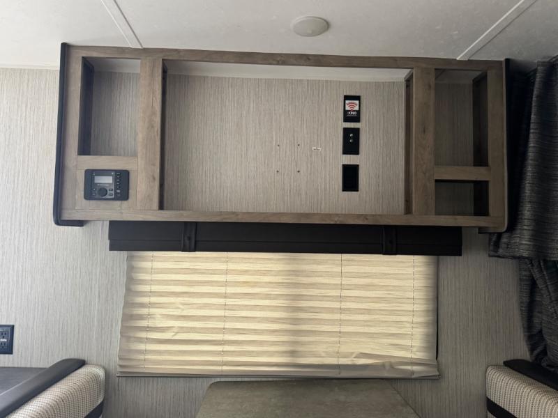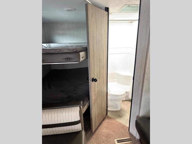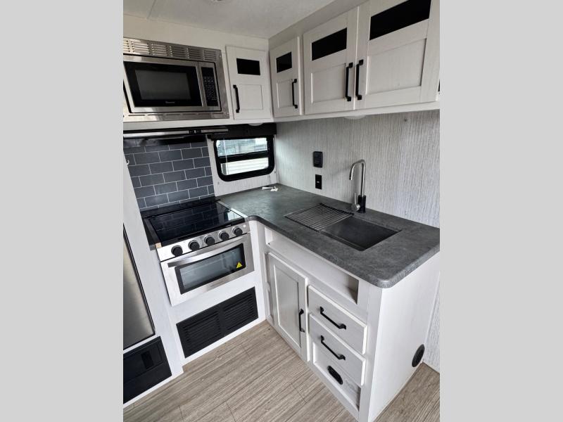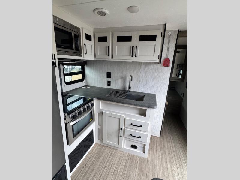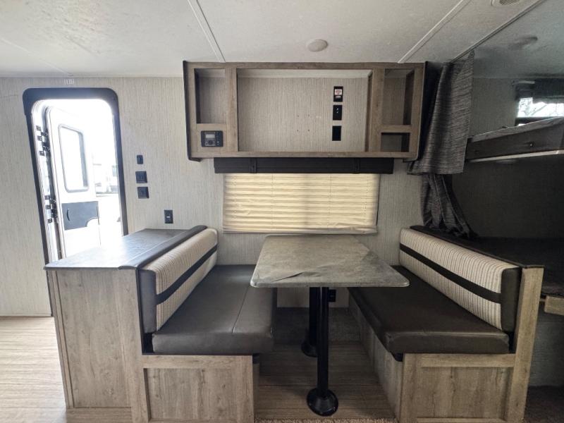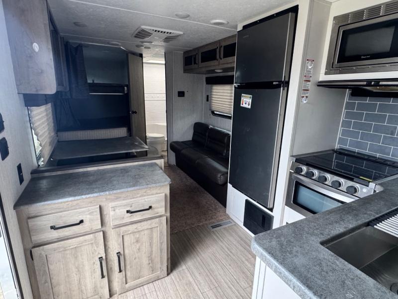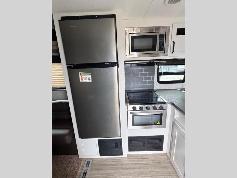 Everyone will have a comfortable place to sleep in this travel trailer! From the 60" x 74" RV queen bed in the front private bedroom to the 48" x 76" double stacked double bunk beds with storage underneath, plus you could even transform the booth dinette and 60" sofa into additional sleeping spaces if needed. The rear corner bathroom has a 32" x 40" shower with a seat to freshen up in each morning. In the kitchen, there is not only a three burner cooktop and a 11 cu. ft. refrigerator, but also a cabinet with drawers and doors for your storage needs. You could even add the optional outside mini camp kitchen with a mini fridge, a sink with a drawer for your cooking utensils, and a griddle to cook pancakes on while watching the beautiful sunrise!