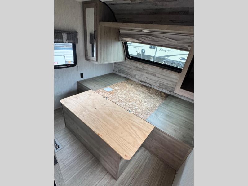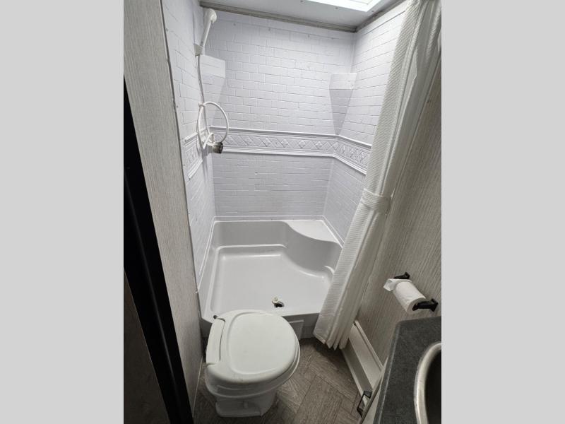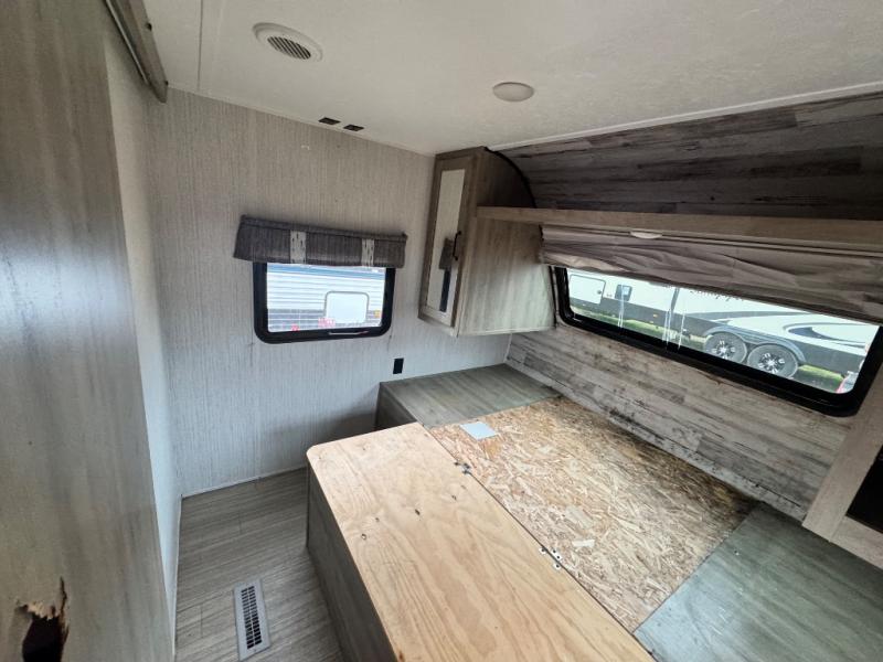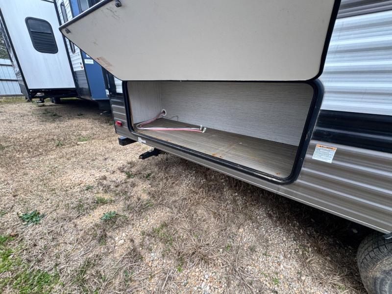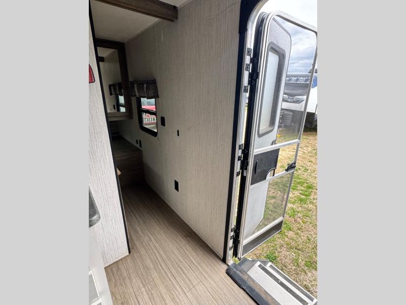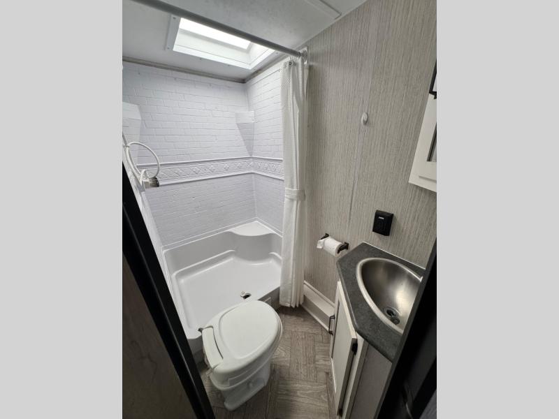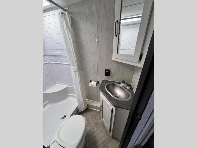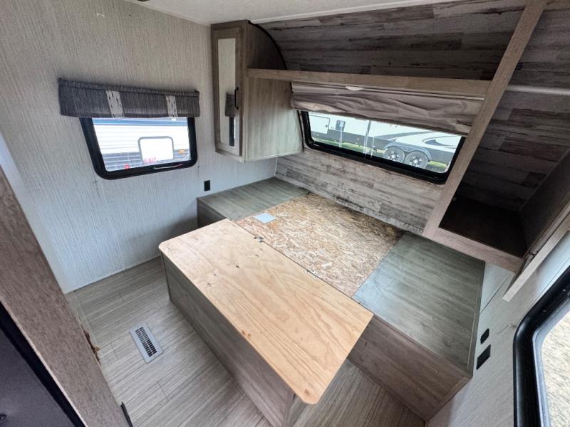 Everyone will have a comfortable place to sleep in this travel trailer! From the 60" x 74" RV queen bed in the front private bedroom to the 48" x 76" double stacked double bunk beds with storage underneath, plus you could even transform the booth dinette and 60" sofa into additional sleeping spaces if needed. The rear corner bathroom has a 32" x 40" shower with a seat to freshen up in each morning. In the kitchen, there is not only a three burner cooktop and a 11 cu. ft. refrigerator, but also a cabinet with drawers and doors for your storage needs. You could even add the optional outside mini camp kitchen with a mini fridge, a sink with a drawer for your cooking utensils, and a griddle to cook pancakes on while watching the beautiful sunrise!