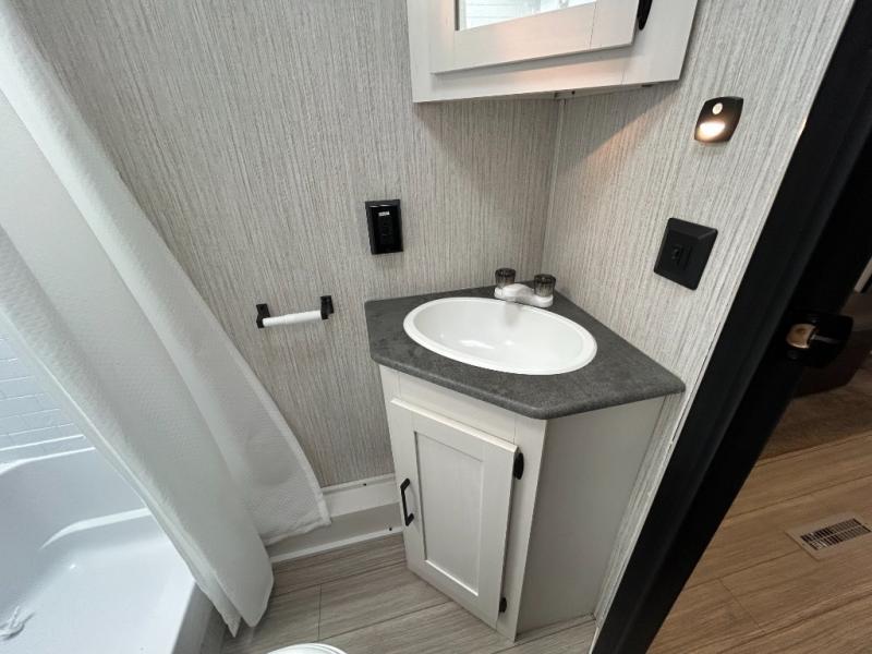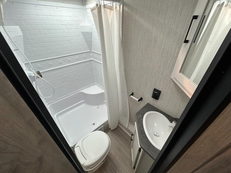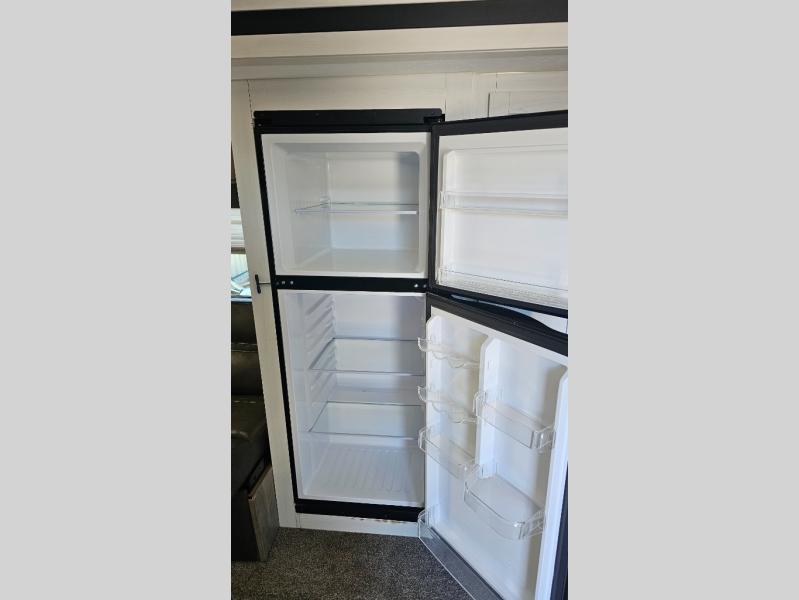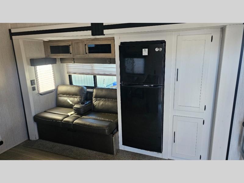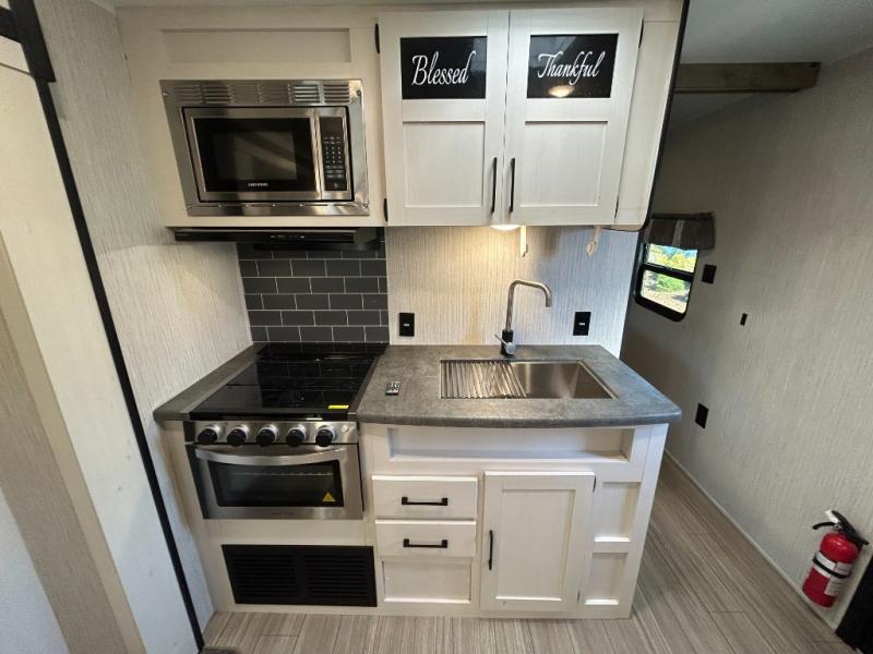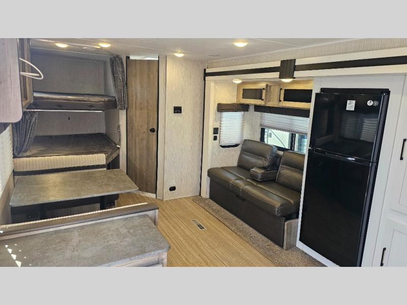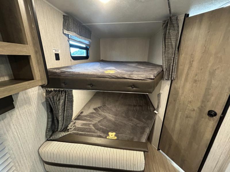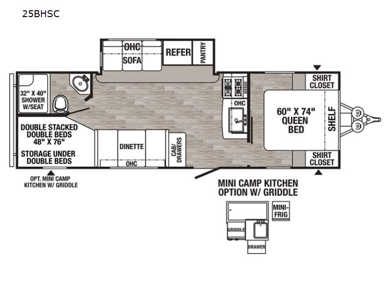 There's room for the whole family in this travel trailer! You will enjoy your own privacy with the front private bedroom which features a 60" x 74" RV queen bed with shirt closets on either side to hang your clothes, and a shelf above for your books or alarm clock. The kiddos can sleep on the set of 48" x 76" double stacked double bunk beds with storage underneath. They can even invite a friend or two to join in on the fun and sleep on either the sofa or booth dinette once converted. Everyone can freshen up in the rear corner bathroom with a 32" x 40" shower with a seat, and keep their bellies full with the three burner cooktop. You could even choose to add the optional outside mini camp kitchen with a griddle, a mini fridge, and a sink with a drawer below for your cooking utensils if you like cooking outdoors!