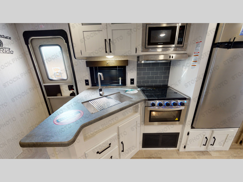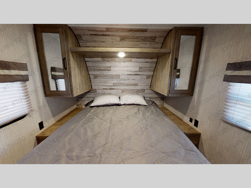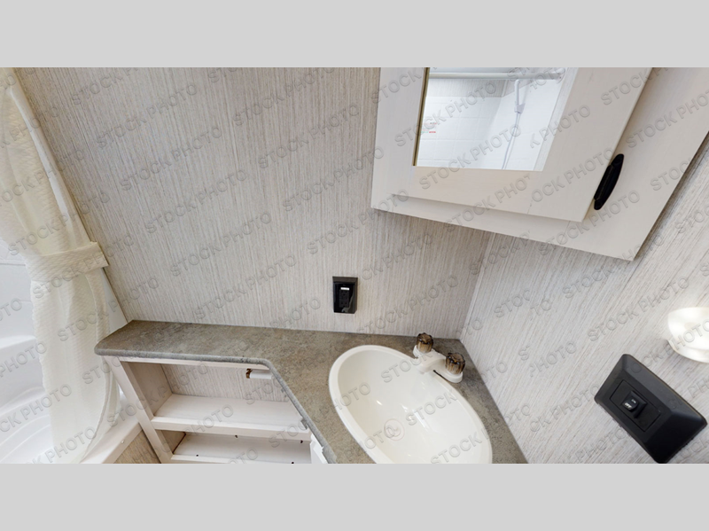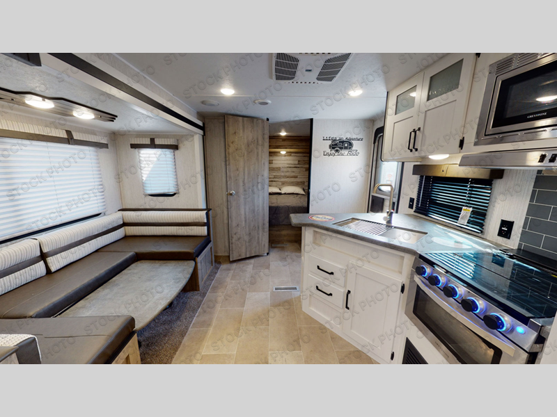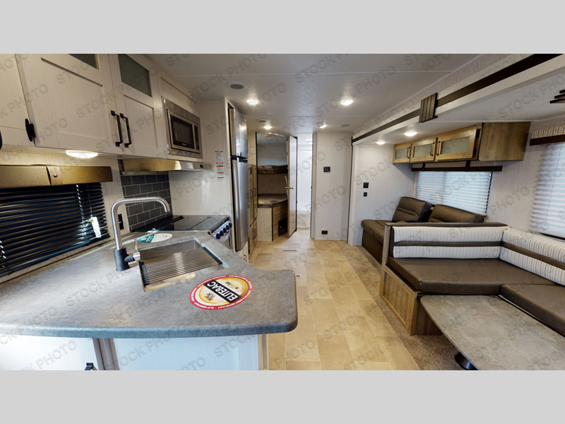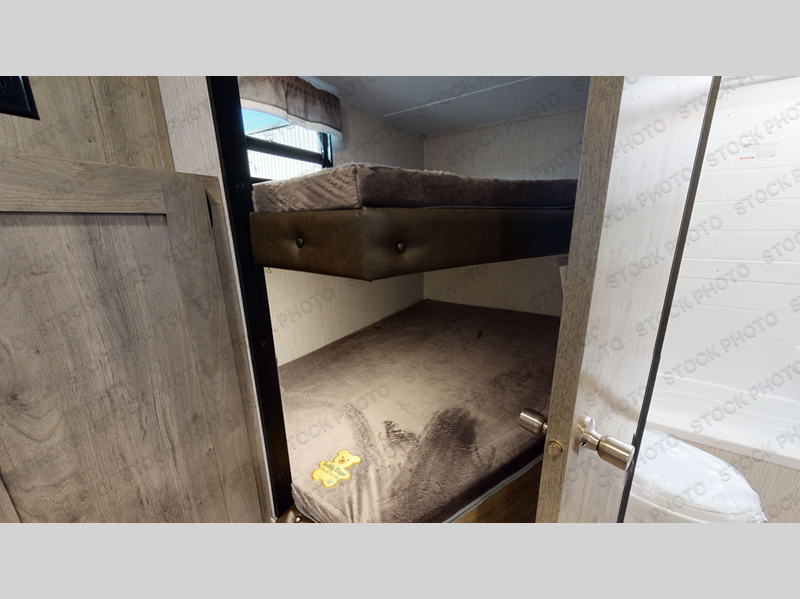 This travel trailer has everything you will need for a comfortable camping trip! It features a front private bedroom with a 60" x 74" RV queen bed with shirt closets on either side of it and a shelf above for your books. After you have prepared a delicious home cooked meal with the three burner cooktop, head to the U-shaped dinette and comfortably enjoy it. If you ate a little too much then you can relax on the sofa while watching a movie at the entertainment center. Behind the entertainment center there is a wardrobe/pantry for your storage needs. The kids can sleep on the set of 48" x 76" double stacked double beds with storage underneath and a curtain to draw. You can even add the optional outside mini camp kitchen with a mini fridge, a sink with a drawer for your utensils, and a griddle to grill up some juicy burgers while breathing in fresh air!