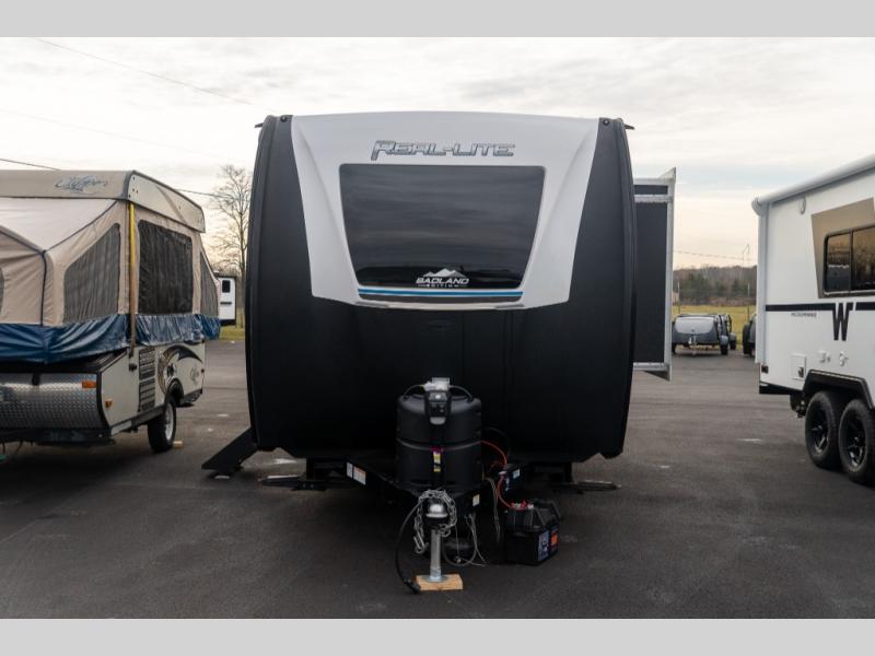 With any Real-Lite Mini single-axle travel trailer by Palomino there is Azdel construction that provides better insulation, is lighter than wood, and resistant to rot. A laminated roof, a Hi Gloss white exterior, and a front cap with a windshield and Line X protectant will allow you to enjoy your RV for years to come. Inside you will find LED lighting, an AM/FM Bluetooth stereo to listen to the big game or your favorite music, kitchen appliances to make meals, and a porcelain toilet for convenience, plus more depending on the Mini you choose. You can further customize your Real-Lite Mini by adding one or more of the many options offered, like the optional electric tongue jack, the optional frameless windows, or the optional Badlands Package!