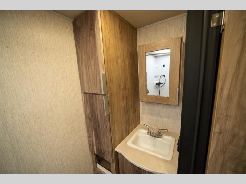 Looking for a flexible space to provide both a living area and bedroom? Enjoy the extra floor space provided by a slide out in this versatile trailer. The front offers a queen Murphy bed and sofa combination plus two wardrobes and overhead storage for your things. The chef will have a two burner cooktop and a microwave, a kitchen sink and overhead storage, plus a 10 cu. ft. refrigerator nearby and a pantry for the goodies. The booth dinette slide out allows you to dine, play games as well as sleep one on the furniture once it is easily setup for bedtime. And the rear full bath is a clean decision for all and provides privacy.