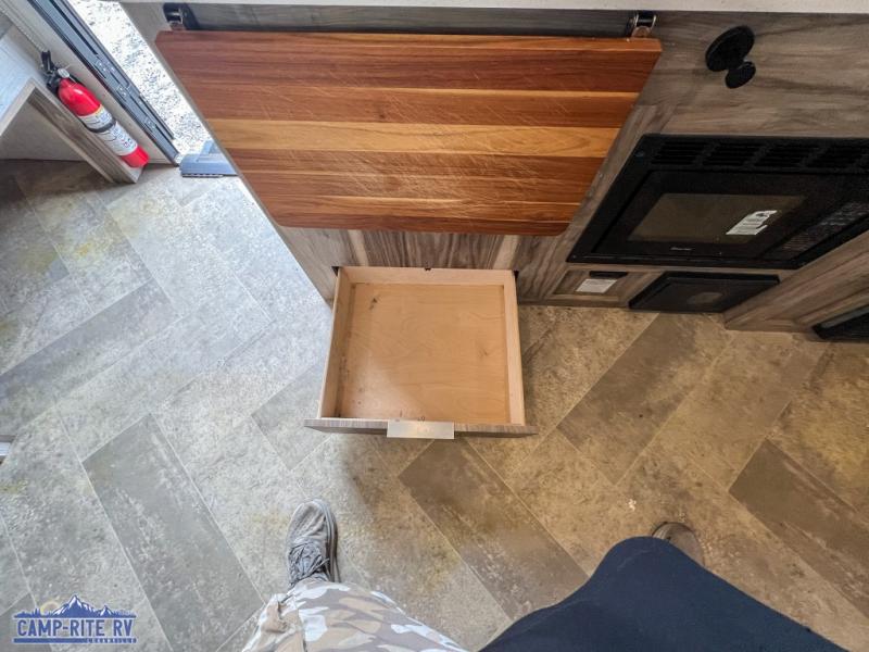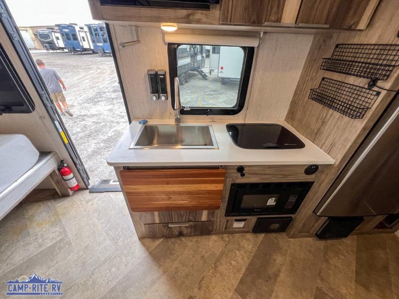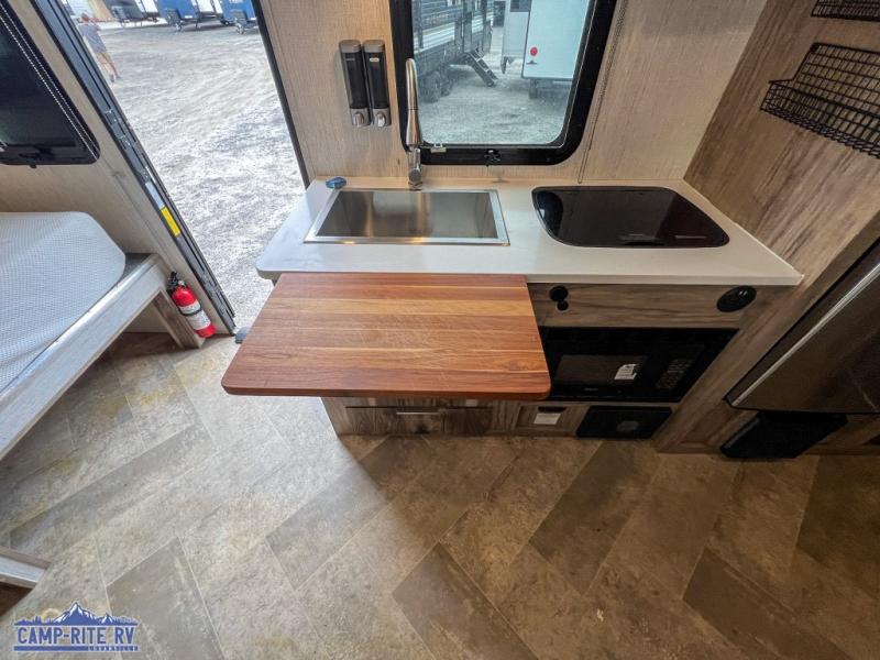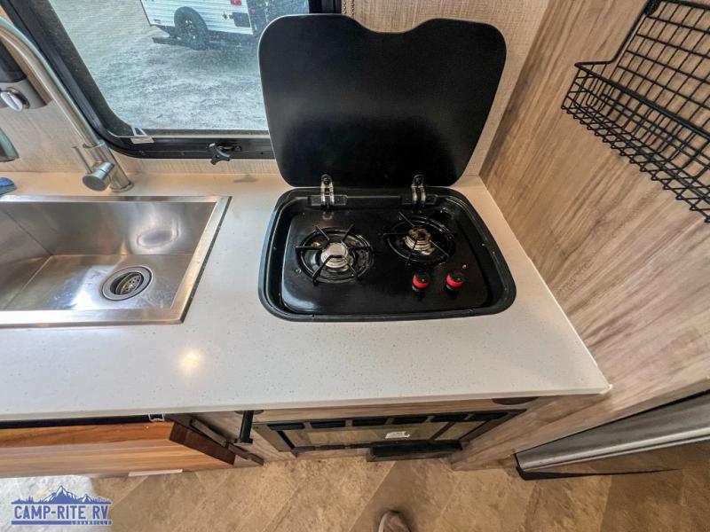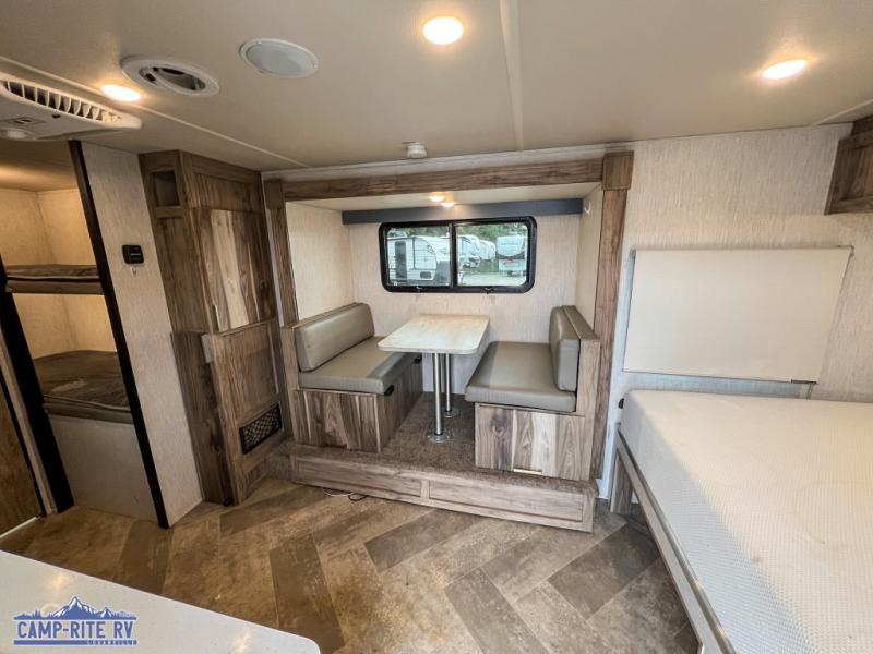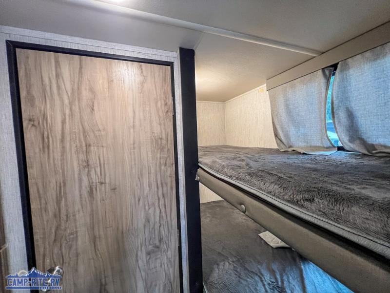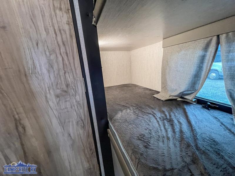 This Mini is great for a family that needs sleeping space for five or a group of friends that enjoys camping together! The owners will have a queen Murphy bed to sleep on at night once it is easily set up after enjoying the sofa during the daytime. There is a set of bunk beds in the rear next to the toilet and shower room that offers convenience and privacy, and the dinette slide out offers dining and sleeping space, plus extra floor space for all to move about the trailer. There is a two burner cooktop and microwave for the chef to make warm meals, and a pantry for dry goods and snacks, plus a 10 cu. ft. refrigerator. Outside, the 15' power awning can provide some protection from the sun during the day and at night the LED light is handy while staying up late.