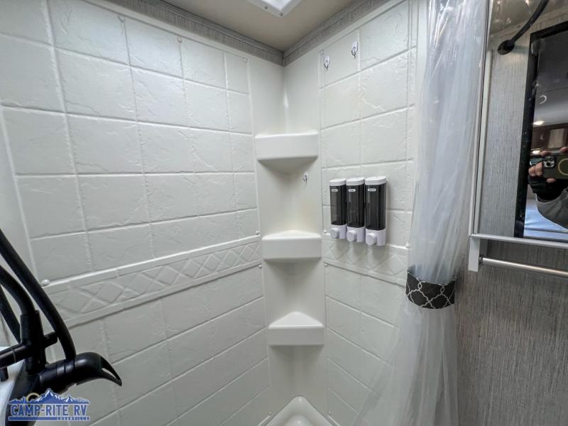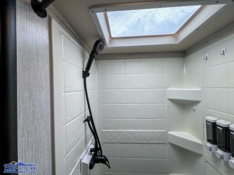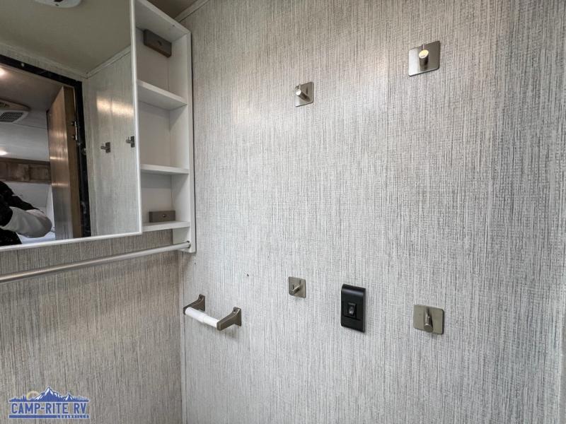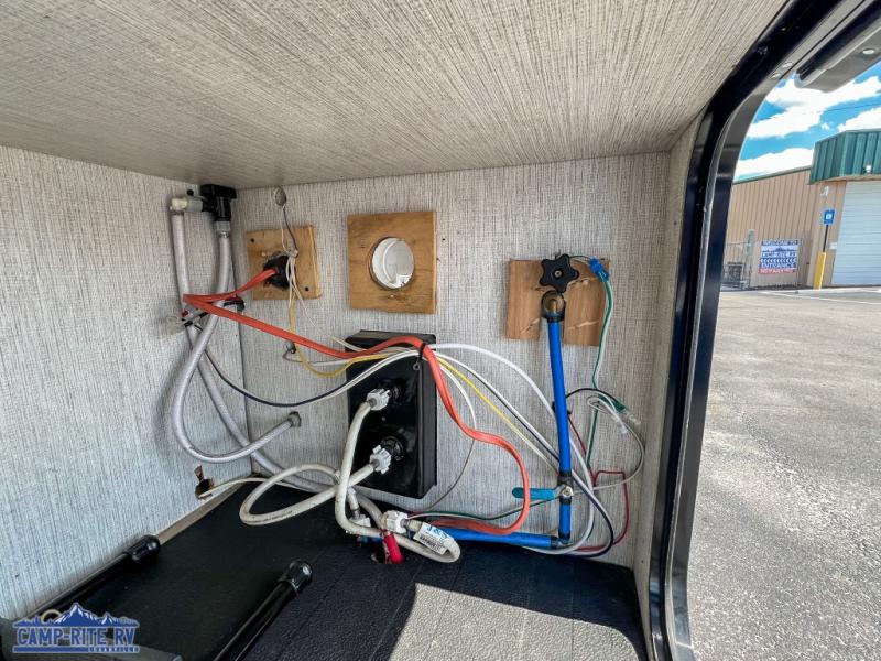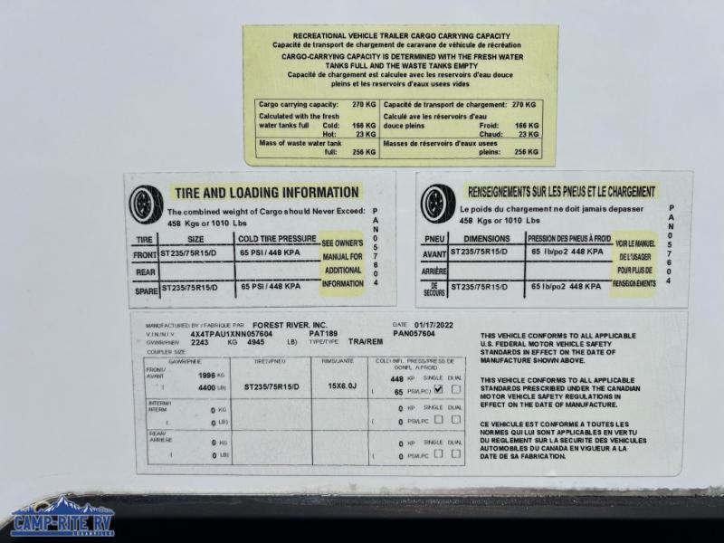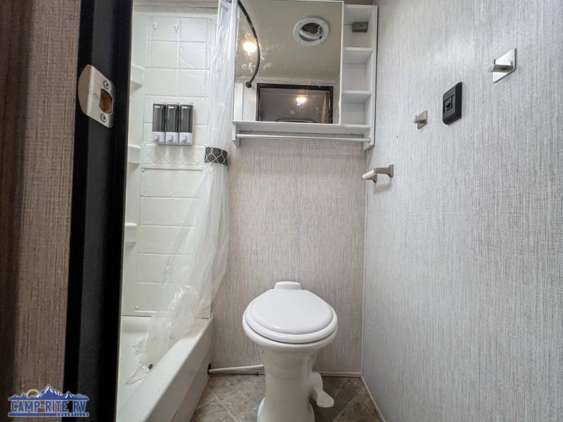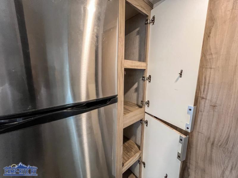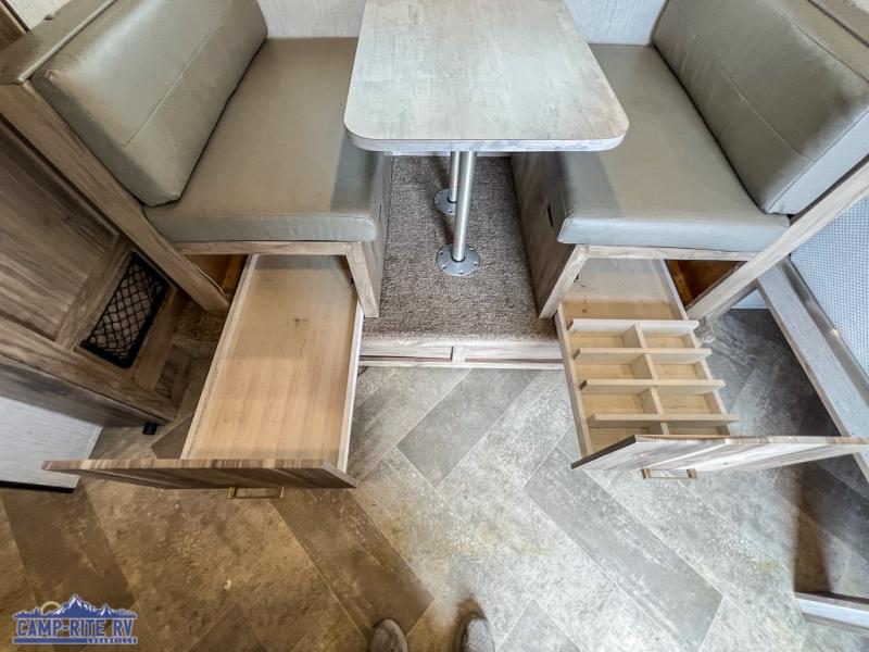 This Mini is great for a family that needs sleeping space for five or a group of friends that enjoys camping together! The owners will have a queen Murphy bed to sleep on at night once it is easily set up after enjoying the sofa during the daytime. There is a set of bunk beds in the rear next to the toilet and shower room that offers convenience and privacy, and the dinette slide out offers dining and sleeping space, plus extra floor space for all to move about the trailer. There is a two burner cooktop and microwave for the chef to make warm meals, and a pantry for dry goods and snacks, plus a 10 cu. ft. refrigerator. Outside, the 15' power awning can provide some protection from the sun during the day and at night the LED light is handy while staying up late.
