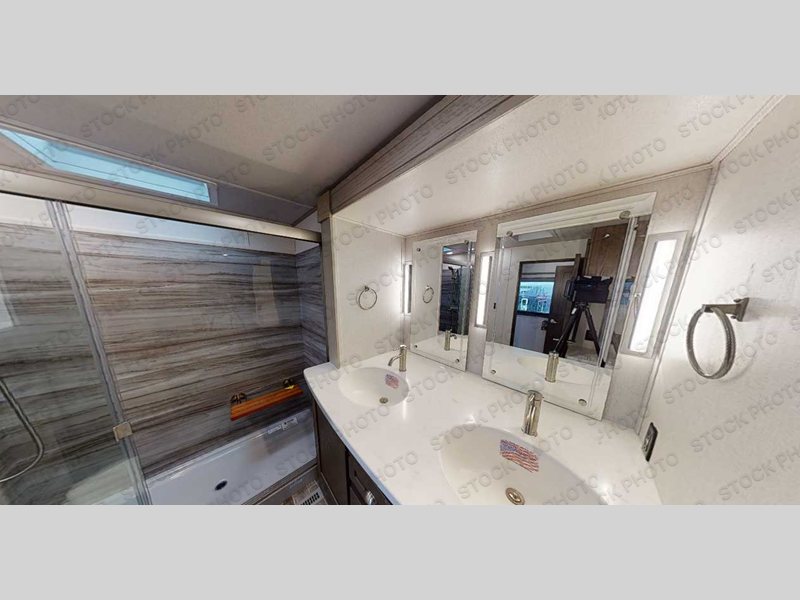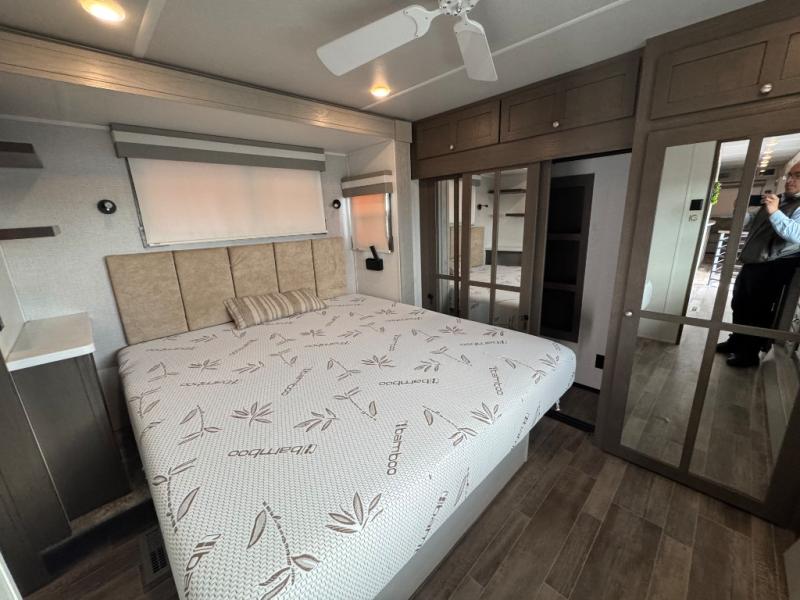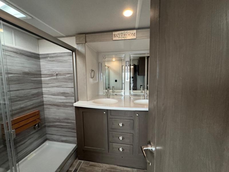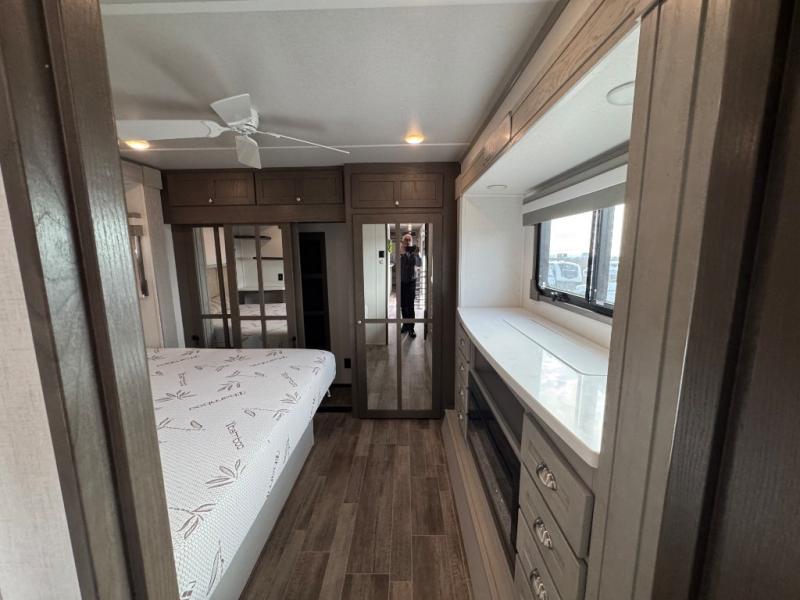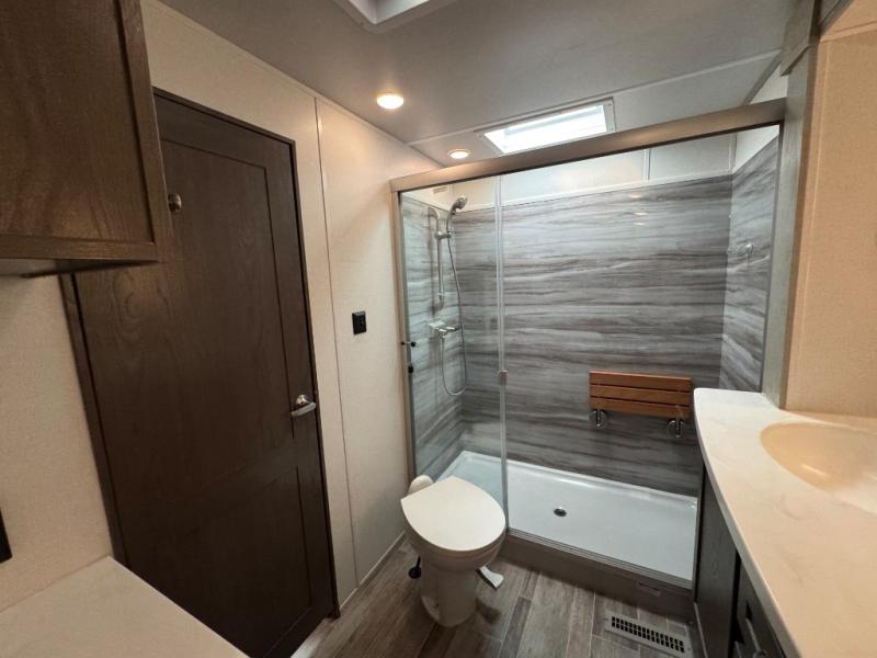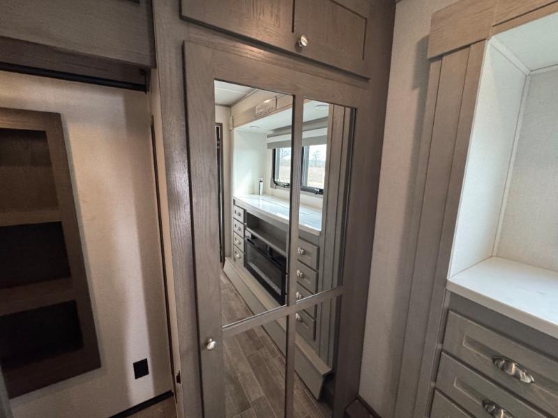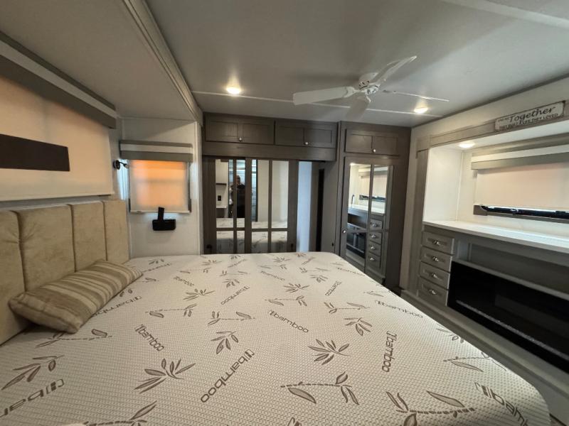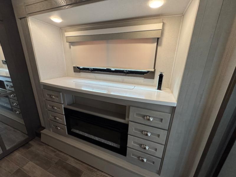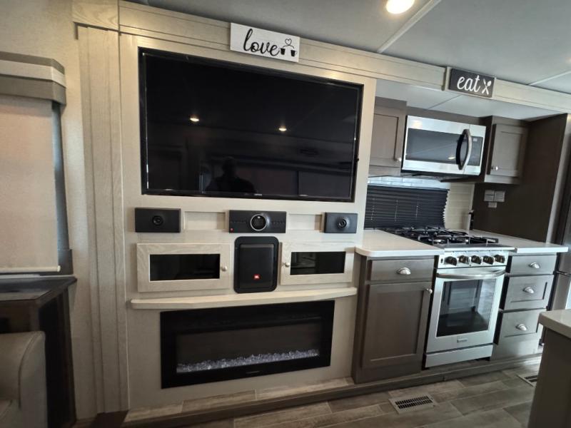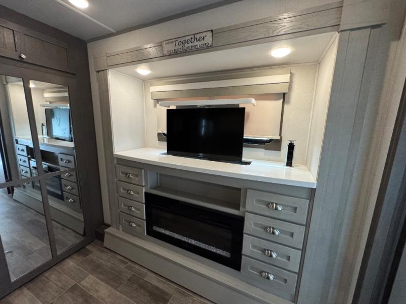 Wherever you like to travel with your fifth wheel, you will love each and every detail from the unique 36" entry to the walk-in pantry. The spacious main living and kitchen area gives the cook a kitchen island, a residential stainless steel four-burner gas range and microwave, plus a walk-in pantry to keep lots of dry goods and snacks for those longer trips. The two opposing slides offer more floor space to stretch out and relax on the split tri-fold sofa, or enjoy a cold drink on the theater seat across from the fireplace. The wall-mounted free-standing table with an extension and residential dinette chairs offer dining inside as well as a place to work from if needed. The master suite allows you to sleep like a king, and watch the pop-up 32" TV with a fireplace below. There is a wardrobe, and a closet with removable shelf and a place to add a washer/dryer option. And you can easily enter the double entry bathroom through a pocket door to enjoy dual sinks, linen storage and the Signature Spa walk-in shower with teak wood seat.
