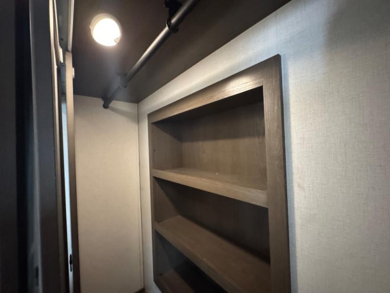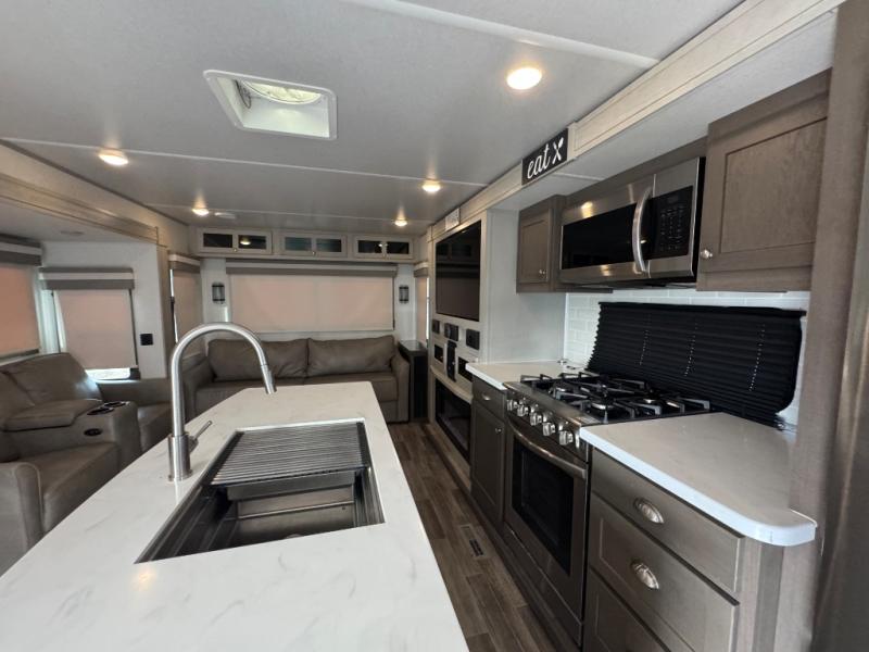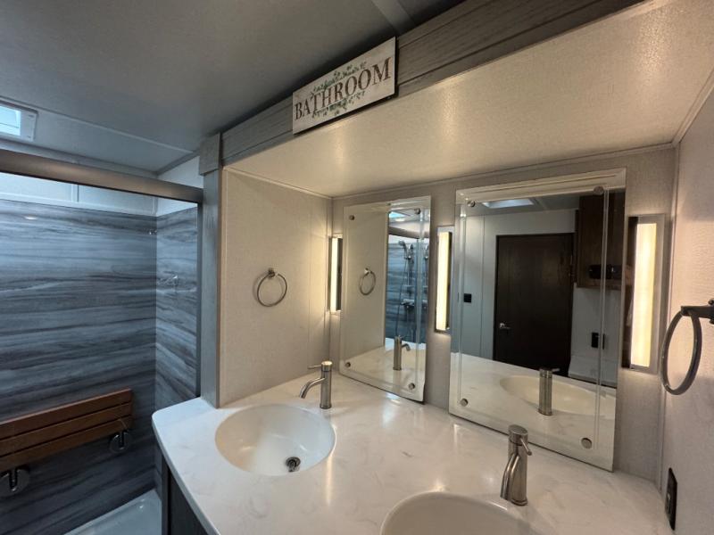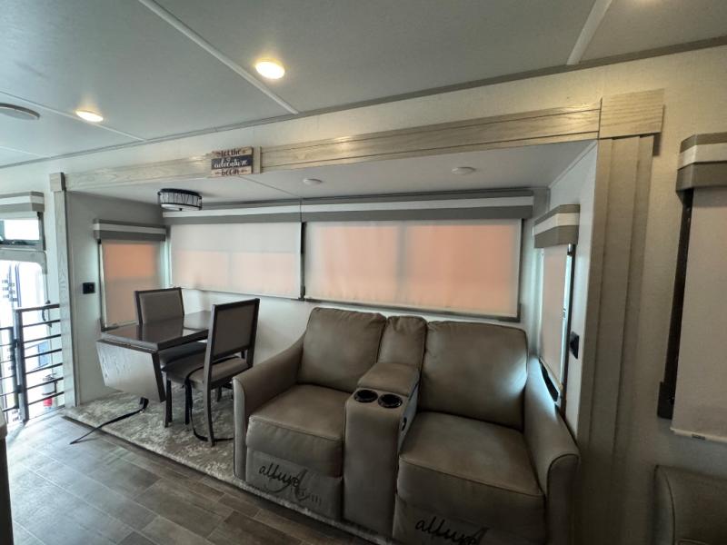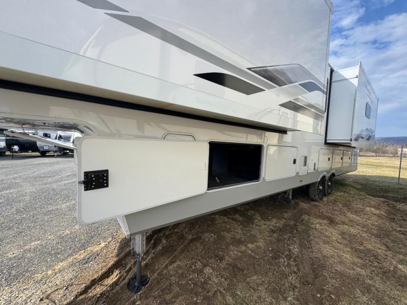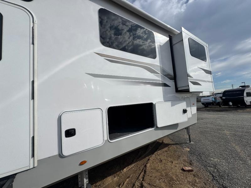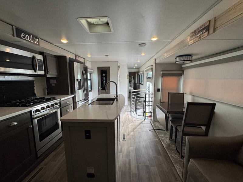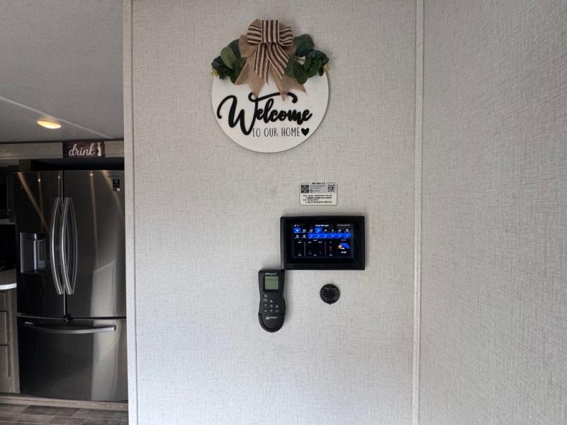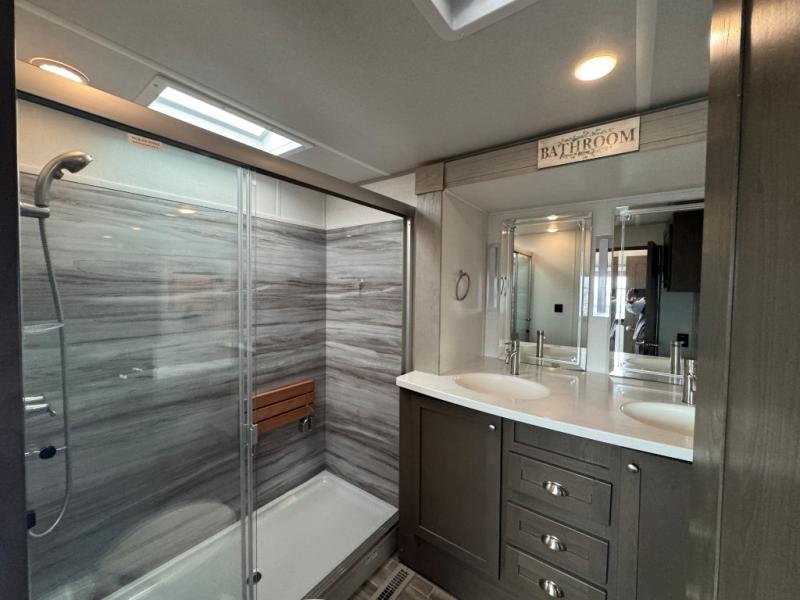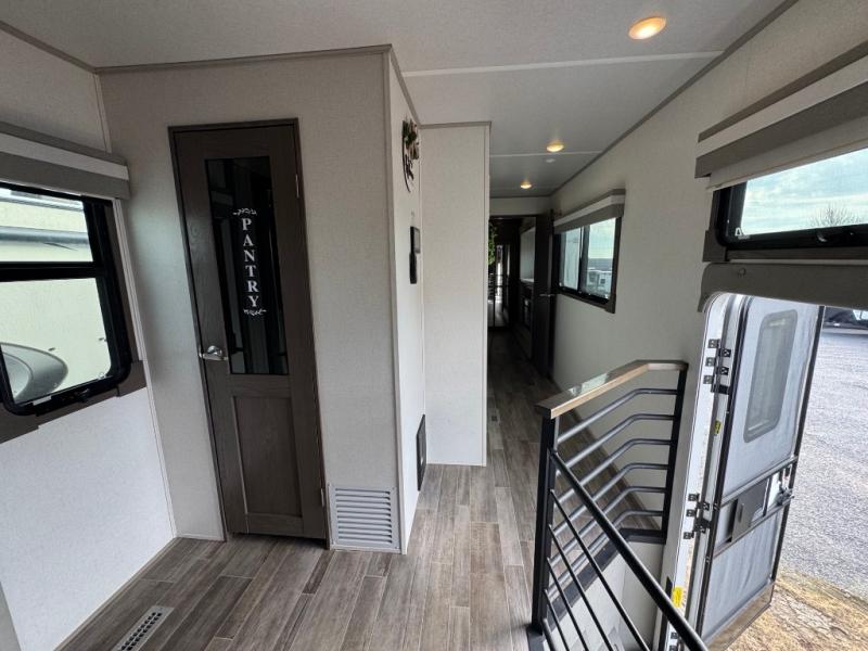 Wherever you like to travel with your fifth wheel, you will love each and every detail from the unique 36" entry to the walk-in pantry. The spacious main living and kitchen area gives the cook a kitchen island, a residential stainless steel four-burner gas range and microwave, plus a walk-in pantry to keep lots of dry goods and snacks for those longer trips. The two opposing slides offer more floor space to stretch out and relax on the split tri-fold sofa, or enjoy a cold drink on the theater seat across from the fireplace. The wall-mounted free-standing table with an extension and residential dinette chairs offer dining inside as well as a place to work from if needed. The master suite allows you to sleep like a king, and watch the pop-up 32" TV with a fireplace below. There is a wardrobe, and a closet with removable shelf and a place to add a washer/dryer option. And you can easily enter the double entry bathroom through a pocket door to enjoy dual sinks, linen storage and the Signature Spa walk-in shower with teak wood seat.
