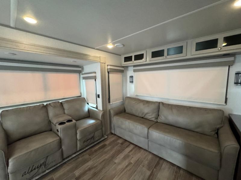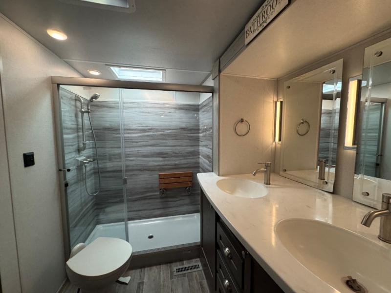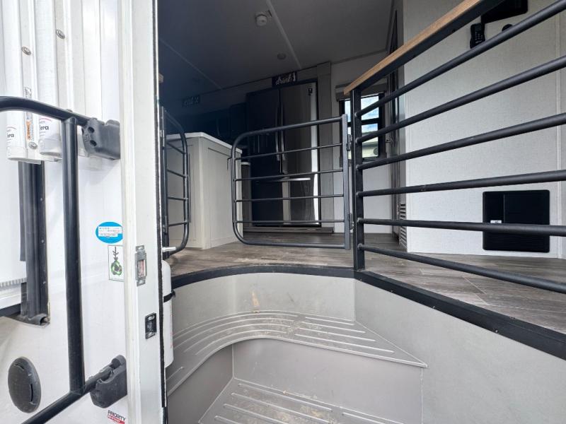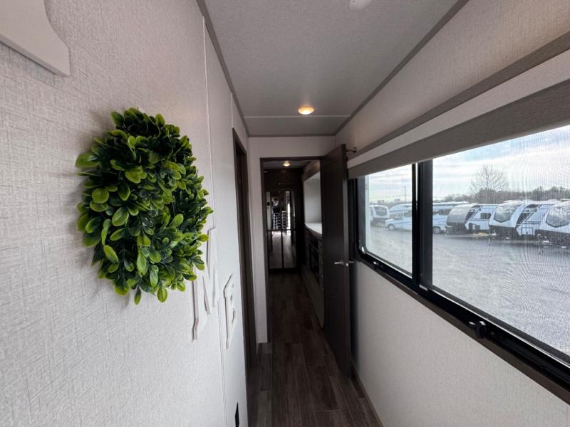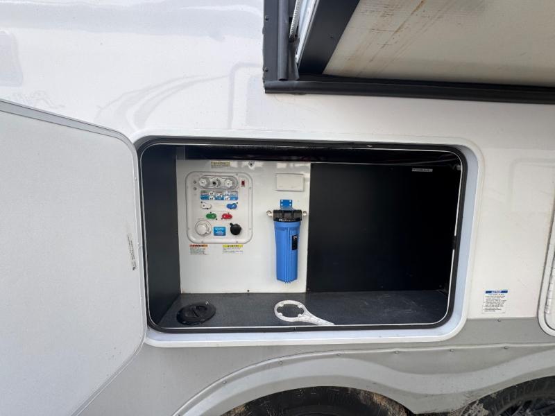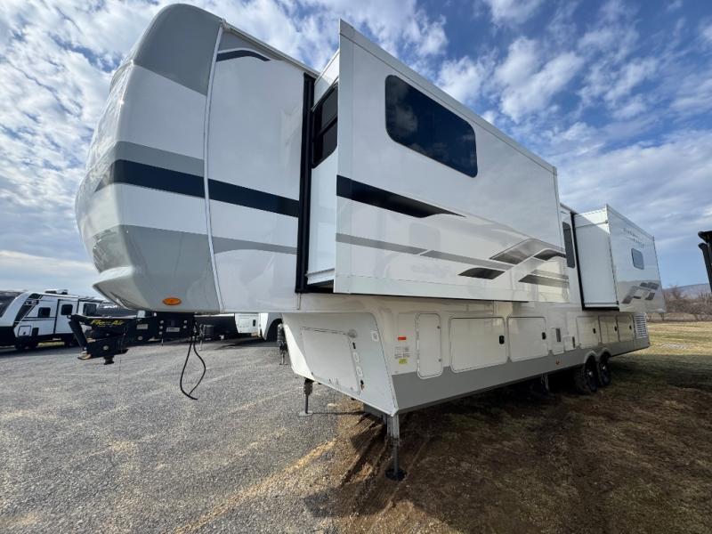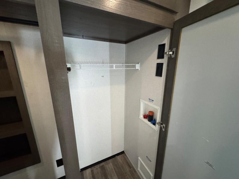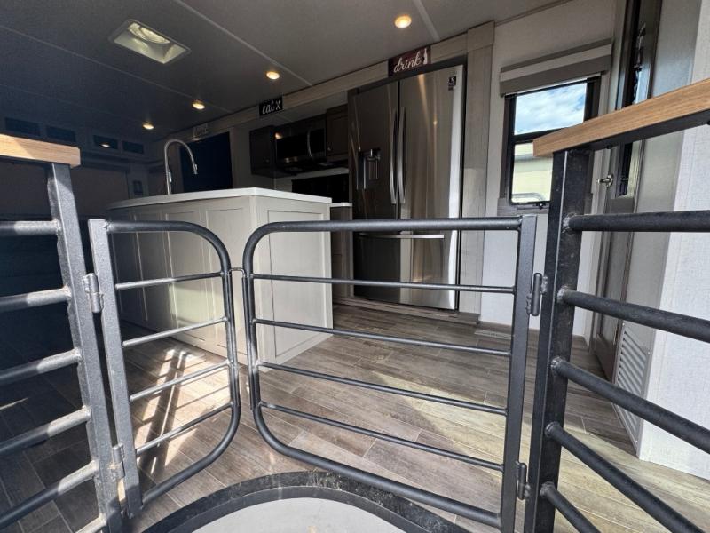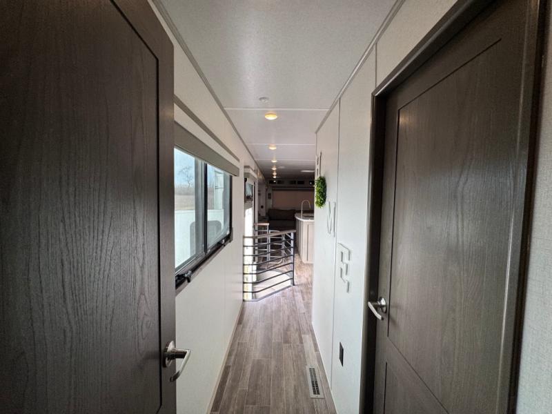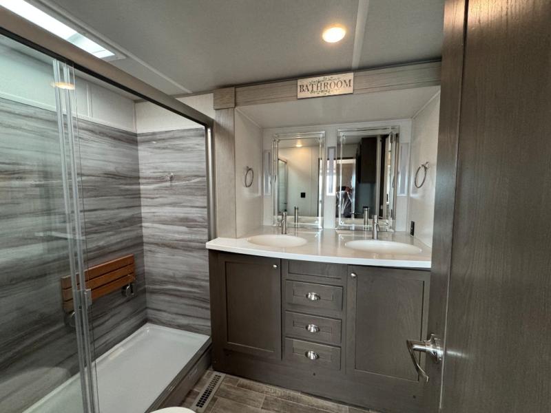 Wherever you like to travel with your fifth wheel, you will love each and every detail from the unique 36" entry to the walk-in pantry. The spacious main living and kitchen area gives the cook a kitchen island, a residential stainless steel four-burner gas range and microwave, plus a walk-in pantry to keep lots of dry goods and snacks for those longer trips. The two opposing slides offer more floor space to stretch out and relax on the split tri-fold sofa, or enjoy a cold drink on the theater seat across from the fireplace. The wall-mounted free-standing table with an extension and residential dinette chairs offer dining inside as well as a place to work from if needed. The master suite allows you to sleep like a king, and watch the pop-up 32" TV with a fireplace below. There is a wardrobe, and a closet with removable shelf and a place to add a washer/dryer option. And you can easily enter the double entry bathroom through a pocket door to enjoy dual sinks, linen storage and the Signature Spa walk-in shower with teak wood seat.
