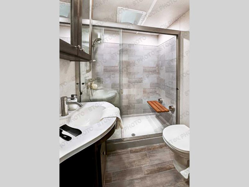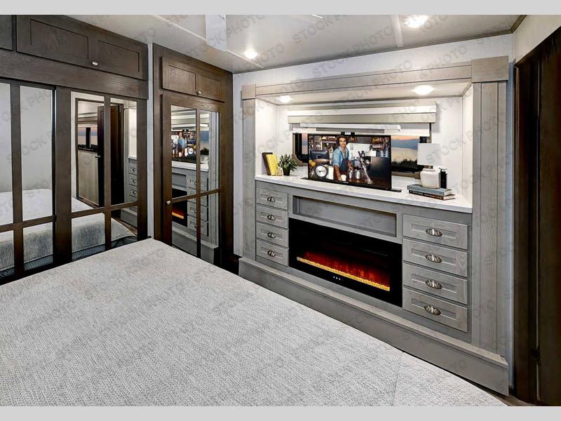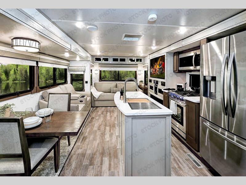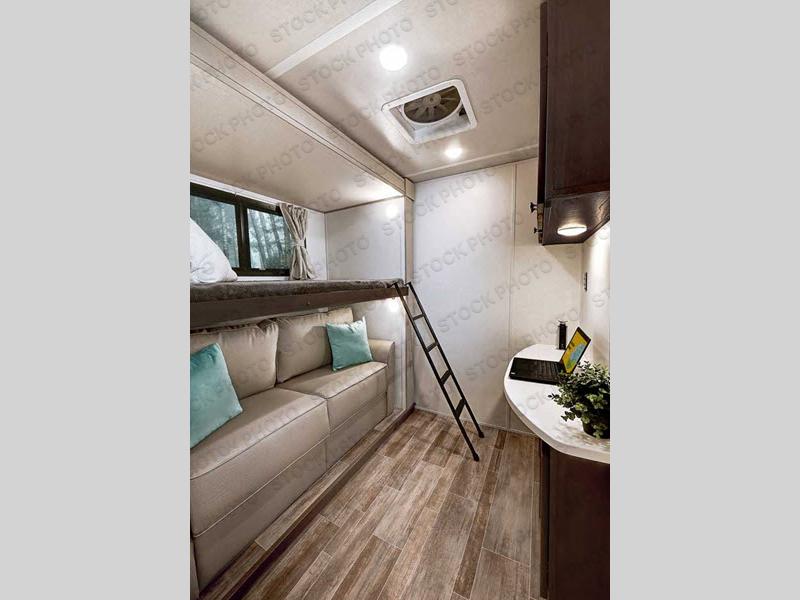 Get ready to live in comfort and style when you take this fifth wheel with you! You will love the unique railing entry and spacious main living area and kitchen thanks to the dual opposing slides. You can relax on the theater seats with cupholders, the split tri-fold sofa that also offers sleeping space, or at the wall-mounted free-standing table with extension and residential dinette chairs. The kitchen is loaded with amenities including the residential appliances, the pantry, and the island. And you will love the multi-functional middle bunkhouse that offers a flip-up bunk and 68" tri-fold sofa below, plus a desk countertop that you can utilize as an office or the kids can do homework from here. The front bedroom includes a king bed slide, a pop-up 32" TV with fireplace below, a wardrobe and a space prepped for a washer and dryer option. The Signature Spa walk-in shower with a teak wood seat inside the full bathroom is just another reason you will love this RV.
