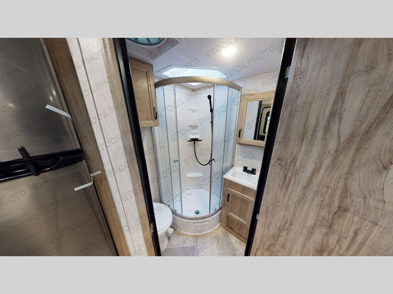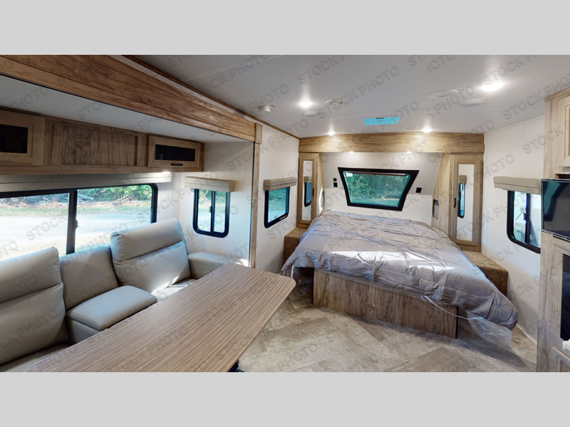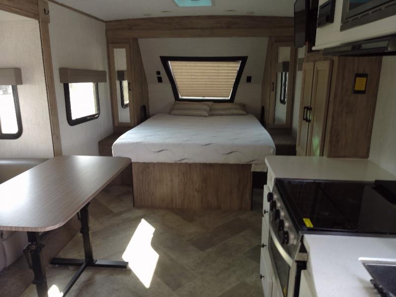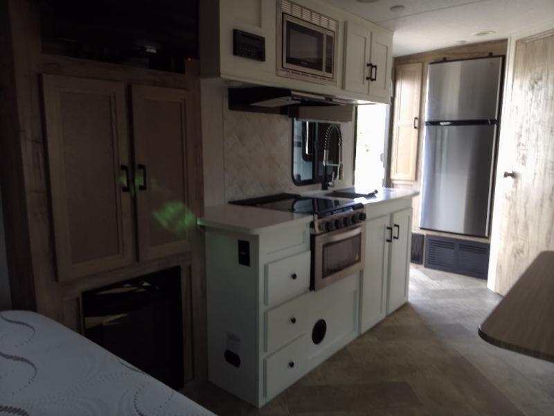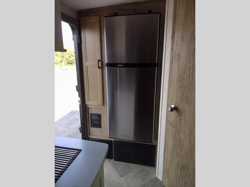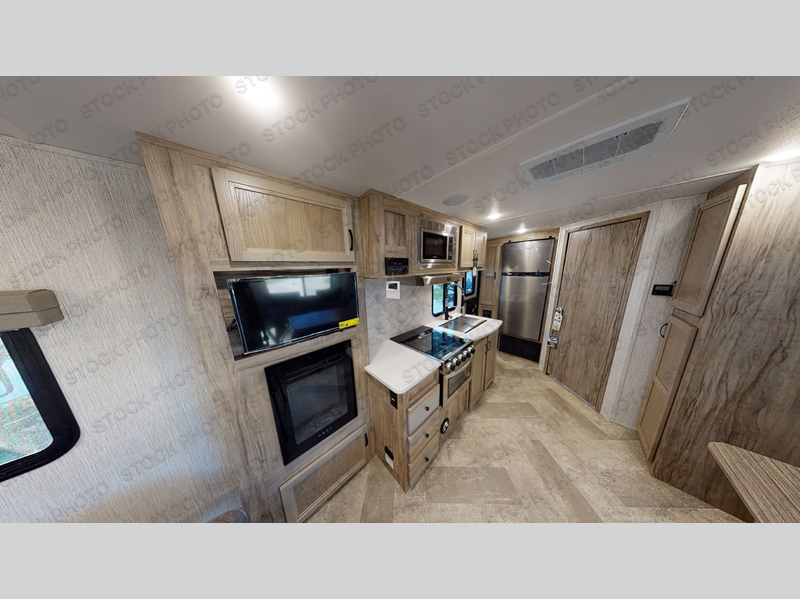 This trailer allows you to camp in comfort at your favorite RV sites thanks to the slide out sofa sleeper with a table to dine at, and the front queen bed to sleep on with dual wardrobes to store your clothing! The galley kitchen includes amenities such as a microwave, a glass top flush mount range, plus an 11 cu. ft. refrigerator. And there is a pantry for your goodies. The corner full bathroom offers a space-savings radius shower and linen storage, and there is an entry closet to keep the main area tidy.
