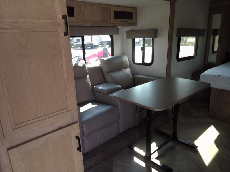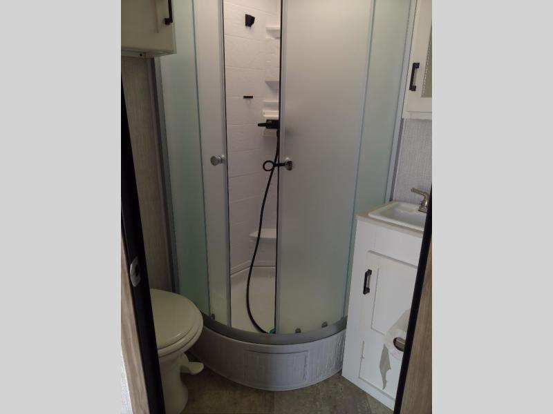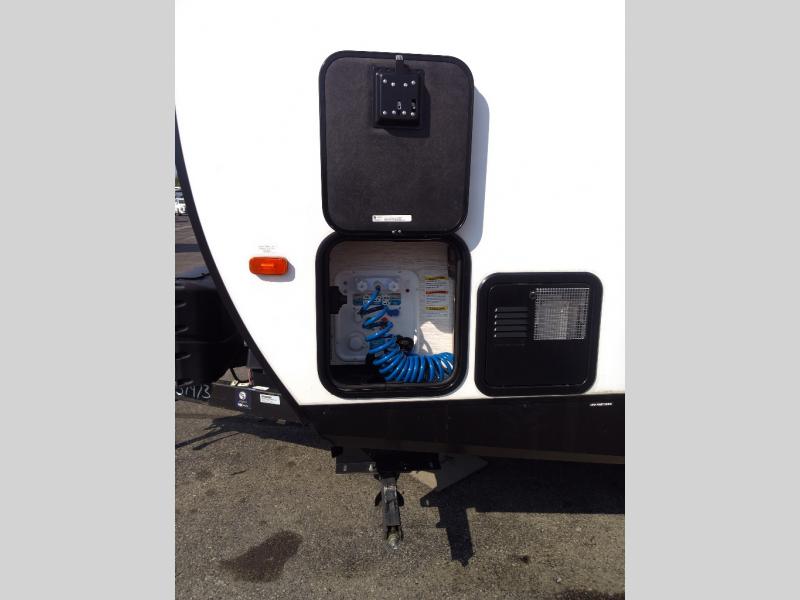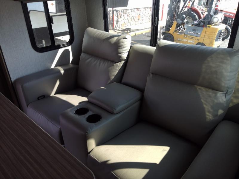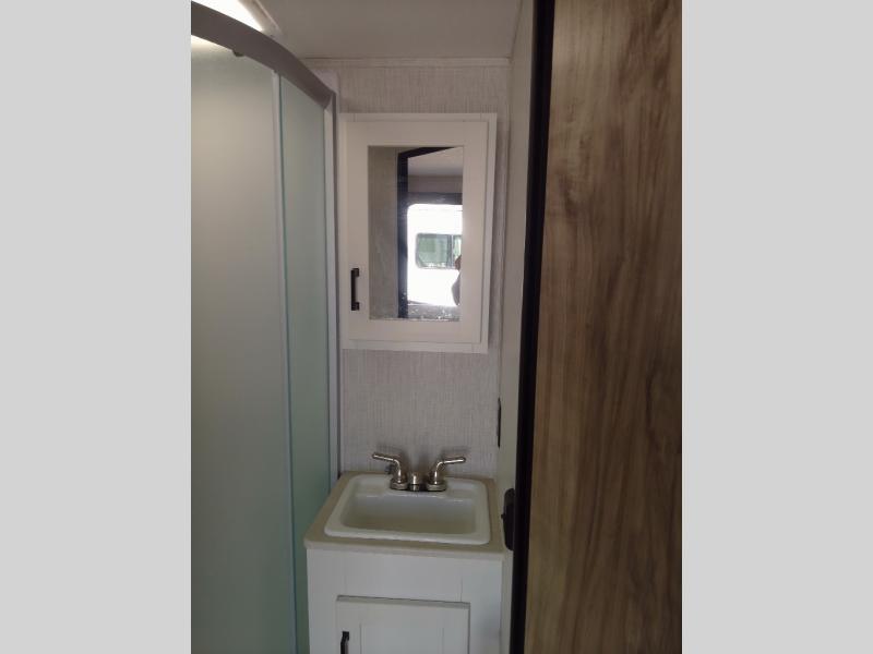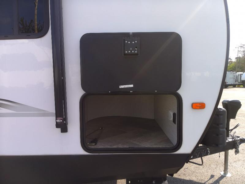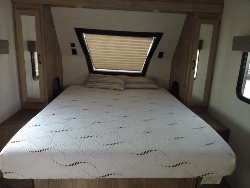 This trailer allows you to camp in comfort at your favorite RV sites thanks to the slide out sofa sleeper with a table to dine at, and the front queen bed to sleep on with dual wardrobes to store your clothing! The galley kitchen includes amenities such as a microwave, a glass top flush mount range, plus an 11 cu. ft. refrigerator. And there is a pantry for your goodies. The corner full bathroom offers a space-savings radius shower and linen storage, and there is an entry closet to keep the main area tidy.