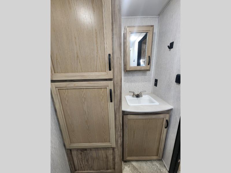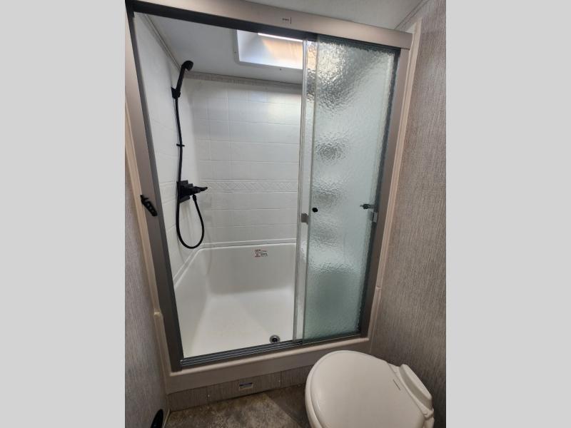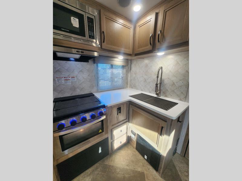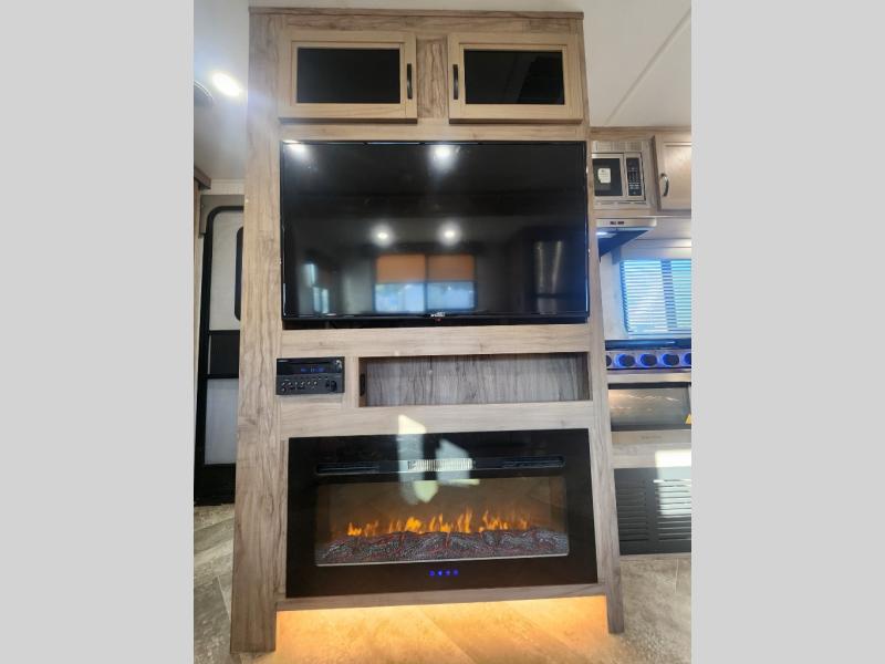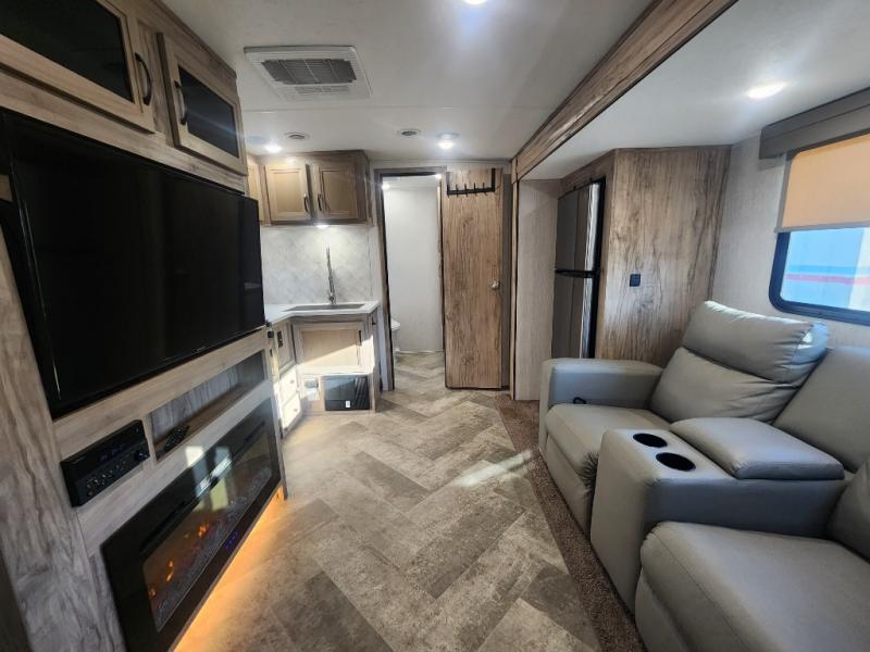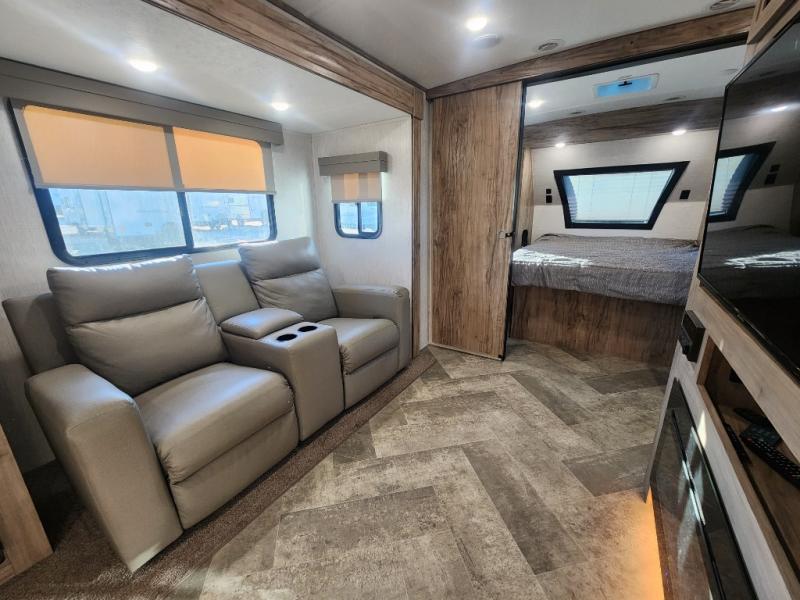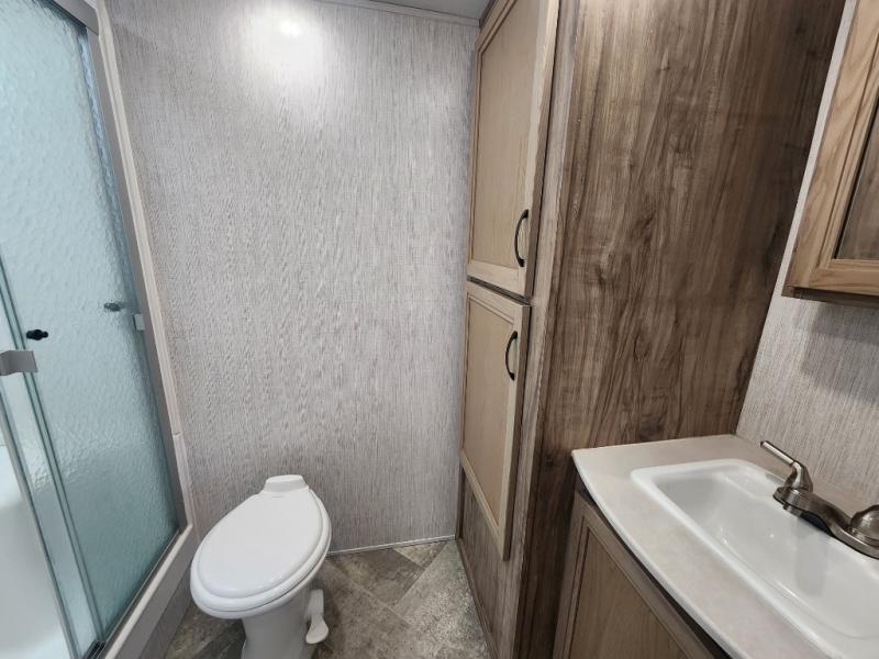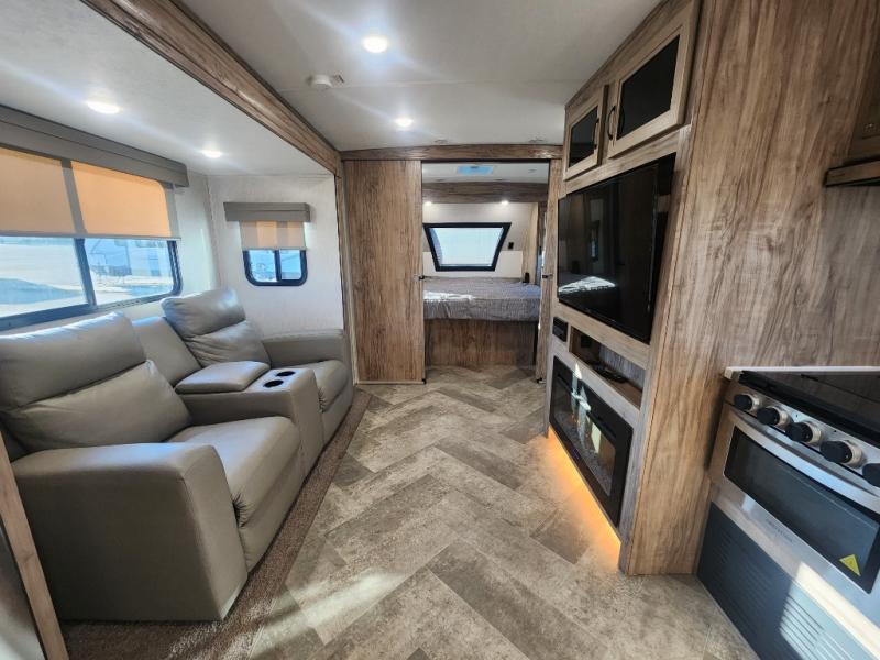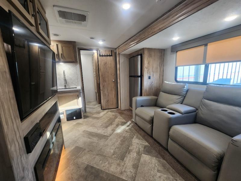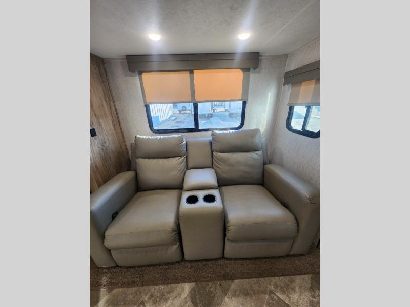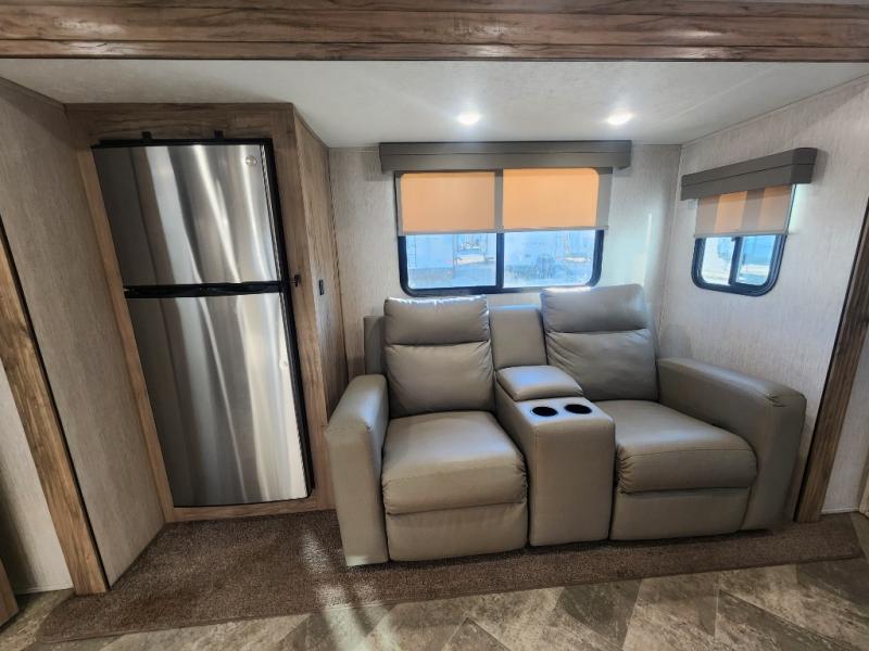 The cook in the family will love this trailer with a pull out stove with a refrigerator along the exterior for making meals while outdoors while everyone enjoys the protection from the 19' power awning. And the full kitchen amenities inside include a glass top flush mount range, a microwave, an 11 cu. ft. refrigerator and a pantry. You can relax inside on the theater seats that are within a large slide out while watching the entertainment center, and the entry closet is super handy. The full rear bathroom gives you the space you need as well as a shower with a seat. And the front bedroom provides a queen bed, dual wardrobes and privacy.