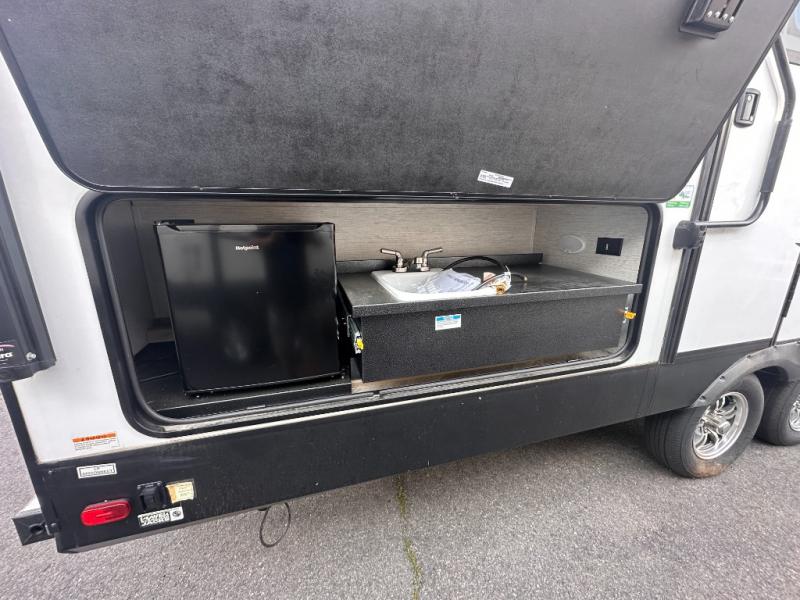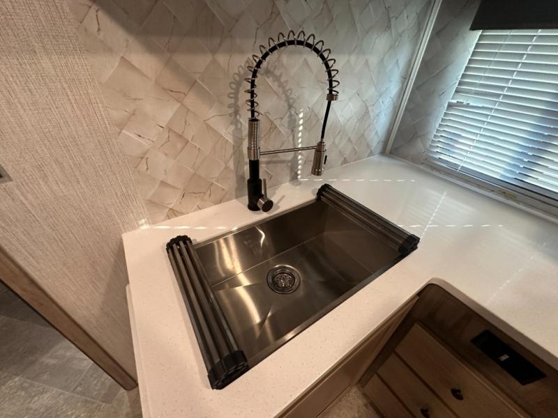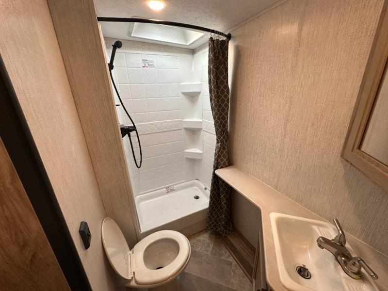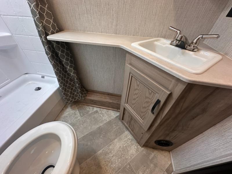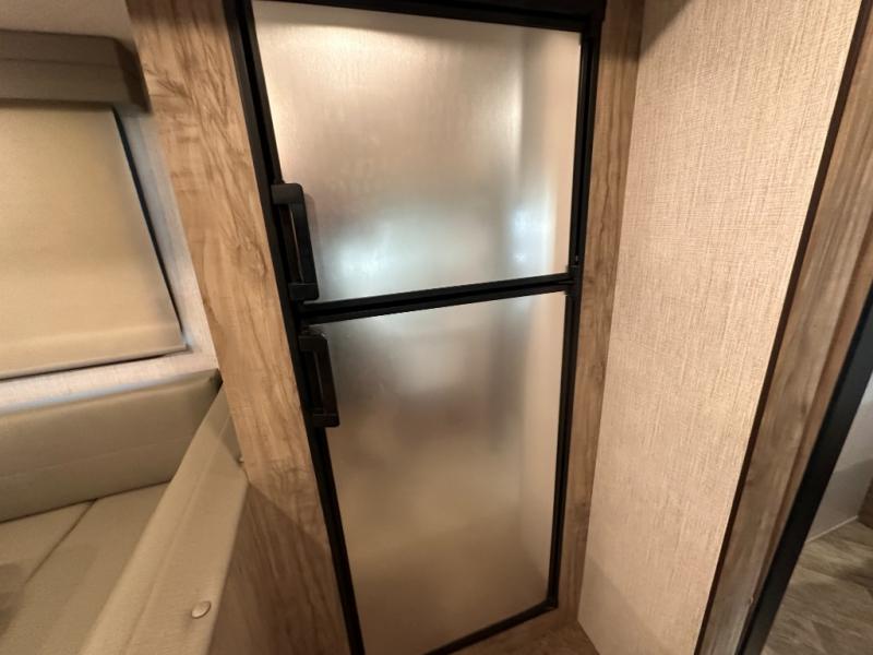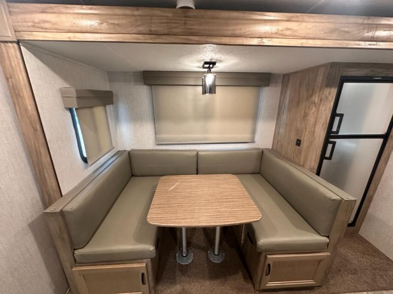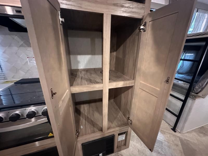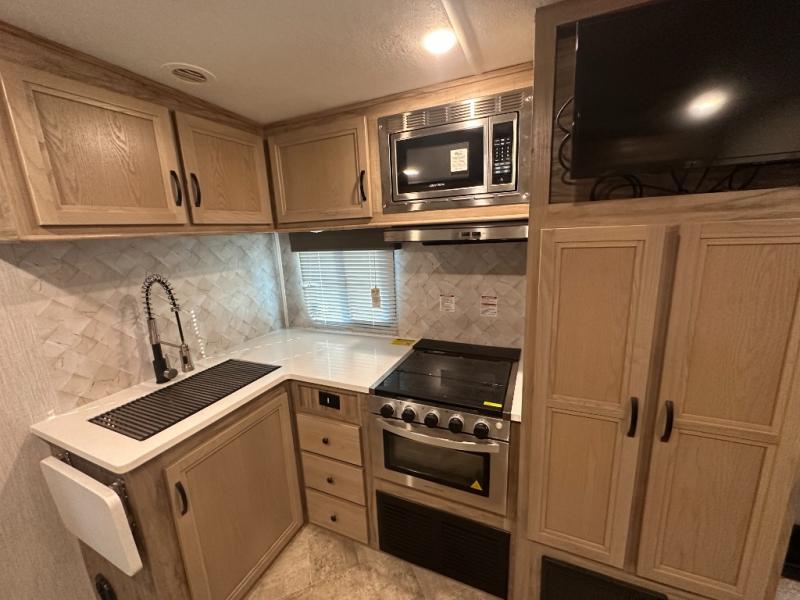 Your friends and family will love camping with you in this trailer that offers sleeping space for eight with the queen bed, the double-size bunks and the U-shaped dinette once it is easily set up for sleeping space. The cook will love the choice of making meals using the outside kitchen or the full amenities inside which include a glass top flush mount range, a microwave, an 11 cu. ft. refrigerator and a large pantry. The L-shaped counter is convenient because the cook will not need to move when someone is walking to the front bedroom to sleep on the queen bed or to store some clothes in the dual wardrobes.