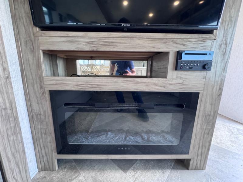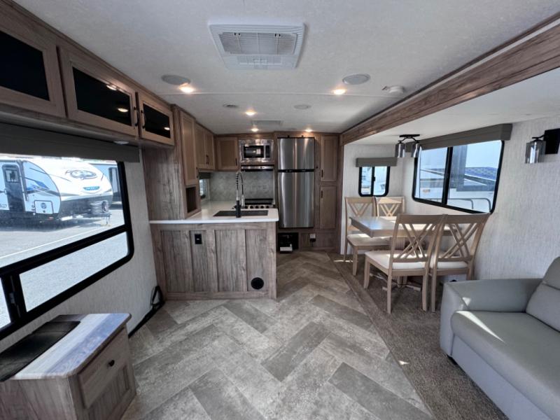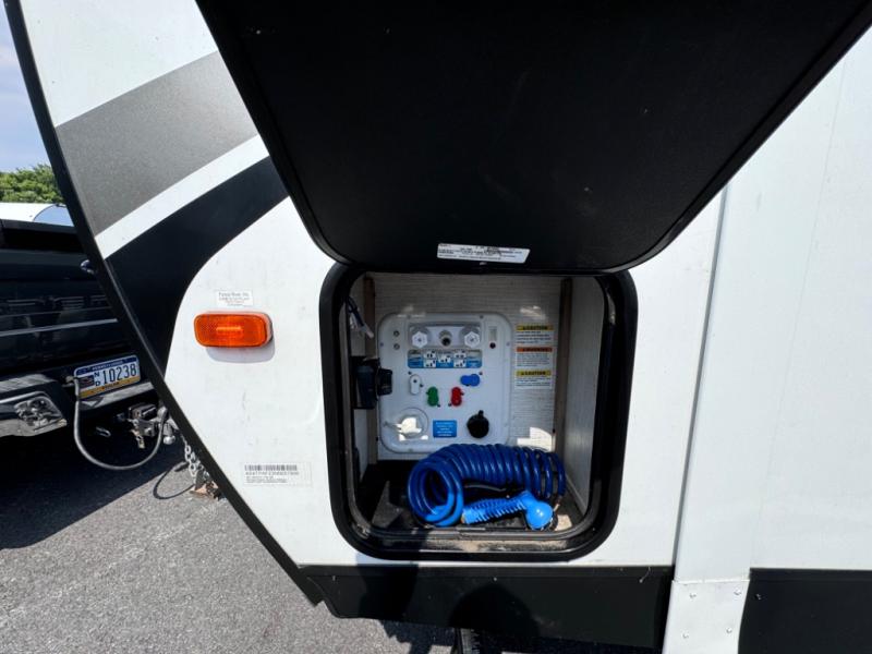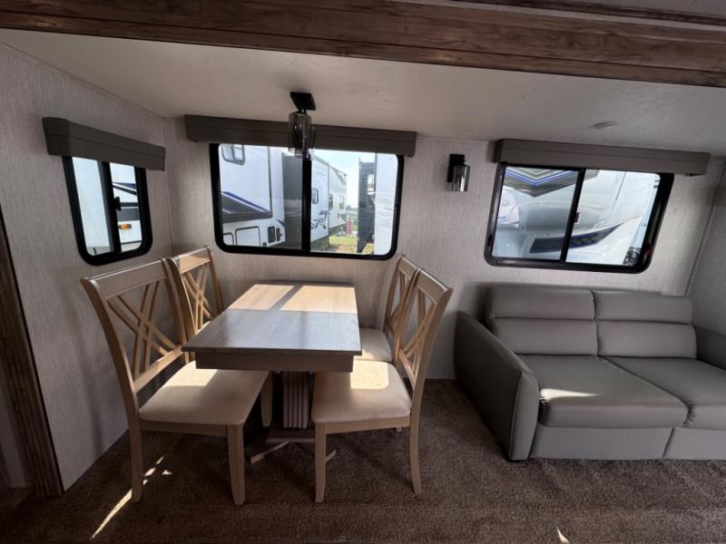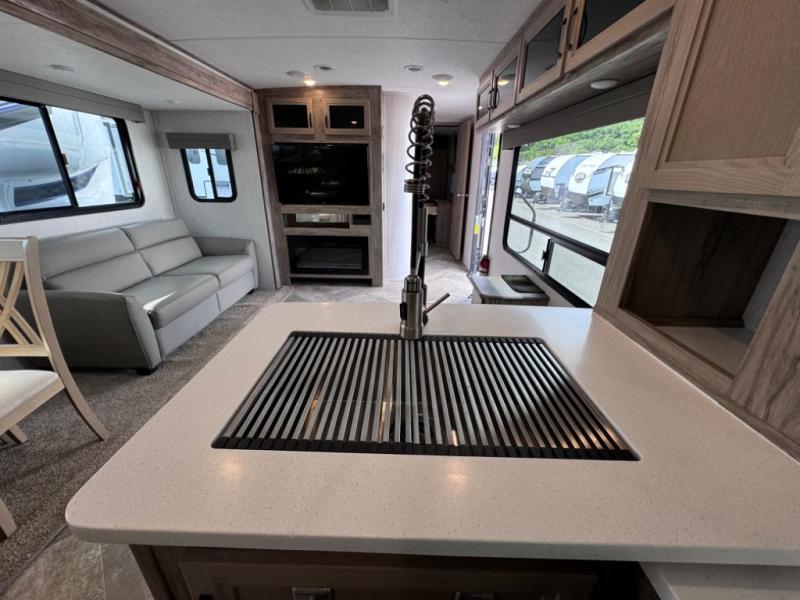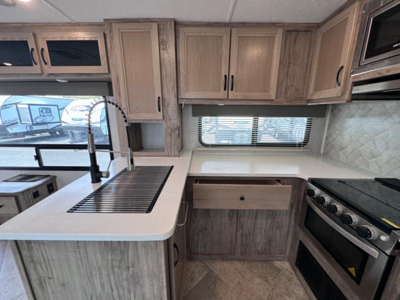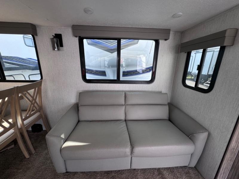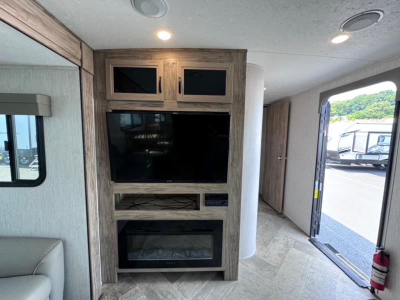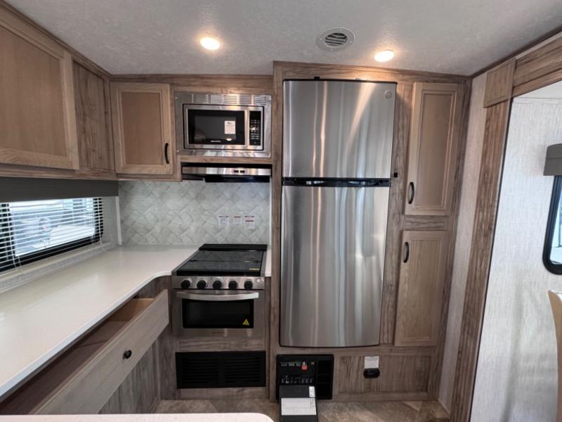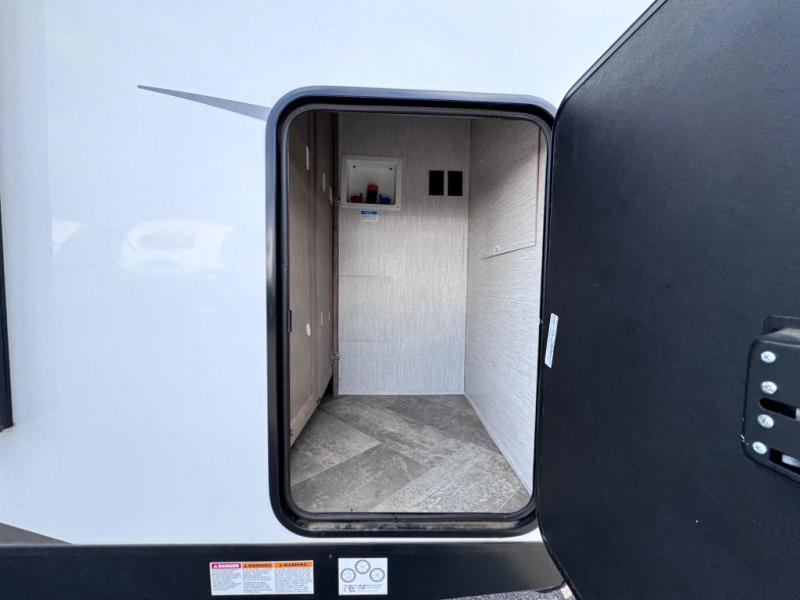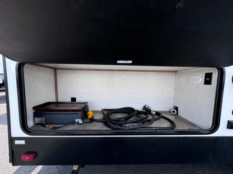 Get ready for lots of relaxation, and spacious living in this trailer when you camp! The rear kitchen offers a pantry, an 11 cu. ft. refrigerator, a microwave, a glass top flush mount range, and a U-shaped counter giving the cook lots of space for meal prep. And there is an outside kitchen for more ways to feed everyone, plus a 20' power awning which provides protection from the elements and creates an outdoor living area. The main area is spacious with a slide out that includes a booth dinette and sofa sleeper or choose the theater seating option, and there are two chairs to relax in as well. The full bathroom offers a shower with a seat, and the front bedroom offers privacy, a slide out king bed, a dresser, a front closet and a wardrobe that includes a washer/dryer prepped area if you decide to add those optional appliances.