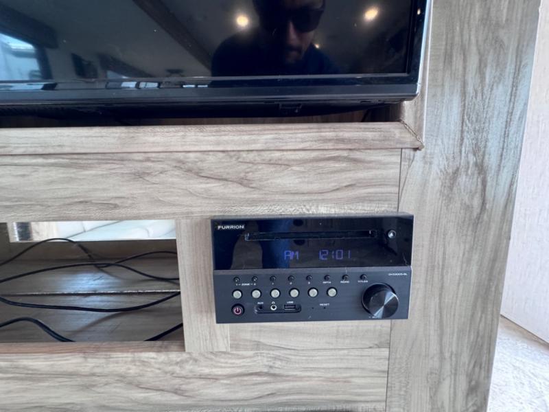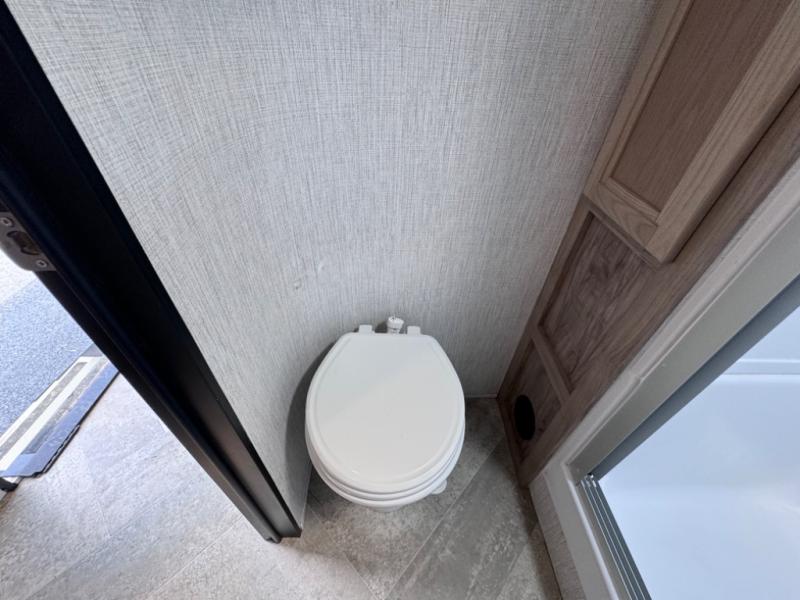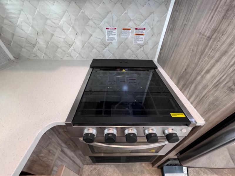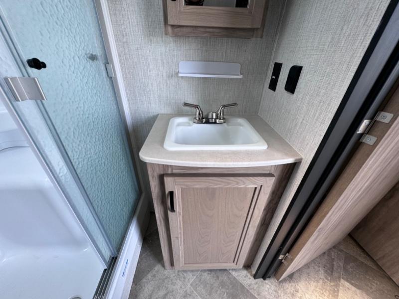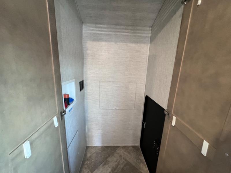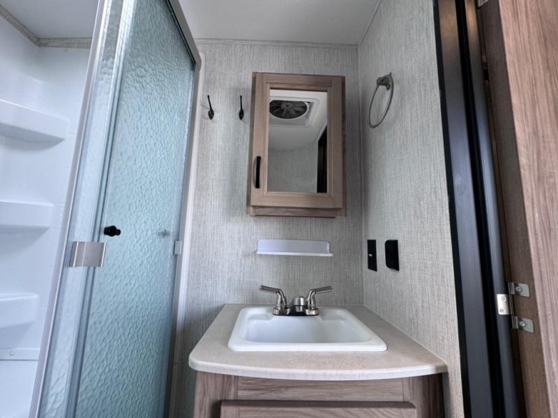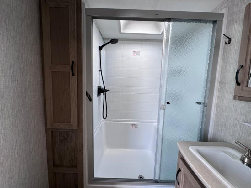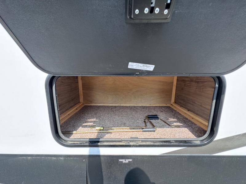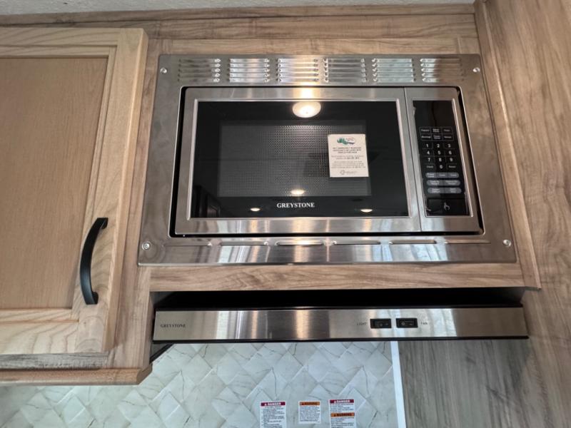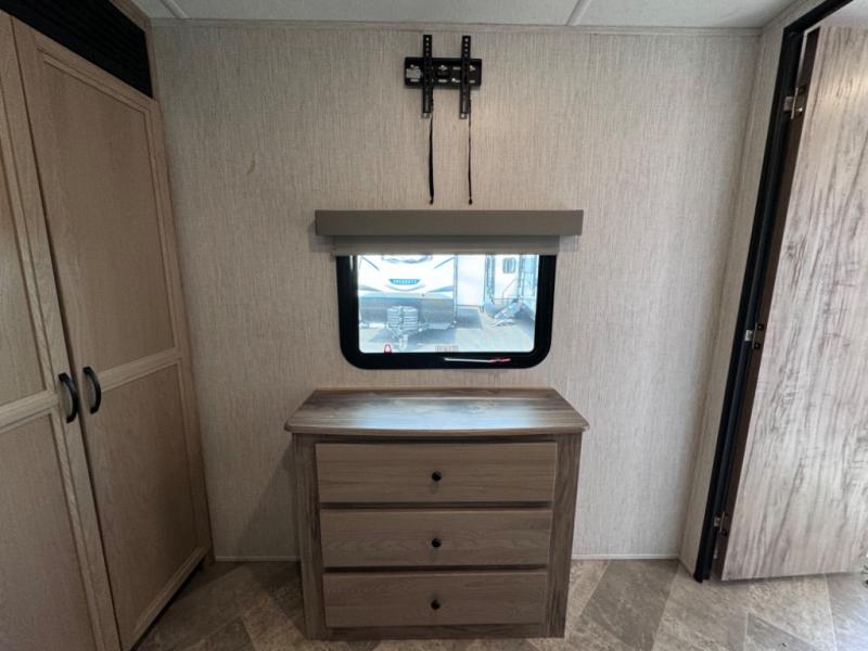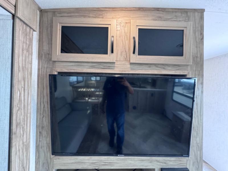 Get ready for lots of relaxation, and spacious living in this trailer when you camp! The rear kitchen offers a pantry, an 11 cu. ft. refrigerator, a microwave, a glass top flush mount range, and a U-shaped counter giving the cook lots of space for meal prep. And there is an outside kitchen for more ways to feed everyone, plus a 20' power awning which provides protection from the elements and creates an outdoor living area. The main area is spacious with a slide out that includes a booth dinette and sofa sleeper or choose the theater seating option, and there are two chairs to relax in as well. The full bathroom offers a shower with a seat, and the front bedroom offers privacy, a slide out king bed, a dresser, a front closet and a wardrobe that includes a washer/dryer prepped area if you decide to add those optional appliances.